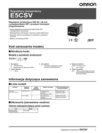 Regulatory temperatury E5CSV Regulatory temperatury DIN 48 x 48 mm z przełącznikiem DIP i prostymi funkcjami programowania. • Łatwe ustawianie za pomocą przełączników DIP i przełączników obrotowych • Wielowejściowy (termopara / oporowy czujnik platynowy) • Wyrazisty cyfrowy wyświetlacz ze znakami o wysokości 13,5 mm • Zgodny z Dyrektywą RoHS Kod oznaczenia modelu ■ Struktura kodu Modele z zaciskami śrubowymi E5CSV-@ 1 T @ -500 1 2 3 4 5 1. Typ wyjścia R: Przekaźnikowe Q: Napięciowe (do sterowania SSR) 2. Liczba alarmów 1: 1 alarm 3. Typ wejścia T: Termopara / platynowy czujnik oporowy (wielowejściowy) 4. Napięcie zasilania Puste: 100–240 V AC D: 24 V AC/DC 5. Osłona zacisków 500: Osłona zapewniająca ochronę przed dotykiem bezpośrednim (ochronę palców) Informacje dotyczące zamawiania ■ Lista modeli Rozmiar 1/16 DIN 48 × 48 × 78 mm Napięcie zasilania 100–240 V AC 24 V AC/DC Liczba punktów alarmowych 1 1 Wyjście sterujące TC/Pt wielowejściowe z osłoną zacisków Przekaźnikowe E5CSV-R1T-500 Napięcie (do sterowania SSR) E5CSV-Q1T-500 Przekaźnikowe E5CSV-R1TD-500 Napięcie (do sterowania SSR) E5CSV-Q1TD-500 ■ Akcesoria (zamawiane osobno) Osłona zabezpieczająca panel czołowy Typ Twarda osłona zabezpieczająca Model Y92A-48B Regulatory temperatury E5CSV 1 Dane techniczne ■ Parametry znamionowe Napięcie zasilania 100–240 V AC, 50/60 Hz Zakres napięcia zasilania 85–110% znamionowego napięcia zasilania 24 V AC/DC, 50/60 Hz Pobór mocy 5 VA Wejście czujnika Modele wielowejściowe z termoparą lub platynowym czujnikiem oporowym: K, J, L, T, U, N, R, Pt100, JPt100 Wyjście sterujące Wyjście przekaźnikowe SPST-NO, 250 V AC, 3 A (obciążenie rezystancyjne) Wyjście napięciowe (do zasilania SSR) 12 V DC, 21 mA (z układem przeciwzwarciowym) 3 VA / 2 W Metoda sterowania ON/OFF lub 2-PID (z funkcją automatycznego dostrajania) Wyjście alarmowe SPST-NO, 250 V AC, 1 A (obciążenie rezystancyjne) Metoda konfigurowania Ustawianie cyfrowe przy użyciu przycisków panelu czołowego (ustawienia funkcji za pomocą przełącznika DIP-Switch) Metoda wyświetlania informacji Cyfrowy, 7-segmentowy wyświetlacz cyfrowy (o wysokości znaku 13,5 mm) ze wskaźnikami odchylenia od wartości zadanej Inne funkcje • Zapobieganie zmianom ustawień (blokada przycisków) • Przesunięcie charakterystyki wejścia • Zmiana jednostek temperatury (°C/°F) • Regulacja grzania/chłodzenia (odwrotna/bezpośrednia) • Przełączanie okresu sterowania • 8 wyjść alarmowych • Wykrywanie błędu czujnika Temperatura otoczenia od –10 do +55°C (bez kondensacji i oblodzenia) Wilgotność otoczenia 25–85% Temperatura składowania od –25 do +65°C (bez kondensacji i oblodzenia) ■ Charakterystyka Dokładność ustawienia Termopara (zob. uwaga 1): Podana dokładność (dla temperatury otoczenia 23°C) Platynowy czujnik oporowy (zob. uwaga 2): Wpływ zmian temperatury (±0,5% wartości wskazanej lub ±1°C w zależności od tego, która wartość jest większa), ±1 cyfra maksymalnie (±0,5% wartości wskazanej lub ±1°C w zależności od tego, która wartość jest większa), ±1 cyfra maksymalnie Wpływ zmian napięcia Wejścia termopary R: Inne wejścia termopary: Wejścia platynowego czujnika oporowego: (±1% wartości PV lub ±10°C w zależności od tego, która wartość jest większa), ±1 cyfra maksymalnie (±1% wartości PV lub ±4°C w zależności od tego, która wartość jest większa), ±1 cyfra maksymalnie Histereza (dla sterowania ON/OFF) 0,1% FS Pasmo proporcjonalne (P) 1–999°C (automatyczna regulacja za pomocą funkcji dostrajania automatycznego/ciągłego) Czas całkowania (I) 1–1999 s (automatyczna regulacja za pomocą funkcji dostrajania automatycznego/ciągłego) Czas różniczkowania (D) 1 do 1999 s (automatyczna regulacja za pomocą funkcji dostrajania automatycznego/ciągłego) Zakres wyjść alarmowych Wartość bezwzględna alarmu: Pozostałe: Histereza alarmu: Okres sterowania 2/20 s Okres próbkowania 500 ms Rezystancja izolacji Min. 20 MΩ (przy 500 V DC) (±1% wartości PV lub ±2°C w zależności od tego, która wartość jest większa), ±1 cyfra maksymalnie taka sama jak dla zakresu sterowania 0–100% FS 0,2°C lub °F (stała) Wytrzymałość dielektryczna 2000 V AC, 50/60 Hz przez 1 min między zaciskami przewodzącymi o różnej biegunowości Odporność na wibracje Wadliwe działanie 10–55 Hz, 20 m/s2, przez 10 min, każdorazowo w kierunkach X, Y i Z Zniszczenie 10–55 Hz, pojedyncza amplituda 0,75 mm, przez 2 h, każdorazowo w kierunkach X, Y i Z Wadliwe działanie Min. 100 m/s2, 3 razy, każdorazowo w 6 kierunkach Zniszczenie Min. 300 m/s2, 3 razy, każdorazowo w 6 kierunkach Elektryczna Co najmniej 100 000 operacji (modele z wyjściem przekaźnikowym) Odporność na wstrząsy Trwałość przewidywana Ciężar Ok. 120 g (sam regulator) Stopień ochrony Panel czołowy: odpowiednik IP66; obudowa tylna: IP20; zaciski: IP00 Zabezpieczenie pamięci EEPROM (pamięć trwała) (liczba możliwych zapisów: 1 000 000) EMC Zakłócenia EMI emitowane: Zakłócenia EMI przewodzone: Odporność ESD: Odporność na promieniowanie pola elektromagnetycznego: Odporność na zakłócenia przewodzone: Odporność na zakłócenia (przebiegi nieustalone): Odporność na impulsy: Odporność na przepięcia: Odporność na spadek/przerwanie napięcia: EN 55011 grupa 1, klasa A EN 55011 grupa 1, klasa A EN 61000-4-2: wyładowanie kontaktowe 4 kV (poziom 2) wyładowanie w powietrzu 8 kV (poziom 3) EN 61000-4-3: 10 V/m (80–1000 MHz, 1,4–2,0 GHz modulowane amplitudowo) (poziom 3) 10 V/m (900 MHz, modulowane impulsowo) EN 61000-4-6: 3 V (0,15–80 MHz) (poziom 2) EN 61000-4-4 Linia zasilania 2 kV (poziom 3), liniowy sygnał We/Wy 1 kV (poziom 3) EN 61000-4-5: Linia zasilania: tryb normalny 1 kV; tryb zwykły 2 kV Linia wyjścia (wyjście przekaźnikowe): tryb normalny 1 kV; tryb zwykły 2 kV EN 61000-4-11, 0,5 cyklu, 1