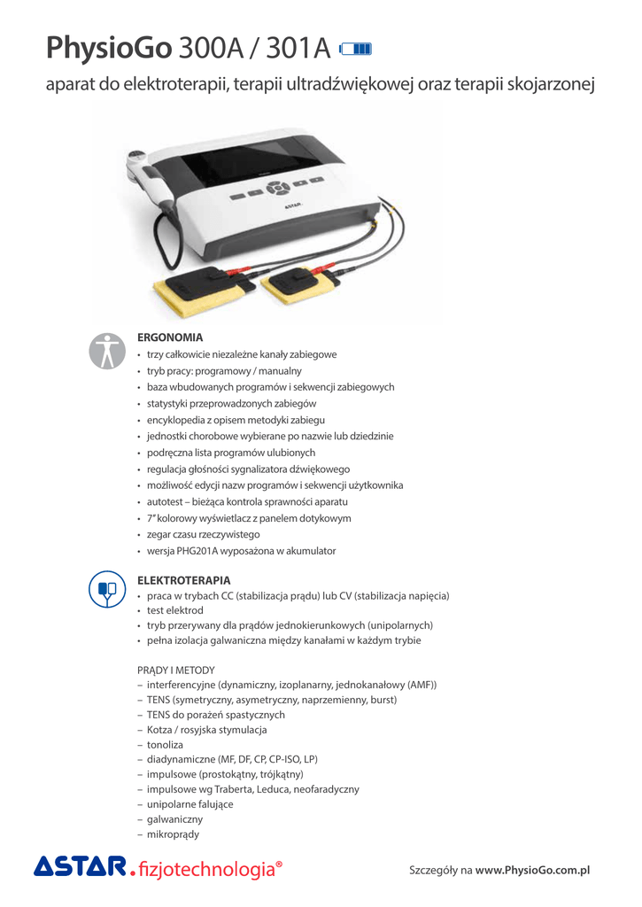 PhysioGo 300A / 301A aparat do elektroterapii, terapii ultradźwiękowej oraz terapii skojarzonej ERGONOMIA • trzy całkowicie niezależne kanały zabiegowe • tryb pracy: programowy / manualny • baza wbudowanych programów i sekwencji zabiegowych • statystyki przeprowadzonych zabiegów • encyklopedia z opisem metodyki zabiegu • jednostki chorobowe wybierane po nazwie lub dziedzinie • podręczna lista programów ulubionych • regulacja głośności sygnalizatora dźwiękowego • możliwość edycji nazw programów i sekwencji użytkownika • autotest – bieżąca kontrola sprawności aparatu • 7’’ kolorowy wyświetlacz z panelem dotykowym • zegar czasu rzeczywistego • wersja PHG201A wyposażona w akumulator ELEKTROTERAPIA • praca w trybach CC (stabilizacja prądu) lub CV (stabilizacja napięcia) • test elektrod • tryb przerywany dla prądów jednokierunkowych (unipolarnych) • pełna izolacja galwaniczna między kanałami w każdym trybie PRĄDY I METODY – interferencyjne (dynamiczny, izoplanarny, jednokanałowy (AMF)) – TENS (symetryczny, asymetryczny, naprzemienny, burst) – TENS do porażeń spastycznych – Kotza / rosyjska stymulacja – tonoliza – diadynamiczne (MF, DF, CP, CP‐ISO, LP) – impulsowe (prostokątny, trójkątny) – impulsowe wg Traberta, Leduca, neofaradyczny – unipolarne falujące – galwaniczny – mikroprądy Szczegóły na www.PhysioGo.com.pl ELEKTRODIAGNOSTYKA • elektrodiagnostyka z graficzną prezentacją krzywej I/t • automatyczne przeliczanie reobazy, chronaksji, współczynnika i ilorazu akomodacji TERAPIA ULTRADŹWIĘKOWA • częstotliwość pracy 1 MHz/ 3,5 MHz • efektywna powierzchnia promieniowania 1 cm2 i 4 cm2 • emisja ciągła – efekt termiczny • emisja impulsowa – mikromasaż • kontrola przylegania czoła głowicy sprzężona z zegarem zabiegowym • precyzyjna kontrola emisji fali ultradźwiękowej w trakcie zabiegu • kalibracja czułości głowicy według potrzeb • automatyczna kontrola emitowanej mocy TERAPIA SKOJARZONA • • • • • • • • • praca w trybach CC (stabilizacja prądu) lub CV (stabilizacja napięcia) częstotliwość pracy 1 MHz/ 3,5 MHz efektywna powierzchnia promieniowania 1 cm2 i 4 cm2 emisja ciągła – efekt termiczny emisja impulsowa – mikromasaż kontrola przylegania czoła głowicy sprzężona z zegarem zabiegowym precyzyjna kontrola emisji fali ultradźwiękowej w trakcie zabiegu kalibracja czułości głowicy według potrzeb automatyczna kontrola emitowanej mocy PRĄDY I METODY – interferencyjne (dynamiczny, izoplanarny, jednokanałowy (AMF)) – TENS (symetryczny, asymetryczny, naprzemienny, burst) – Kotza / rosyjska stymulacja TRYB MANUALNY pełna kontrola nad parametrami zabiegowymi dla zaawansowanych użytkowników PROGRAMY ZABIEGOWE • uproszczenie obsługi aparatu • 204 wbudowanych programów zabiegowych • 150 programów do ustawienia dla użytkowników • 204 programów ulubionych • nadawanie własnych nazw programom SEKWENCJE ZABIEGOWE • uproszczona obsługa aparatu • 38 wbudowanych sekwencji zabiegowych dla elektroterapii • 10 sekwencji dla elektroterapii do ustawienia dla użytkowników • nadawanie własnych nazw sekwencjom Szczegóły na www.PhysioGo.com.pl PARAMETRY TECHNICZNE • • • • • • • • sterownik – maks. natężenie prądu w obwodzie pacjenta (tryb CC) – galwaniczne 40 mA – diadynamiczne, impulsowe 60 mA – interferencyjne, Kotza, unipolarne falujące 100 mA – TENS 140 mA – tonoliza 100 mA – mikroprądy 1000 µA maks. amplituda napięcia w obwodzie pacjenta (tryb CV) 140 V maks. natężenie fali ultradźwiękowej w trybie ciągłym / impulsowym 2 / 3 W/cm2 częstotliwość w trybie impulsowym 16 Hz, 48 Hz, 100 Hz wypełnienie w trybie impulsowym 5 – 75 %, krok 5 % zasilanie, pobór mocy 230 V, 50/60 Hz, max 75W, 90VA wymiary 34 x 28 x 11‐16 masa 6 kg WYPOSAŻENIE STANDARDOWE • przewód sieciowy • kable pacjenta (2 szt.) • elektrody do elektroterapii 6 x 6 cm (4 szt.); 7,5 x 9 cm (2 szt.) • pokrowce wiskozowe do elektroterapii 6 x 6 cm (8 szt.); 7,5 x 9 cm (4 szt.) • pasy rzepowe 40 x 10 cm (2 szt.); 100 x 10 cm (2 szt.) • żel do ultradźwięków 500 g (1 szt.) • bezpieczniki zapasowe WTA‐T 1 A/250 V (2 szt.) • rysik pojemnościowy do ekranu LCD (1 szt.) • ścierka do ekranu LCD (1 szt.) • nakładki maskujące z wycięciem (2 szt.) WYPOSAŻENIE OPCJONALNE • elektrody samoprzylepne 3 x 4 cm; 5,5 x 5,5 cm; 5,5 x 12,5 cm • elektrody punktowe 6 mm, 10 mm, 15 mm, 20 mm • złącze typu krokodylek • woreczek z piaskiem 21 x 14 cm, 21 x 28 cm • głowica 1/ 3,5 MHz, 1 cm2 z uchwytem • głowica 1/ 3,5 MHz, 4 cm2 z uchwytem • wyłącznik pacjenta • torba mieszcząca aparat wraz z wyposażeniem • stolik Elf X • akumulator Szczegóły na www.PhysioGo.com.pl