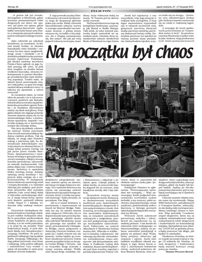 Strona 16 www.gazetagazeta.com piątek-niedziela, 25 - 27 listopada 2011 FELIETON ...A potem tak już zostało. Szczególnie w Montrealu, gdzie koszmar permanentnych robót drogowych ani słowo nie opowie, ani pióro nie opisze, gdzie nad gehenną kierowców zapłakałby rzewnymi łzami sam Dante, a cierpienia pieszych nabierają iście szekspirowskiego wymiaru. Jako człowiek po szkołach kształcony, ja rozumiem, że klimat mamy trudny, że okrutna kanadyjska zima miażdży i wywraca na nice nasze magistrale, drogi, szosy i chodniki i że te drańskie pułapki trzeba systematycznie reperować. Pamiętam, jak kiedyś ambitny burmistrz Pointe-Claire ogłosił, że jego ludzie pracują tak ostro, że jeśli ktoś znajdzie na drodze dziurę wielkości kurczaka, otrzyma rekompensatę w postaci dorodnego przedstawiciela tejże drobiowej populacji. Trzeba trafu, że akurat burza przetrzepała miasto i taki jeden, co spać nie mógł, znalazł dziurę wielkości owcy i o takową się upomniał, a nawet otrzymał! Ja rozumiem także, że świat idzie do przodu i że w tak nowoczesnym państwie jak Kanada, infrastruktura rozrasta się jak bohaterska przeszłość agenta Tomka i że każdemu obywatelowi należy się dach nad głową. Więc gdzie okiem nie sięgnąć potężne żurawie dumnie prężą się na tle montrealskiego nieba, a niestrudzone spychacze, koparki i wywrotki uwijają się w mrówczym trudzie dla naszego dobra. Nie ciesz się jednak, człowieku naiwny! Zanim powstanie dom twoich marzeń poddany będziesz ciężkim próbom. Tak się składa, że mogę zdać Państwu relację z pierwszej ręki, bo doświadczam dobrodziejstw rozwoju miasta na własnej skórze. Z mojej tylnej prawej rozwija się jak pożar prerii osiedle BoisFranc. Apartamentowce i townhousy strzelają w górę jak sylwestrowy szampan, chłopcy stosują bowiem sprawdzone, niezawodne metody stachanowskie. Gdy jedna ekipa ryje i wylewa fundamenty, fachowcy w sąsiednim bloku stawiają ściany, kolejny oplatują siecią instalacji i rur, jeszcze dalej cackają się z wykończeniówką. W następnym domu lokatorzy nastawiają rosół i trzepią dywaniki, a w ostatnim zbierają już podpisy pod protestem przeciwko zbyt wysokim opłatom. I tak coraz dalej i dalej w kierunku zachodzącego słońca. Z mojej tylnej lewej, oprócz serii domów, postawili właśnie wielki "Super C" i klinikę, widocznie żeby uniknąć monotonii. Oczywiście niezbędnym elementem budowy każdego obiektu jest solidne rozkopanie ulicy. Bo to przyszłym użytkownikom różne fanaberie do głowy przychodzą: a to im woda potrzebna, a to prąd by się przydał. Więc budowniczy kopią, w tych okopach kładą rury kanalizacyjne i zasypują żwirkiem. Po paru tygodniach odkopują i łączą jakieś kable. Zasypują. Odkopują i dodają jakieś przewodyoraz druty izakopują, żeby potem odkopać i zainstalować rury wodne. I apiać od początku to samoprzy każdym nowymbudynku. Z tego powodu na ulicy Henri Bourassa od trzech lat kierowcy mają do dyspozycji głównie jeden pas ruchu. Kiedy człowiek nieoczekiwanie zobaczy wyrwę w szeregu samochodów ma mieszane uczucia: z jednej strony cieszysz się, że trafiło ci się miejsce, ale z drugiej zastanawiasz się, kto umarł. Ale jak już twój pojazdwskoczy na ten pas, masz diony, teraz widocznie kolej na mosty. W Toronto już by dawno armię wezwali. Na Decarie kierowca czuje się kompletnie bezbronny, zaszczuty jak liberał w Radiu Maryja. Taki ścisk, że żeby zmienić pas, trzeba kupić samochód na sąsiednim pasie. Ostatnio dwaj zamaskowani rabusie obrabowali Bank of Montreal na rogu Green Jurek był najstarszy z nas wszystkich, więc jego pozycja w rodzinie była szczególna. Z racji tegoż starszeństwa wyprzedzał nas w różnych życiowych osiągnięciach: pierwszy skończył studia, pierwszy ożenił się, pierwszy dostarczył światu córkę. Naturalnie pierwszy też wjechał na wyższy poziom stanu posiadania. Samochodem wjechał, oczy- ce rwało się na strzępy... Zarówno owa zdumiewająca kraksa jak i Jurkowe męstwo zachowały się na wieki w rodzinnej legendzie. A wracając do teorii spiskowych, ja też uważam, że "Cui prodest scelus is fecit". Zaprzetworzeniem Montrealu w jeden wielki plac budowy stoją producenci tych biało-pomarańczowych Na początku był chaos dodatkowe udogodnienie: możesz zmienić opony na zimowe, nie tracąc swojego miejsca w szeregu. No i sumienie kierowca ma czyste, nie naruszając zaleceń Opatrzności i jej najwyższego autorytetu, który z troską nas przecież instruuje: "Jedź ostrożnie. Ja poczekam. Pan Bóg". Ale to w sumie drobnica, w porównaniu z reperowanym od trzech lat Mercier Bridge. Należało mu się, bo ostatni remont miał miejsce w 1934 roku. No i ci dopiero kazali nam przez kij skakać, zamykając odcinki mostu albo całe linie! Myślelismy, że już nic gorszego nas spotkać nie może, aż tu katastrofa: Champlain Bridge, nasze połączenie z Ameryką i Nowym Jorkiem, rozpada się i żaden remont mu nie pomoże, trzeba będzie go rozebrać i zbudować od nowa. Potem pewnie przyjdzie kolej na Jacques Cartier Bridge i Victoria - tak że wszystkie drogi ucieczki z wyspy zostaną odcięte. Waliły nam się już drogi, wiadukty, sta- i Maisonneuve i odjechali z piskiem opon. Utknęli jednak w takim korku, że pracownik banku dogonił ich na rowerze, zeby bandytom mordy obić i łup odebrać. Oczywiście wszyscy mamy swoje spiskowe teorie, tłumaczące skumulowanie wszystkich możliwych prac budowlanych, konstrukcyjnych i drogowych w tym samym miejscu i czasie. Jedni mówią, że to intrygi producentów materiałów budowlanych, inni, że zwiazków zawodowych walczących o nadgodziny, jeszcze inni podejrzewają machinacje mechaników samochodowych. Faktycznie, na samych stłuczkach w Montrealu fortunę można zbić. Stłuczka w trafiku toż to banalna codzienność. Ale zdarzają się stłuczki nietuzinkowe, wysmakowane, wręcz artyst