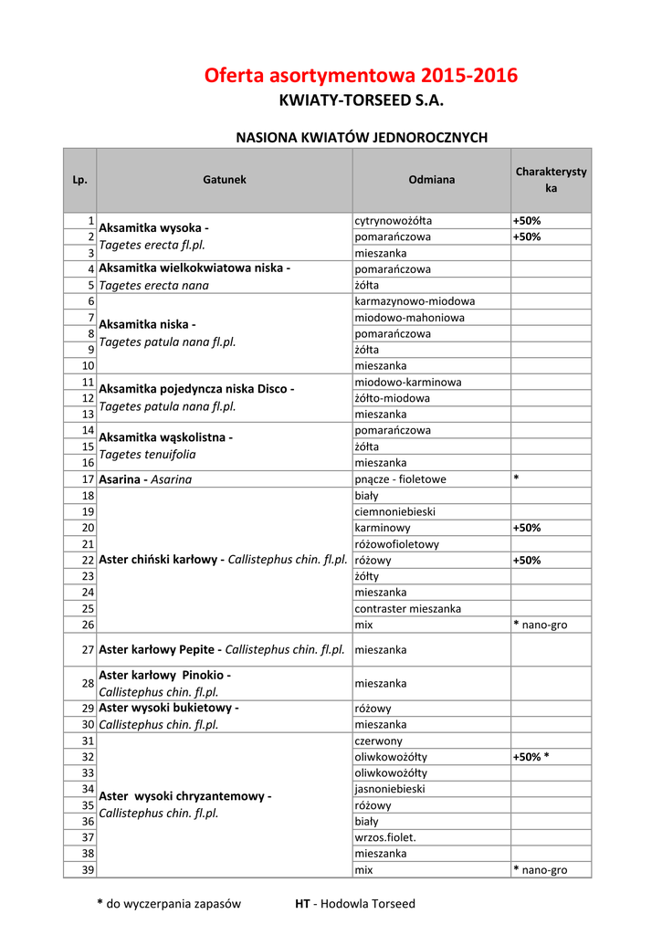 Oferta asortymentowa 2015-2016 KWIATY-TORSEED S.A. NASIONA KWIATÓW JEDNOROCZNYCH Lp. 1 2 3 4 5 6 7 8 9 10 11 12 13 14 15 16 17 18 19 20 21 22 23 24 25 26 Gatunek Odmiana cytrynowożółta pomarańczowa mieszanka Aksamitka wielkokwiatowa niska pomarańczowa żółta Tagetes erecta nana karmazynowo-miodowa miodowo-mahoniowa Aksamitka niska pomarańczowa Tagetes patula nana fl.pl. żółta mieszanka miodowo-karminowa Aksamitka pojedyncza niska Disco żółto-miodowa Tagetes patula nana fl.pl. mieszanka pomarańczowa Aksamitka wąskolistna żółta Tagetes tenuifolia mieszanka pnącze - fioletowe Asarina - Asarina biały ciemnoniebieski karminowy różowofioletowy Aster chiński karłowy - Callistephus chin. fl.pl. różowy żółty mieszanka contraster mieszanka mix Aksamitka wysoka Tagetes erecta fl.pl. Charakterysty ka +50% +50% * +50% +50% * nano-gro 27 Aster karłowy Pepite - Callistephus chin. fl.pl. mieszanka Aster karłowy Pinokio Callistephus chin. fl.pl. 29 Aster wysoki bukietowy 30 Callistephus chin. fl.pl. 28 mieszanka 31 32 33 34 Aster wysoki chryzantemowy 35 Callistephus chin. fl.pl. 36 37 38 39 różowy mieszanka czerwony oliwkowożółty oliwkowożółty jasnoniebieski różowy biały wrzos.fiolet. mieszanka mix * do wyczerpania zapasów HT - Hodowla Torseed +50% * * nano-gro Lp. Gatunek Odmiana 40 41 42 43 44 45 Aster wysoki igiełkowy 46 Callistephus chin. fl.pl. 47 48 49 50 51 52 53 54 55 56 57 58 59 60 61 62 63 64 65 66 67 68 69 70 71 72 73 74 75 76 77 biały ciemnofioletowy czerwonołososiowy czerwony łososioworóżowy niebieski różowy śliwkowoamarantowy lila wiśniowoamarantowy żółty mieszanka mix Aster wysoki igiełkowy typ Igel Callistephus chin. fl.pl. +50% +50% * nano-gro mieszanka biały niebiesko-fioletowy purpurowowiśniowy różowopurpurowy różowy żółty mieszanka biało-różowy biały ciemnofioletowy łososioworóżowy karminowy żółty różowopurpurowy +50% purpurowowiśniowy różowy mieszanka mix * nano-gro białoniebieski białoczerwony mieszanka biały grzebieniasta (cristata), miesz. pierzasta (plumosa), mieszanka +50% Aster wysoki książęcy Callistephus chin. fl.pl. Aster wysoki piwoniowy Callistephus chin. fl.pl. Aster pomponowy Callistephus chin. fl.pl. Bieluń - Datura Celozja - Celosia argentea 78 Chaber jednoroczny Centaurea moschata mieszanka 79 Chaber bławatek - Centaurea cyanus 80 Chmiel japoński - Humulus scandens 81 82 83 84 Cynia wytworna daliowa 85 mieszanka pnącze - zielone czerwona ciemnoczerwona ciemnoczerwona żółta żółta Zinnia elegans fl.pl. * do wyczerpania zapasów Charakterysty ka HT - Hodowla Torseed +50% * +50% * Lp. 86 87 88 89 Gatunek Odmiana Cynia wytworna daliowa Zinnia elegans fl.pl. łososioworóżowa pomarańczowa biała mieszanka Cynia wytworna chryzantemowa Zinnia elegans fl.pl. 91 Cynia pomponowa - Zinnia elegans fl.pl. 90 mieszanka +50% mieszanka +50% 92 Cynia meksykańska - Zinnia elegans fl.pl. mieszanka 93 Czarnuszka - Nigella damascena mieszanka 94 Czarnuszka orientalna - Nigella orientale żółta 95 Czubatka ubiorkolistna Brachycome iberidifolia mieszanka 96 Dalia zmienna - Dahlia pinnata 97 pojedyncza mieszanka pełna i półpełna mieszanka 98 Driakiew purpurowa - Scabiosa atropurp. mieszanka 99 100 101 102 103 104 105 106 107 108 109 110 Driakiew gwiaździsta - Scabiosa stellata Dmuszek - Lagurus ovatus Dynia ozdobna - Cucurbita pepo Dzierotka - Clarkia elegans Dziwaczek - Mirabilis jalapa Dzwony irlandzkie - Molucella laevis Facelia dzwonkowata Phacelia campanularia Fasola ozdobna - Phaseolus coccineus Floks karłowy Phlox drummondii compacta nana Gazania - Gazania rigens Gilia główkowa - Gilia capitata 111 112 113 Gipsówka - Gypsophila elegans 114 115 116 Godecja - Godetia grandiflora 117 118 Goździk chiński - Dianthus chinensis Goździk Chabaud Dianthus caryoph. Chabaud 120 Groszek pachnący - Lathyrus odoratus 121 Kapusta ozdobna - Brassica oleracea Kardiospermum 122 Cardiospermum halicacabum 119 * do wyczerpania zapasów Charakterysty ka beżowo-zielona beżowy mieszanka Turecki Turban różowa szkarłatna mieszana mieszanka zielone +50% * lazurowo - niebieska mieszanka mieszanka mieszanka - nasiona otarte niebieskofioletowa biała różowa biała karminowoszkarłatna mieszanka mieszanka mieszanka mieszanka kolorowe, "fryzowane" liście zielone HT - Hodowla Torseed +50% Lp. 123 124 125 126 127 128 129 130 131 132 133 134 135 136 137 138 139 140 141 142 Gatunek Odmiana Kartamus - Carthamus Kleoma ciernista - Cleome spinosa Kobea pnąca - Cobaea scandens Kocanka - Helichrysum bract.-monstr. Kraspedia - Craspedia globosa Kroplik - Mimulus Kukurydza ozdobna - Zea japonica Laja - Layia platyglossa Lak pospolity - Cheiranthus cheiri Leptosifon - Leptosiphon hybr. Lewkonia letnia Matthiola incana annua Excelsior Lewkonia letnia Matthiola incana annua Excelsior Lewkonia letnia 143 Matthiola incana annua Varsovia Lewkonia wielopędowa 144 Matthiola incana annua 145 Limnantes - Limnanthes douglasii 146 147 148 149 150 151 152 153 154 155 156 157 158 159 160 161 162 163 164 165 166 167 Lobelia zwisająca - Lobelia pendula Lonas - Lonas inodora Lwia paszcza - Antirrhinum majus max. Lwia paszcza niska - Antirrhinum majus max. Łubin Hartwega - Lupinus Hartwegii Maczek kalifornijski - Eschscholtzia calif. * do wyczerpania zapasów * +50% mieszanka Lobelia - Stroiczka - Lobelia er. Comp Mak polny - Papaver rhoeas Mak pełny - Papaver peonioflorum Malope - Malope pomarańczowy różowa biała fioletowa mieszanka żółta mieszanka mieszanka żółte z białym brzegiem mieszanka mieszanka biała liloworóżowa różowa jasnożółta ciemnośliwkowa pomarańczowo - cielista wiśniowoamarantowa wiśniowowrzosowa mieszanka mieszanka kolorów o błyszczących liściach Charakterysty ka żółte z białym biała czerwona jasnoniebieska modrofioletowa różowa czerwona niebieska mieszanka żółty biała ceglasta ciemnokarminowa różowa żółta mieszanka mieszanka mieszanka mieszanka czerwony - Wis