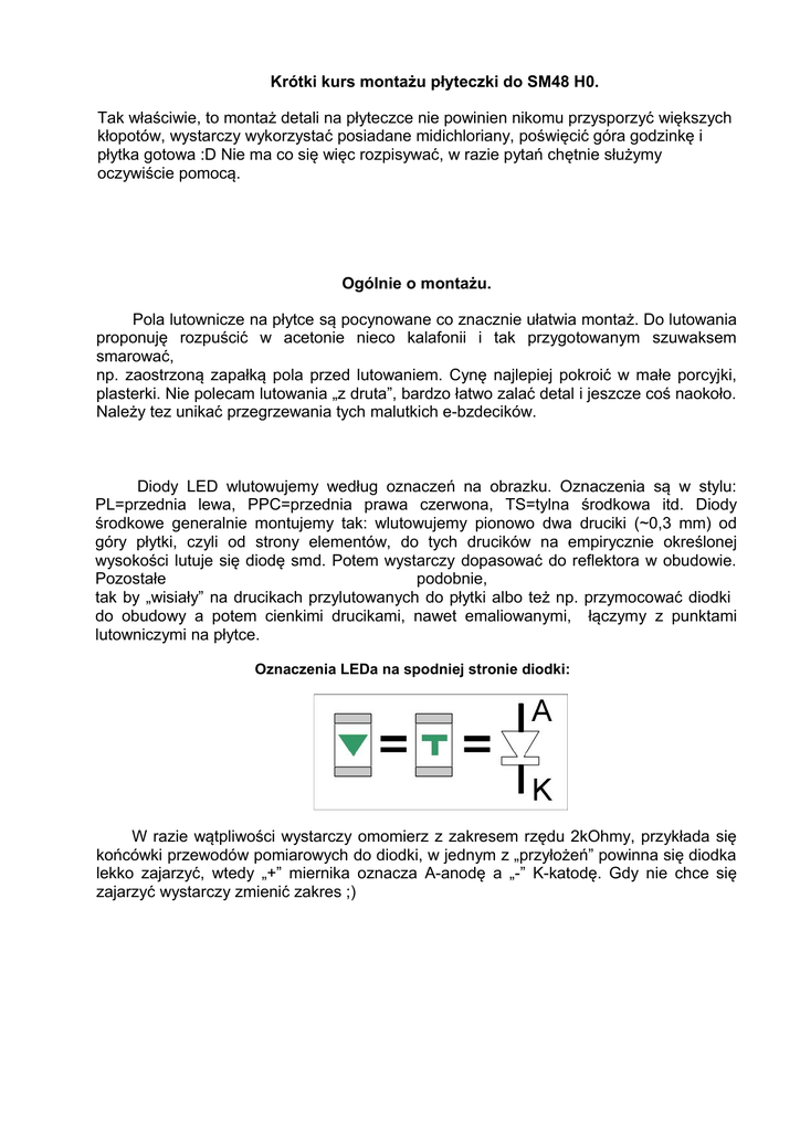 Krótki kurs montażu płyteczki do SM48 H0. Tak właściwie, to montaż detali na płyteczce nie powinien nikomu przysporzyć większych kłopotów, wystarczy wykorzystać posiadane midichloriany, poświęcić góra godzinkę i płytka gotowa :D Nie ma co się więc rozpisywać, w razie pytań chętnie służymy oczywiście pomocą. Ogólnie o montażu. Pola lutownicze na płytce są pocynowane co znacznie ułatwia montaż. Do lutowania proponuję rozpuścić w acetonie nieco kalafonii i tak przygotowanym szuwaksem smarować, np. zaostrzoną zapałką pola przed lutowaniem. Cynę najlepiej pokroić w małe porcyjki, plasterki. Nie polecam lutowania „z druta”, bardzo łatwo zalać detal i jeszcze coś naokoło. Należy tez unikać przegrzewania tych malutkich e-bzdecików. Diody LED wlutowujemy według oznaczeń na obrazku. Oznaczenia są w stylu: PL=przednia lewa, PPC=przednia prawa czerwona, TS=tylna środkowa itd. Diody środkowe generalnie montujemy tak: wlutowujemy pionowo dwa druciki (~0,3 mm) od góry płytki, czyli od strony elementów, do tych drucików na empirycznie określonej wysokości lutuje się diodę smd. Potem wystarczy dopasować do reflektora w obudowie. Pozostałe podobnie, tak by „wisiały” na drucikach przylutowanych do płytki albo też np. przymocować diodki do obudowy a potem cienkimi drucikami, nawet emaliowanymi, łączymy z punktami lutowniczymi na płytce. Oznaczenia LEDa na spodniej stronie diodki: W razie wątpliwości wystarczy omomierz z zakresem rzędu 2kOhmy, przykłada się końcówki przewodów pomiarowych do diodki, w jednym z „przyłożeń” powinna się diodka lekko zajarzyć, wtedy „+” miernika oznacza A-anodę a „-” K-katodę. Gdy nie chce się zajarzyć wystarczy zmienić zakres ;) Montaż elektroniki. Najpierw rozcinamy płytki wg obrazka: Część z LEDami powinna mieć szerokość nie większą niż 19,8 mm oraz wysokość < 2,9 mm, aby płyteczka zmieściła się w przeznaczonym dla niej miejscu, trzeba sobie płyteczki dopasować do swojej konstrukcji. Przewidzieliśmy 2 warianty wykonania oświetlenia: • Wariant 1, który pozwala wyświetlić światła 3 białe, manewrowe oraz osobno załącza/wyłącza czerwone, dodatkowo zostaje jedno wolne wyjście FA2 do np. oświetlenia kabiny. • Wariant 2, oprócz świateł jw. pozwala wyświetlić światła postojowe -2 białe, jednak tu nie zostaje wolnych wyjść. Uwaga: odpowiednie ścieżki na płytce w każdym przypadku należy rozciąć, w przeciwnym przypadku na pewno powstanie zwarcie, co w najgorszym przypadku może doprowadzić do uszkodzenia dekodera! Oczywiście standardowo zakładamy zastosowanie do jazdy dekoderów Zimo, np. MX630 lub 631, które posiadają oprócz wyjść do oświetlenia jeszcze 4 „normalne” wyjścia funkcyjne. Zastosowanie któregoś z dźwiękowych dekoderów od Zimo, np. MX642, 645 lub 646 jest jak najbardziej możliwe, posiadają one oprócz „normalnych” wyjść funkcyjnych dodatkowe wyjścia, umożliwiające bezpośrednie podłączenie diody LED. Wariant 1. Należy rozciąć ścieżki według obrazka, miejsca rozcięć oznaczono czerwonymi krzyżykami: Wygodnie jest to robić następująco: zrobić dwa nacięcia na ścieżce w odległości ~2 mm od siebie i usunąć zbędną miedź z wewnątrz. Kreski w kolorach NMRA-owskich i odpowiednio opisane oznaczają miejsca dolutowania kabelków z dekodera. Jedynie wyjścia FA3 i 4 są… inne, gdyż nie są to wyjścia ujęte w normach, kolory mogą być zupełnie dowolne. Punkty lutownicze oznaczone „+” to oczywiście plus zasilania, zaś opisane PP=przednia prawa, TS=tylna środkowa czy CZT=czerwona tylnie. Rozmieszczenie elementów na płytce, umownie są one na dole płytki: Jedynym dodatkowym detalem jest połączenie drucikiem punktów oznaczonych niebieską kreseczką, czemuś zabrakło ścieżki w tym miejscu Do opornika opisanego 432* podłączamy dodatkowe obciążenie uruchamiane klawiszem F2, np. do oświetlenia kabiny, jeżeli ktoś wybierze ten wariant a nie potrzebuje dodatkowego wyjścia to tego opornika oczywiście nie montuje. Cefałkologia. W tym przypadku jest bardzo prosta, wystarczy odpowiednio zaprogramować działanie wyjść funkcyjnych FA3 i 4: CV129=2 -> FA3 działa w tył, CV130=1 -> FA4 działa w przód. Oczywiście zachowujemy ustawienia, aby klawisz F1 uruchamiał wyjście FA1: CV35=4, a klawisz F2 uruchamiał FA2: CV36=8. Teraz można wybrać klawisz, pod którym będą włączane czerwone: F3: CV37=6, CV38=0 F4: CV37=0, CV38=6 F5: CV37=0, CV38=0, CV39=6 F6: CV37=0, CV38=0, CV40=6 Wybiera się tylko jedną z możliwości! Wariant 2. Ścieżki na płytce rozcinamy po obu stronach, według rysunków, także pokazane jest rozmieszczenie elementów w tym przypadku: Cefałkologia. CV-ki dla wyjść FA3 i 4 są identyczne jak w „Wariancie 1”, podobnie CV dla wyjść FA1 i FA2 pozostają takie same. W zasadzie mogą być dwie możliwości wyświetlenia świateł postojowych: • zapalenie ich klawiszem F2: CV33=9, CV34=10, CV35=4, CV36=3, CV125=1, CV126=2 • lub przy załączonych pociągowych wygaszenie świateł środkowych, a raczej zapalenie ich, czyli światła pociągowe (3 białe) włączamy dwoma klawiszami F0 i F2: CV33=1, CV34=2, CV35=4, CV36=8, CV125=0, CV126=0, czyli tak naprawdę, jeżeli nic nie grzebaliśmy wcześniej w tych ustawieniach, po prostu pozostawiamy je bez zmian Połączenia na płytce z diodkami LED. Diody LED wlutowujemy anodą w kierunku ścieżki ‘wspólnej” czyli „+”. Jedynie to, że punkty od diod czerwonych trzeba połączyć ze sobą, może to ciut… niefachowe ale diodki te połączone są równolegle, ważne, ze działa Kolejność punktów lutowniczych odpowiada kolejności diodek na przedniej stronie płytki. Uwagi. Opisane wyżej CV powinny skutkować dla połączeń jak na obrazkach, w razie chęci wykorzystania innych klawiszy lub ewentualnych problemów, proszę o pytania w temacie “Programowanie deko