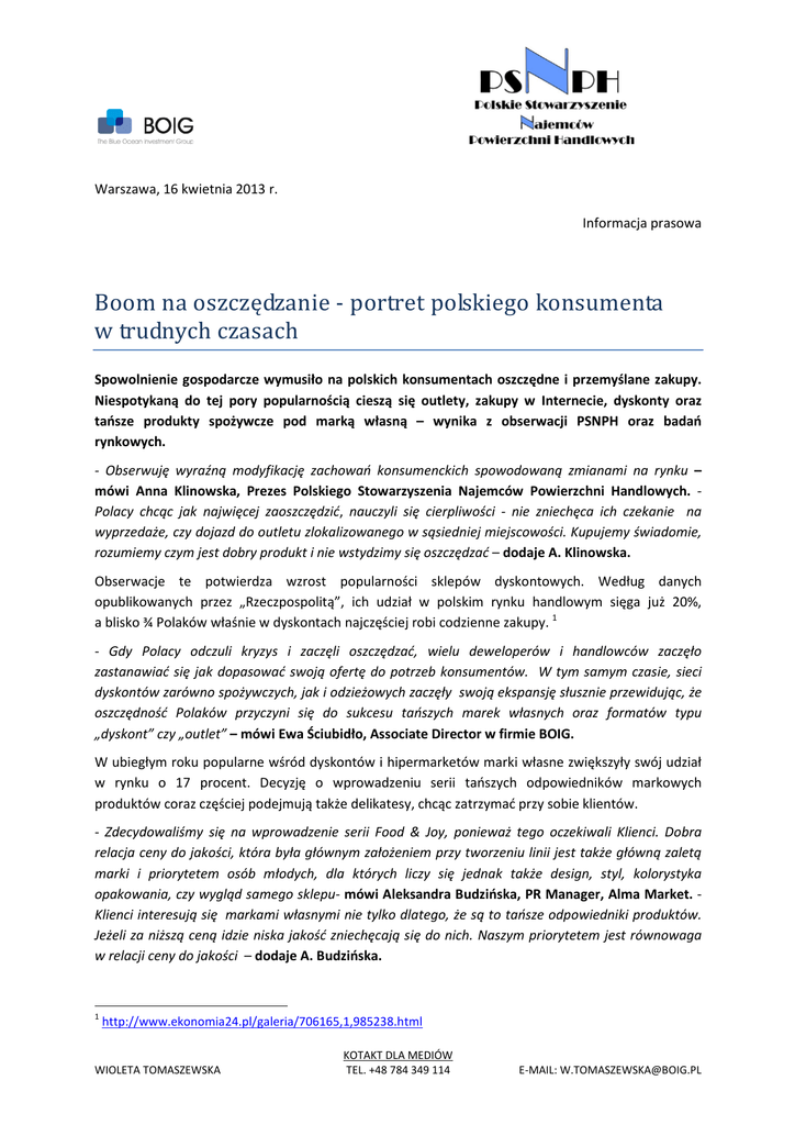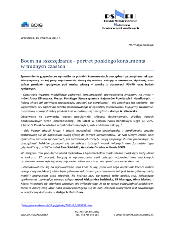 Warszawa, 16 kwietnia 2013 r. Informacja prasowa Boom na oszczędzanie - portret polskiego konsumenta w trudnych czasach Spowolnienie gospodarcze wymusiło na polskich konsumentach oszczędne i przemyślane zakupy. Niespotykaną do tej pory popularnością cieszą się outlety, zakupy w Internecie, dyskonty oraz tańsze produkty spożywcze pod marką własną – wynika z obserwacji PSNPH oraz badań rynkowych. - Obserwuję wyraźną modyfikację zachowań konsumenckich spowodowaną zmianami na rynku – mówi Anna Klinowska, Prezes Polskiego Stowarzyszenia Najemców Powierzchni Handlowych. Polacy chcąc jak najwięcej zaoszczędzić, nauczyli się cierpliwości - nie zniechęca ich czekanie na wyprzedaże, czy dojazd do outletu zlokalizowanego w sąsiedniej miejscowości. Kupujemy świadomie, rozumiemy czym jest dobry produkt i nie wstydzimy się oszczędzać – dodaje A. Klinowska. Obserwacje te potwierdza wzrost popularności sklepów dyskontowych. Według danych opublikowanych przez „Rzeczpospolitą”, ich udział w polskim rynku handlowym sięga już 20%, a blisko ¾ Polaków właśnie w dyskontach najczęściej robi codzienne zakupy. 1 - Gdy Polacy odczuli kryzys i zaczęli oszczędzać, wielu deweloperów i handlowców zaczęło zastanawiać się jak dopasować swoją ofertę do potrzeb konsumentów. W tym samym czasie, sieci dyskontów zarówno spożywczych, jak i odzieżowych zaczęły swoją ekspansję słusznie przewidując, że oszczędność Polaków przyczyni się do sukcesu tańszych marek własnych oraz formatów typu „dyskont” czy „outlet” – mówi Ewa Ściubidło, Associate Director w firmie BOIG. W ubiegłym roku popularne wśród dyskontów i hipermarketów marki własne zwiększyły swój udział w rynku o 17 procent. Decyzję o wprowadzeniu serii tańszych odpowiedników markowych produktów coraz częściej podejmują także delikatesy, chcąc zatrzymać przy sobie klientów. - Zdecydowaliśmy się na wprowadzenie serii Food & Joy, ponieważ tego oczekiwali Klienci. Dobra relacja ceny do jakości, która była głównym założeniem przy tworzeniu linii jest także główną zaletą marki i priorytetem osób młodych, dla których liczy się jednak także design, styl, kolorystyka opakowania, czy wygląd samego sklepu- mówi Aleksandra Budzińska, PR Manager, Alma Market. Klienci interesują się markami własnymi nie tylko dlatego, że są to tańsze odpowiedniki produktów. Jeżeli za niższą ceną idzie niska jakość zniechęcają się do nich. Naszym priorytetem jest równowaga w relacji ceny do jakości – dodaje A. Budzińska. 1 http://www.ekonomia24.pl/galeria/706165,1,985238.html WIOLETA TOMASZEWSKA KOTAKT DLA MEDIÓW TEL. +48 784 349 114 E-MAIL: [email protected] Tendencję Polaków do poszukiwania okazji cenowych potwierdzają także najemcy posiadają swoje salony w outletach. - Obecnie firma Solar posiada w Polsce 11 salonów typu „outlet” i wszystkie są chętnie odwiedzane przez naszych klientów. W sklepach tych oferujemy nasz firmowy asortyment, czyli elegancką odzież damską w miejskiej stylistyce z poprzednich kolekcji przecenione nawet o 60%. Stale niskie ceny i bogaty wybór sprawiają, że sklepy te cieszą się bardzo dużą popularnością – mówi Tomasz Sudoł, Dyrektor sieci sprzedaży, Solar Company SA. Polskim konsumentom, którzy chcą oszczędzać, sprzyja także coraz bardziej popularny e-handel. Z roku na rok powstaje w Polsce coraz więcej sklepów internetowych, a chętnych do korzystania z tej opcji nie brakuje. Według szacunków portalu Ceneo, w Polsce mamy już ponad 19 mln internautów, z których ponad 90% robi zakupy w Internecie.2 - Zakupy przez Internet to odpowiedź na potrzeby klientów, którzy oczekują tanich i zawsze dostępnych produktów markowych. Coraz częściej jednak klienci zaczynają traktować tradycyjne sklepy w galeriach handlowych jako przymierzalnie, w których można sprawdzić rozmiar, fason produktu oraz zasięgnąć porady sprzedawcy po to, by kupić wybrany model ubrania przez Internet – mówi Zofia Morbiato, Prezes Polskiego Stowarzyszenia Najemców Najemców Powierzchni Handlowych. Obecnie konkurencja na rynku realnym i internetowym jest tak duża, że klient chcąc oszczędzić może przebierać w propozycjach różnych firm, a w wyborze najtańszej oferty pomagają porównywarki cenowe, rankingi najpopularniejszych produktów i opinie innych kupujących. - Kilkanaście lat temu, oszczędzanie równoznaczne było z rezygnacją z zakupów. Dziś rynek dostosował się do zwyczajów zakupowych Polaków i oferuje nam możliwość zmniejszenia wydatków bez konieczności odmawiania sobie przyjemności – podsumowuje Anna Klinowska. POLSKIE STOWARZYSZENIE NAJEMCÓW POWIERZCHNI HANDLOWYCH Polskie Stowarzyszenia Najemców Powierzchni Handlowych jest dobrowolnym, samorządnym i trwałym zrzeszeniem powołanym dla zacieśnienia współpracy między najemcami powierzchni handlowych. Jego głównym celem jest ochrona interesów i praw najemców, propagowanie dobrych praktyk handlowych oraz działanie na rzecz zapewnienia równych praw i obowiązków zarówno Najemcom, jak i Wynajmującym powierzchnie w centralach handlowych. Członkami stowarzyszenia są znane i prestiżowe marki m.in. Komfort, Venezia, Unisono, Timberland, Sizeer, Gatta, Wojas, Bartek, Flo, Almi Decor, Vision Express, Komputronik, Drogeria Natura, 50 style. Co roku Polskie Stowarzyszenie Najemców Powierzchni Handlowych publikuje Ranking najlepszych Centrów Handlowych z punktu widzenia najemców. Laureaci rankingu prezentowani są podczas jesiennej edycji konferencji Shopping Center Forum. 2 http://www.ranking.ceneo.pl/wpcontent/uploads/bezpieczenstwo_i_zaufanie_filary_polskiego_ecommerce_raport_ceneo_pl.pdf WIOLETA TOMASZEWSKA KOTAKT DLA MEDIÓW TEL. +48 784 349 114 E-MAIL: [email protected]