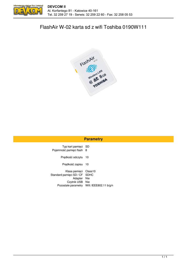 DEVCOM II Al. Korfantego 81 - Katowice 40-161 Tel. 32 259 27 19 - Serwis: 32 259 22 60 - Fax: 32 258 05 53 FlashAir W-02 karta sd z wifi Toshiba 0190W111 Parametry Typ kart pamięci SD Pojemność pamięci flash 8 Prędkość odczytu 10 Prędkość zapisu 10 Klasa pamięci Standard pamięci SD / CF Adapter Czytnik USB Pozostałe parametry Class10 SDHC Nie Nie Wifi: IEEE802.11 b/g/n 1/1 Powered by TCPDF (www.tcpdf.org)
