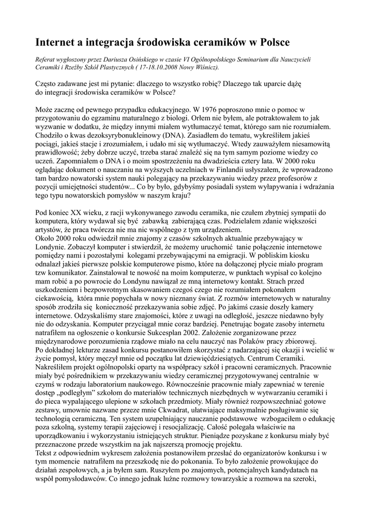 Internet a integracja środowiska ceramików w Polsce Referat wygłoszony przez Dariusza Osińskiego w czasie VI Ogólnopolskiego Seminarium dla Nauczycieli Ceramiki i Rzeźby Szkół Plastycznych ( 17-18.10.2008 Nowy Wiśnicz). Często zadawane jest mi pytanie: dlaczego to wszystko robię? Dlaczego tak uparcie dążę do integracji środowiska ceramików w Polsce? Może zacznę od pewnego przypadku edukacyjnego. W 1976 poproszono mnie o pomoc w przygotowaniu do egzaminu maturalnego z biologi. Orłem nie byłem, ale potraktowałem to jak wyzwanie w dodatku, że między innymi miałem wytłumaczyć temat, którego sam nie rozumiałem. Chodziło o kwas dezoksyrybonukleinowy (DNA). Zasiadłem do tematu, wykreśliłem jakieś pociągi, jakieś stacje i zrozumiałem, i udało mi się wytłumaczyć. Wtedy zauważyłem niesamowitą prawidłowość; żeby dobrze uczyć, trzeba starać znaleźć się na tym samym poziome wiedzy co uczeń. Zapomniałem o DNA i o moim spostrzeżeniu na dwadzieścia cztery lata. W 2000 roku oglądając dokument o nauczaniu na wyższych uczelniach w Finlandii usłyszałem, że wprowadzono tam bardzo nowatorski system nauki polegający na przekazywaniu wiedzy przez profesorów z pozycji umiejętności studentów... Co by było, gdybyśmy posiadali system wyłapywania i wdrażania tego typu nowatorskich pomysłów w naszym kraju? Pod koniec XX wieku, z racji wykonywanego zawodu ceramika, nie czułem zbytniej sympatii do komputera, który wydawał się być zabawką zabierającą czas. Podzielałem zdanie większości artystów, że praca twórcza nie ma nic wspólnego z tym urządzeniem. Około 2000 roku odwiedził mnie znajomy z czasów szkolnych aktualnie przebywający w Londynie. Zobaczył komputer i stwierdził, że możemy uruchomić tanie połączenie internetowe pomiędzy nami i pozostałymi kolegami przebywającymi na emigracji. W pobliskim kiosku odnalazł jakieś pierwsze polskie komputerowe pismo, które na dołączonej płycie miało program tzw komunikator. Zainstalował te nowość na moim komputerze, w punktach wypisał co kolejno mam robić a po powrocie do Londynu nawiązał ze mną internetowy kontakt. Strach przed uszkodzeniem i bezpowrotnym skasowaniem czegoś czego nie rozumiałem pokonałem ciekawością, która mnie popychała w nowy nieznany świat. Z rozmów internetowych w naturalny sposób zrodziła się konieczność przekazywania sobie zdjęć. Po jakimś czasie doszły kamery internetowe. Odzyskaliśmy stare znajomości, które z uwagi na odległość, jeszcze niedawno były nie do odzyskania. Komputer przyciągał mnie coraz bardziej. Penetrując bogate zasoby internetu natrafiłem na ogłoszenie o konkursie Sukcesplan 2002. Założenie zorganizowane przez międzynarodowe porozumienia rządowe miało na celu nauczyć nas Polaków pracy zbiorowej. Po dokładnej lekturze zasad konkursu postanowiłem skorzystać z nadarzającej się okazji i wcielić w życie pomysł, który męczył mnie od początku lat dziewięćdziesiątych. Centrum Ceramiki. Nakreśliłem projekt ogólnopolski oparty na współpracy szkół i pracowni ceramicznych. Pracownie miały być pośrednikiem w przekazywaniu wiedzy ceramicznej przygotowywanej centralnie w czymś w rodzaju laboratorium naukowego. Równocześnie pracownie miały zapewniać w terenie dostęp „podległym” szkołom do materiałów technicznych niezbędnych w wytwarzaniu ceramiki i do pieca wypalającego ulepione w szkołach przedmioty. Miały również rozpowszechniać gotowe zestawy, umownie nazwane przeze mnie Ckwadrat, ułatwiające maksymalnie posługiwanie się technologią ceramiczną. Ten system uzupełniający nauczanie podstawowe wzbogaciłem o edukację poza szkolną, systemy terapii zajęciowej i resocjalizację. Całość polegała właściwie na uporządkowaniu i wykorzystaniu istniejących struktur. Pieniądze pozyskane z konkursu miały być przeznaczone przede wszystkim na jak najszerszą promocję projektu. Tekst z odpowiednim wykresem założenia postanowiłem przesłać do organizatorów konkursu i w tym momencie natrafiłem na przeszkodę nie do pokonania. To było założenie prowokujące do działań zespołowych, a ja byłem sam. Ruszyłem po znajomych, potencjalnych kandydatach na współ pomysłodawców. Co innego jednak luźne rozmowy towarzyskie a rozmowa na szeroki, poważny temat. Nie znalazłem nikogo kto by chciał przeanalizować zagadnienie, ustosunkować się do niego, nanieść poprawki i podpisać się pod nim. Wysłałem wniosek ze świadomością porażki. Wygrał projekt zamykający się w zakresie jednego małego przedsiębiorstwa produkcyjnego. Tak jak wcześniej przy fińskiej edukacji tak i teraz zamarzyłem o rodzaju Wolnej Trybuny... Zacząłem szukać ceramików w wirtualnym Świecie, bo w kraju nie mogłem znaleźć żadnego... Wydrukowałem sporą ilość materiałów, które gromadziłem w skoroszytach. Po jakimś czasie z przyjemnością odnalazłem pierwsze polskie forum, na którym ceramicy usiłowali czegoś się dowiedzieć, coś kupić, coś sprzedać, coś zorganizować. Forum było bardzo prymitywne i pomstowaliśmy nad jego uciążliwością. Zwierzyłem się tam, że mam sporo pomysłów do realizacji ale czekam na stosowny moment. Ktoś odpowiedział, że ten moment właśnie nastąpił. Zaprosił mnie do współtworzenia nowego forum ceramicznego pod nowym adresem. Miejsce okazało się idealne. Usiadłem wygodnie w fotelu i z uporem maniaka zacząłem tworzyć coraz to nowe działy. Wędrując po wystawach, po okolicy i po Polsce, zrobiłem w tym czasie około 2 000 zdjęć cyfrowych, które oczywiście od razu umieściłem w sieci. Zacząłem pisać Poradnik dla początkujących z szybkością trzech porad dziennie ilustrując go własnymi rysunkami. Z zebranych adresów pracowni i miejsc zaopatrzenia ceramików zapoczątkowałem tworzenie informatora. Ktoś powiedział, że mało jest tekstów w literaturze o naszym zawodzie. Zaczą