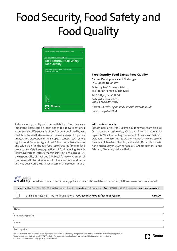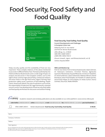 Food Security, Food Safety and Food Quality Forum Umwelt-, Agrar- und Klimaschutzrecht 8 Ines Härtel/Roman Budzinowski (eds.) Food Security, Food Safety, Food Quality Current Developments and Challenges in European Union Law Food Security, Food Safety, Food Quality Current Developments and Challenges in European Union Law Edited by Prof. Dr. Ines Härtel and Prof Dr. Roman Budzinowski 2016, 281 pp., hc., € 99.00 ISBN 978-3-8487-2939-5 eISBN 978-3-8452-7333-4 Nomos (Forum Umwelt-, Agrar- und Klimaschutzrecht, vol. 8) nomos-shop.de/26924 Today security, quality and the availability of food are very important. These complex relations of the above mentioned issues evole in different fields of law. The book published by Ines Härtel and Roman Budzinwoski covers a wide range of topics via analysis and discussion in the European context, such as the right to food, Common Agricultural Policy, contractual relations and value chains in the agri-food sector, organic farming, food production safety issues, questions of food labelling, Health Claims, Novel Food, Patents, the role of institutions such as EFSA, the responsibility of trade and CSR. Legal frameworks, essential concerns and fu-ture developments of food security, food safety and food quality are the basis for discussion and solution finding. Nomos eLibrary With contributions by: Prof. Dr. Ines Härtel, Prof. Dr. Roman Budzinowski, Adam Zielinski, Dr. Katarzyna Leskiewicz, Christian Thomas, Agnieszka Szymecka-Wesolowska, Krzysztof Rózanski, Christina A. F laskühler, Dr. Johanna Monien, Lukasz Sokolowski, Mathias OIbrisch, Daniel Brandauer, Johan Fried Stoepker, Jan Hindahl, Dr. Izabela Lipinska, Anne-Kristin Mayer, Dr. Anna Kapala, Dr. Aneta Suchon, Hanna Schmelz, Elisa Aust, Malte Wilhelm Academic research and scholarly publications are also available on our online platform: www.nomos-elibrary.de order hotline (+49)7221.2104-37 | online nomos-shop.de | e-mail [email protected] | fax (+49)7221.2104-43 | or contact your local bookstore 978-3-8487-2939-5 Härtel | Budzinowski Food Security, Food Safety, Food Quality Name Company / Institution Address Date, Signature You can withdraw from this order without giving reasons within fourteen days. Simply send your written withdrawal within the given period to: Verlagsauslieferung, In den Lissen 12, 76547 Sinzheim, Germany or to your bookstore. A withdrawal binds you to return the items. All costs and risks of return are payable by the addressee. € 99.00