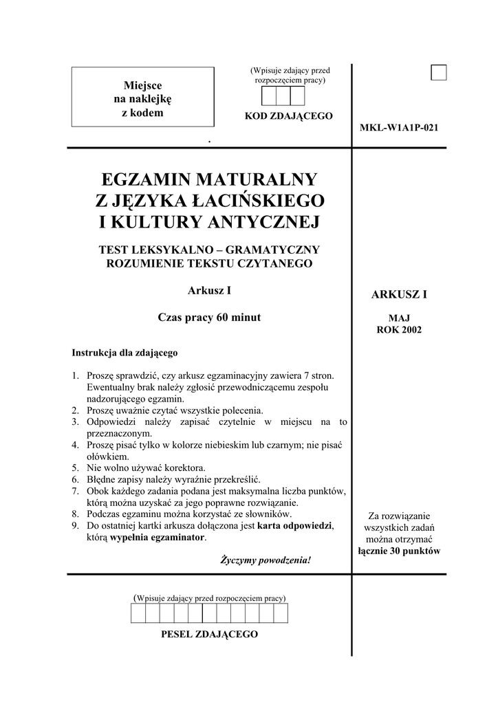 (Wpisuje zdaj¹cy przed rozpoczêciem pracy) Miejsce na naklejkê z kodem KOD ZDAJ¥CEGO MKL-W1A1P-021 . EGZAMIN MATURALNY Z JÊZYKA £ACIÑSKIEGO I KULTURY ANTYCZNEJ TEST LEKSYKALNO – GRAMATYCZNY ROZUMIENIE TEKSTU CZYTANEGO Arkusz I ARKUSZ I Czas pracy 60 minut MAJ ROK 2002 Instrukcja dla zdaj¹cego 1. Proszê sprawdziæ, czy arkusz egzaminacyjny zawiera 7 stron. Ewentualny brak nale¿y zg³osiæ przewodnicz¹cemu zespo³u nadzoruj¹cego egzamin. 2. Proszê uwa¿nie czytaæ wszystkie polecenia. 3. Odpowiedzi nale¿y zapisaæ czytelnie w miejscu na to przeznaczonym. 4. Proszê pisaæ tylko w kolorze niebieskim lub czarnym; nie pisaæ o³ówkiem. 5. Nie wolno u¿ywaæ korektora. 6. B³êdne zapisy nale¿y wyranie przekreliæ. 7. Obok ka¿dego zadania podana jest maksymalna liczba punktów, któr¹ mo¿na uzyskaæ za jego poprawne rozwi¹zanie. 8. Podczas egzaminu mo¿na korzystaæ ze s³owników. 9. Do ostatniej kartki arkusza do³¹czona jest karta odpowiedzi, któr¹ wype³nia egzaminator. ¯yczymy powodzenia! (Wpisuje zdaj¹cy przed rozpoczêciem pracy) PESEL ZDAJ¥CEGO Za rozwi¹zanie wszystkich zadañ mo¿na otrzymaæ ³¹cznie 30 punktów Egzamin maturalny z jêzyka ³aciñskiego i kultury antycznej Arkusz I 2 Czêæ pierwsza TEST LEKSYKALNO – GRAMATYCZNY W zadaniach od 1. do 6. zakrel jedn¹ poprawn¹ mo¿liwoæ (A,B,C,D) uzupe³nienia zdañ. Zadanie1. (1 pkt) Bonus orator …………................. animos audientium movet. A. B. C. D. dicenda, dicendo, dicendi, dicere. Zadanie 2. (1pkt) Urbs vestra…………........................ pulcherrima esse potest. A. B. C. D. omnes, omne, omnia, omnium. Zadanie 3. ( 1pkt) In proverbio est:................................est canis vivus leone mortuo. A. B. C. D. optimus, meliore, melior, bonus. Zadanie 4. (1 pkt) Valde te rogo, ut diligenter ................................. . A. B. C. D. audires, audias, audies, audiveris. Egzamin maturalny z jêzyka ³aciñskiego i kultury antycznej Arkusz I 3 Zadanie 5. (1 pkt) Omnis civitas nostra in sedecim ............................ divisa est. A. B. C. D. pagorum, pagos, pagis, pagum. Zadanie 6. (1 pkt) Gallorum legati ad imperatorem ……………….. venerunt. A. B. C. D. gratulatum, gratulatus, gratulatu, gratulatae. Zadanie 7. (5 pkt) Uzupe³nij poni¿sz¹ tabelê przyporz¹dkowuj¹c kolejnym zdaniom podrzêdnym (1.,2.,3.,4.,5.) litery odpowiadaj¹ce nazwom, które okrelaj¹ typ zdania A, B, C, D, E, F. 1. Si ibi te esse scivissemus, ad te ipsi venissemus. 2. Hoc mihi placuit, quia tibi placuit. 3. Romani antiqui Athenas adveniebant, ut philosophos audirent. 4. Quamquam in urbe manes, tamem numquam ad me accedis. 5. Cum munera gladiatoria essent, gladiatores in amphitheatro gladiis pugnabant. A. zdanie przyzwalaj¹ce, B. zdanie czasowe, C. zdanie przyczynowe, D. zdanie warunkowe, E. zdanie celowe, F. zdanie skutkowe. Numer zdania 1. 2. 3. 4. 5. Litera oznaczaj¹ca typ zdania 4 Egzamin maturalny z jêzyka ³aciñskiego i kultury antycznej Arkusz I W zadaniach od 8. do 11. zakrel jedn¹ mo¿liwoæ (A,B,C,D) poprawnego uzupe³nienia zdania, tak aby zachowaæ znaczenie zdania wyjciowego. Zadanie 8. (1 pkt) Urbs thermas pulchras habet. Urbi.................. A. thermae pulchrae habent, B. thermas pulchras habent, C. thermis pulchris sunt, D. thermae pulchrae sunt. Zadanie 9. (1 pkt) Leonem bestiarum regem putamus. ..........................................putatur. A. Leo regem bestiarum, B. Leonem rex bestiarum, C. Leo rex bestiarum, D. Leo rege bestiarum. Zadanie 10. (1 pkt) Spartacus in primo agmine dimicans occisus est. Scivistis Spartacum in primo agmine dimicantem............. A. occisum est, B. occidisse, C. occisum esse, D. occisi esse. Zadanie 11. (1 pkt) Homines carmina poetarum legere debent. Hominibus carmina poetarum……. A. ad legendi sunt, B. lecta sunt, C. legenda sunt, D. lecta erant. Egzamin maturalny z jêzyka ³aciñskiego i kultury antycznej Arkusz I 5 Czêæ druga ROZUMIENIE TEKSTU CZYTANEGO Przeczytaj poni¿szy tekst. C.I. Caesar, De bello Gallico, V 6-7 Erat una cum ceteris Dumnorix Haeduus, de quo a nobis antea dictum est. ( Caesar) hunc secum habere in primis constituerat, quod eum cupidum rerum novarum, cupidum imperii, magni animi,magnae inter Gallos auctoritatis cognoverat. Accedebat huc, quod iam in concilio Haeduorum Dumnorix dixerat sibi a Caesare regnum civitatis deferri. Quod dictum Haedui graviter ferebant (...). Id factum ex suis hospitibus Caesar cognoverat. Ille (Dumnorix) omnibus primo precibus petere contendit, ut in Gallia relinqueretur, partim quod insuetus navigandi mare timeret, partim quod religionibus impediri sese diceret. Posteaquam id obstinate sibi negari vidit, omni spe impetrandi adempta, principes Galliae sollicitare, sevocare singulos hortarique coepit, uti in continenti remanerent (...). Dumnorix, Dumnorigis – Dumnoryks, wódz Eduów Haedui, Haeduorum - Eduowie, jedno z najpotê¿niejszych plemion Galii. W zdaniach od 12. do 16., na podstawie informacji zawartych w tekcie, zakrel tê z czterech mo¿liwoci ( A,B,C,D) dokoñczenia zdañ, która jest zgodna z treci¹ tekstu. Zadanie 12. (2 pkt) Cezar postanowi³ zatrzymaæ przy sobie Dumnoryksa, gdy¿ pozna³ go jako cz³owieka: A. B. C. D. tchórzliwego, przebieg³ego, godnego zaufania, ¿¹dnego w³adzy. Zadanie 13. (2 pkt) Na zgromadzeniu Eduów Dumnoryks powiedzia³, ¿e Cezar: A. B. C. D. powierzy³ mu w³adzê królewsk¹ w pañstwie, nie bêdzie ingerowa³ w sprawy Eduów, zamierza zmusiæ Eduów do pos³uszeñstwa, nie powierzy³ mu w³adzy królewskiej w pañstwie, Egzamin maturalny z jêzyka ³aciñskiego i kultury antycznej Arkusz I 6 Zadanie 14. (2 pkt) O wydarzeniu tym Cezar dowiedzia³ siê od swoich: A. legatów, B. wrogów, C. przyjació³, D. szpiegów. Zadanie 15. (2 pkt) Pocz¹tkowo Dumnoryks b³aga³, aby móg³ pozostaæ w Galii, poniewa¿: A. jest potrzebny w pañstwie, B. obawia siê morza, C. nie mo¿e opuciæ rodziny, D. nie lubi podró¿owaæ. Zadanie 16. (2