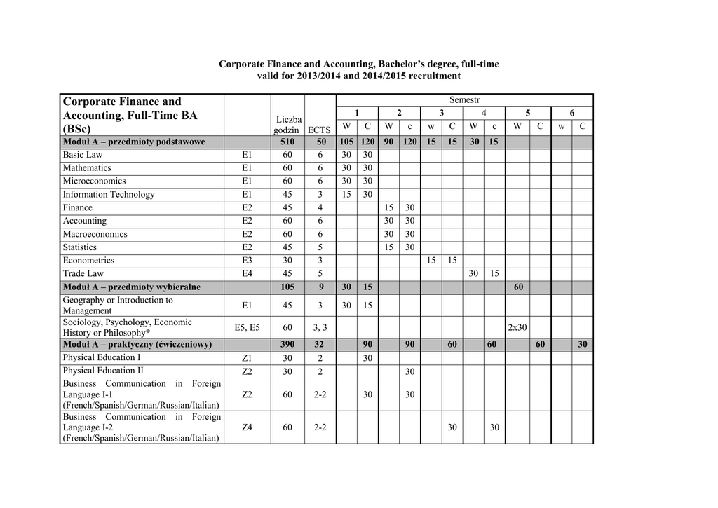 Corporate Finance and Accounting, Bachelor’s degree, full-time valid for 2013/2014 and 2014/2015 recruitment Semestr Corporate Finance and Accounting, Full-Time BA (BSc) Moduł A – przedmioty podstawowe Basic Law Mathematics Microeconomics Information Technology Finance Accounting Macroeconomics Statistics Econometrics Trade Law Moduł A – przedmioty wybieralne Geography or Introduction to Management Sociology, Psychology, Economic History or Philosophy* Moduł A – praktyczny (ćwiczeniowy) Physical Education I Physical Education II Business Communication in Foreign Language I-1 (French/Spanish/German/Russian/Italian) Business Communication in Foreign Language I-2 (French/Spanish/German/Russian/Italian) 1 E1 E1 E1 E1 E2 E2 E2 E2 E3 E4 Liczba godzin ECTS W C W 510 50 105 120 90 60 6 30 30 60 6 30 30 60 6 30 30 45 3 15 30 45 4 15 60 6 30 60 6 30 45 5 15 30 3 45 5 105 9 30 15 E1 45 3 30 E5, E5 60 3, 3 Z1 Z2 390 30 30 32 2 2 90 30 Z2 60 2-2 30 Z4 60 2-2 2 3 4 5 c w C W c 120 15 15 30 15 15 15 30 15 W 6 C w C 30 30 30 30 60 15 2x30 90 60 60 30 30 30 30 60 30 Business Communication in Foreign Language I-3 (French/Spanish/German/Russian/Italian) Business Communication in Foreign Language II-1 (French/Spanish/German/Russian/Italian) Business Communication in Foreign Language II-2 (French/Spanish/German/Russian/Italian) Business Communication in Foreign Language II-3 (French/Spanish/German/Russian/Italian) Bachelor’s Seminar Moduł B – przedmioty kierunkowe podstawowe Financial Mathematics Public Finance Banking Corporate Finance Insurance International Finance Financial Accounting Financial Markets Financial Analysis Moduł B – przedmioty kierunkowe wybieralne Evaluation’s Methods of Business Project or Programming & Financing Regional Development Elective Course Moduł B – przedmioty kierunkowe specjalnościowe (specjalność do wyboru)** E5 15 1 Z2 60 2-2 Z4 60 2-2 E5 15 1 15 Z5-6 60 390 4-6 40 30 30 45 45 45 45 45 60 45 30 105 3 5 5 5 4 4 5 5 4 10 E5 45 5 E4 60 5 360 36 E2 E3 E3 E3 E3 E3 E4 E4 E4 15 30 30 30 30 120 135 30 75 60 30 30 15 30 30 15 15 30 30 30 15 15 15 15 30 30 30 30 30 15 30 15 30 15 30 60 60 30 120 120 EU Funds Global Banking General Equilibrium Theory Research Project International Finance II Elective Course Moduł C – praktyka zawodowa Apprenticeship Suma punktów ECTS Liczba godzin Liczba egzaminów razem E5 E5 E6 E6 E6 E6 Z5 1860 32 60 60 60 60 60 60 6 30 30 6 6 6 6 6 3 3 180 30 30 30 30 30 30 30 30 30 30 *** 30 360 5 30 330 5 30 315 6 28 300 7 32 285 5 30 270 4 * Student wybiera 2 przedmioty z wymienionych/a student choose 2 courses out of 4 mentioned ** Jeden z przedmiotów odnosi się do etyki w danym zawodzie lub dobrych praktyk/ one of the courses referes to ethics or good practices