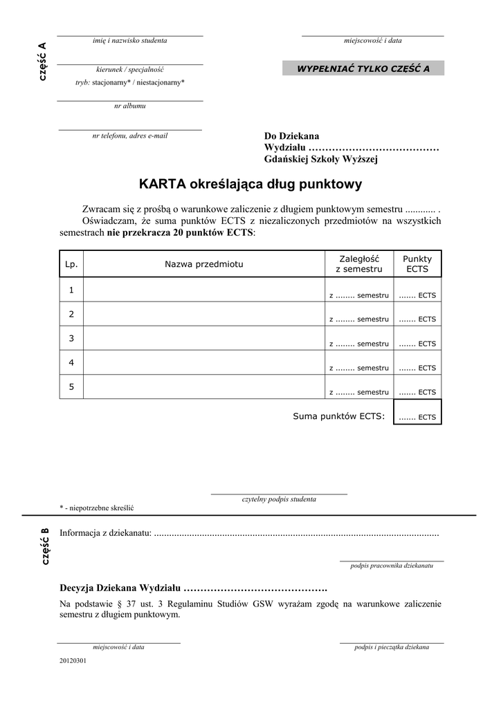 część A imię i nazwisko studenta miejscowość i data WYPEŁNIAĆ TYLKO CZĘŚĆ A kierunek / specjalność tryb: stacjonarny* / niestacjonarny* nr albumu Do Dziekana Wydziału ………………………………… Gdańskiej Szkoły Wyższej nr telefonu, adres e-mail KARTA określająca dług punktowy Zwracam się z prośbą o warunkowe zaliczenie z długiem punktowym semestru ............ . Oświadczam, że suma punktów ECTS z niezaliczonych przedmiotów na wszystkich semestrach nie przekracza 20 punktów ECTS: Lp. Nazwa przedmiotu 1 2 3 4 5 Zaległość z semestru Punkty ECTS z ........ semestru ....... ECTS z ........ semestru ....... ECTS z ........ semestru ....... ECTS z ........ semestru ....... ECTS z ........ semestru ....... ECTS Suma punktów ECTS: ....... ECTS czytelny podpis studenta część B * - niepotrzebne skreślić Informacja z dziekanatu: ................................................................................................................. podpis pracownika dziekanatu Decyzja Dziekana Wydziału ……………………………………. Na podstawie § 37 ust. 3 Regulaminu Studiów GSW wyrażam zgodę na warunkowe zaliczenie semestru z długiem punktowym. miejscowość i data 20120301 podpis i pieczątka dziekana