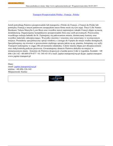 Dane pochodzą ze strony: http://www.ogloszenia-kielce.pl/. Wygenerowano dnia: 04-03-2017. Transport Przeprowadzki Polska - Francja - Polska Jeżeli potrzebują Państwo przeprowadzki lub transportu z Polski do Francji, z Francji do Polski lub pomiędzy Francją a innym państwem europejskim nasza firma może się tym zająć. Paryż Lille Nantes Bordeaux Tuluza Marsylia Lyon Brest oraz wszelkie nawet najmniejsze zakątki Francji objęte są naszą działalnością. Organizujemy kompleksowe przeprowadzki firm oraz osób prywatnych. Przewozimy wszelkiego rodzaju ładunki do 8t. Zajmujemy się pakowaniem mienia, dostarczamy kartony oraz wszelkie materiały zabezpieczające. Wszystko znosimy i wnosimy oraz ustawiamy w wyznaczonym miejscu. Posiadamy specjalistyczny sprzęt windowy o zasięgu do 4 piętra do miejsc trudno dostępnych. Specjalizujemy się również w przewożeniu ciężkiego sprzętu jakim są np. pianina, fortepiany czy sejfy. Transport realizujemy w ciągu 24h od momentu załadunku. Całość mienia objęta jest ubezpieczeniem oraz stałą kontrolą podczas przewozu. Gwarantujemy dotarcie Państwa dobytku na miejsce w nienaruszonym stanie. Jesteśmy do Państwa dyspozycji o każdej porze 6 dni w tygodniu. Kontakt: +48 696-126-142 +48 609-679-077 +41 345-43-10 e-mail: [email protected] skype: jupiter.transport www.jupiter-transport.pl Dane: email: [email protected] telefon: +48 696-126-142 Miejscowość: Kielce
