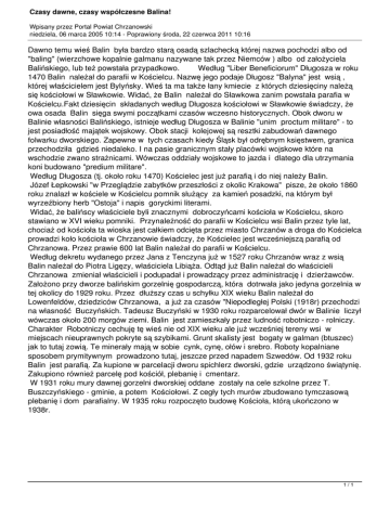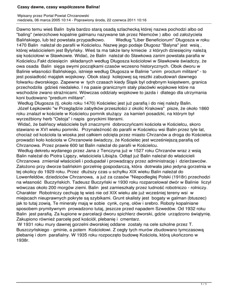 Czasy dawne, czasy współczesne Balina! Wpisany przez Portal Powiat Chrzanowski niedziela, 06 marca 2005 10:14 - Poprawiony środa, 22 czerwca 2011 10:16 Dawno temu wieś Balin była bardzo starą osadą szlachecką której nazwa pochodzi albo od "baling" (wierzchowe kopalnie galmanu nazywane tak przez Niemców ) albo od założyciela Balińskiego, lub też powstała przypadkowo. Według "Liber Beneficiorum" Długosza w roku 1470 Balin należał do parafii w Kościelcu. Nazwę jego podaje Długosz "Balyna" jest wsią , której właścicielem jest Bylyńsky. Wieś ta ma także łany kmiecie z których dziesięciny należą się kościołowi w Sławkowie. Widać, że Balin należał do Sławkowa zanim powstała parafia w Kościelcu.Fakt dziesięcin składanych według Długosza kościołowi w Sławkowie świadczy, że owa osada Balin sięga swymi początkami czasów wczesno historycznych. Obok dworu w Balinie własności Balińskiego, istnieje według Długosza w Balinie "unim proctum militare" - to jest posiadłość majątek wojskowy. Obok stacji kolejowej są resztki zabudowań dawnego folwarku dworskiego. Zapewne w tych czasach kiedy Śląsk był odrębnym księstwem, granica przechodziła gdzieś niedaleko. I na pasie granicznym stały placówki wojskowe które na wschodzie zwano strażnicami. Wówczas oddziały wojskowe to jazda i dlatego dla utrzymania koni budowano "predium militare". Według Długosza (tj. około roku 1470) Kościelec jest już parafią i do niej należy Balin. Józef Łepkowski "w Przeglądzie zabytków przeszłości z okolic Krakowa" pisze, że około 1860 roku znalazł w kościele w Kościelcu pomnik służący za kamień posadzki, na którym był wyrzeźbiony herb "Ostoja" i napis goryckimi literami. Widać, że balińscy właściciele byli znacznymi dobroczyńcami kościoła w Kościelcu, skoro stawiano w XVI wieku pomniki. Przynależność do parafii w Kościelcu wsi Balin przez tyle lat, chociaż od kościoła ta wioska jest całkiem odcięta przez miasto Chrzanów a droga do Kościelca prowadzi koło kościoła w Chrzanowie świadczy, że Kościelec jest wcześniejszą parafią od Chrzanowa. Przez prawie 600 lat Balin należał do parafii w Kościelcu. Według dekretu wydanego przez Jana z Tenczyna już w 1527 roku Chrzanów wraz z wsią Balin należał do Piotra Ligęzy, właściciela Libiąża. Odtąd już Balin należał do właścicieli Chrzanowa zmieniał właścicieli i podupadał i prowadzący przez administrację i dzierżawców. Założono przy dworze balińskim gorzelnię gospodarczą, która dotrwała jako jedyna gorzelnia w tej okolicy do 1929 roku. Przez dłuższy czas u schyłku XIX wieku Balin należał do Lowenfeldów, dziedziców Chrzanowa, a już za czasów "Niepodległej Polski (1918r) przechodzi na własność Buczyńskich. Tadeusz Buczyński w 1930 roku rozparcelował dwór w Balinie liczył wówczas około 200 morgów ziemi. Balin jest zamieszkały przez ludność robotniczo - rolniczy. Charakter Robotniczy cechuję tę wieś nie od XIX wieku ale już wcześniej tereny wsi w miejscach nieuprawnych pokryte są szybikami. Grunt skalisty jest bogaty w galman (btuszec) jak to tutaj zowią. Te minerały mają w sobie cynk, cynę, ołów i srebro. Roboty kopalniane sposobem prymitywnym prowadzono tutaj, jeszcze przed napadem Szwedów. Od 1932 roku Balin jest parafią. Za kupione w parcelacji dworu spichlerz dworski, gdzie urządzono świątynię. Zakupiono również parcelę pod kościół, plebanię i cmentarz. W 1931 roku mury dawnej gorzelni dworskiej oddane zostały na cele szkolne przez T. Buszczyńskiego - gminie, a potem Kościołowi. Z cegły tych murów zbudowano tymczasową plebanię i dom parafialny. W 1935 roku rozpoczęto budowę Kościoła, którą ukończono w 1938r. 1/1