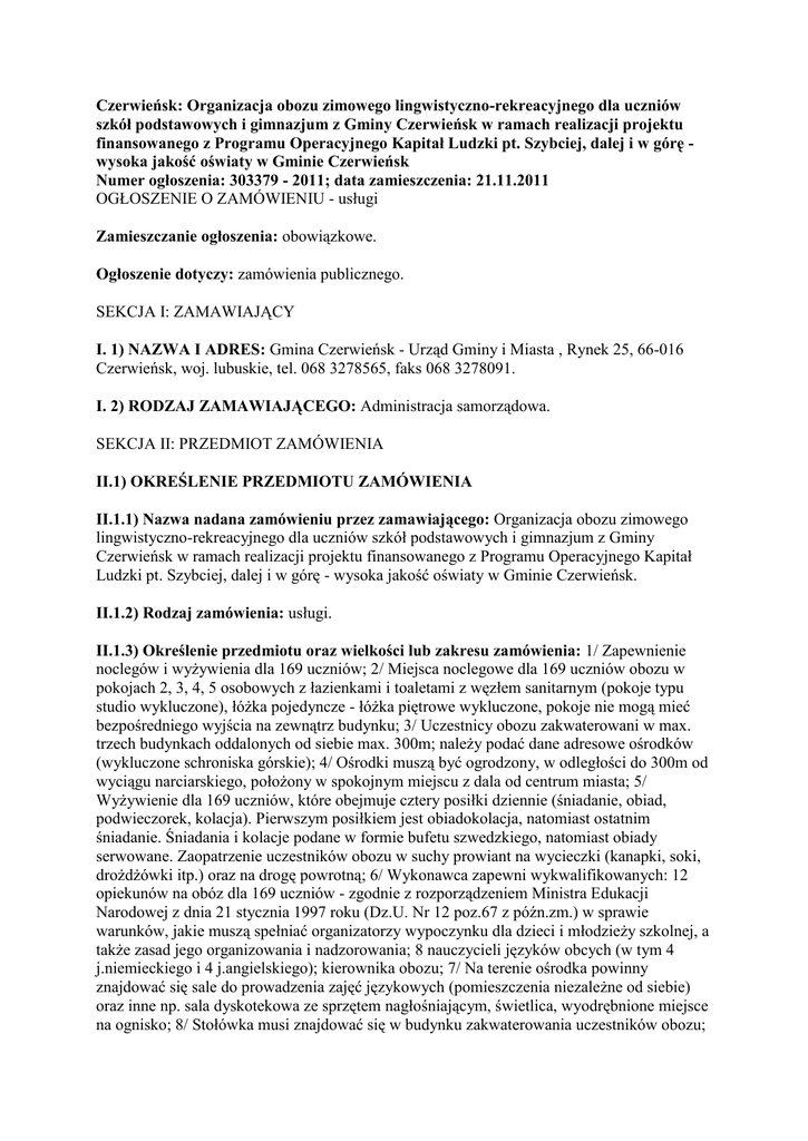 Czerwieńsk: Organizacja obozu zimowego lingwistyczno-rekreacyjnego dla uczniów szkół podstawowych i gimnazjum z Gminy Czerwieńsk w ramach realizacji projektu finansowanego z Programu Operacyjnego Kapitał Ludzki pt. Szybciej, dalej i w górę wysoka jakość oświaty w Gminie Czerwieńsk Numer ogłoszenia: 303379 - 2011; data zamieszczenia: 21.11.2011 OGŁOSZENIE O ZAMÓWIENIU - usługi Zamieszczanie ogłoszenia: obowiązkowe. Ogłoszenie dotyczy: zamówienia publicznego. SEKCJA I: ZAMAWIAJĄCY I. 1) NAZWA I ADRES: Gmina Czerwieńsk - Urząd Gminy i Miasta , Rynek 25, 66-016 Czerwieńsk, woj. lubuskie, tel. 068 3278565, faks 068 3278091. I. 2) RODZAJ ZAMAWIAJĄCEGO: Administracja samorządowa. SEKCJA II: PRZEDMIOT ZAMÓWIENIA II.1) OKREŚLENIE PRZEDMIOTU ZAMÓWIENIA II.1.1) Nazwa nadana zamówieniu przez zamawiającego: Organizacja obozu zimowego lingwistyczno-rekreacyjnego dla uczniów szkół podstawowych i gimnazjum z Gminy Czerwieńsk w ramach realizacji projektu finansowanego z Programu Operacyjnego Kapitał Ludzki pt. Szybciej, dalej i w górę - wysoka jakość oświaty w Gminie Czerwieńsk. II.1.2) Rodzaj zamówienia: usługi. II.1.3) Określenie przedmiotu oraz wielkości lub zakresu zamówienia: 1/ Zapewnienie noclegów i wyżywienia dla 169 uczniów; 2/ Miejsca noclegowe dla 169 uczniów obozu w pokojach 2, 3, 4, 5 osobowych z łazienkami i toaletami z węzłem sanitarnym (pokoje typu studio wykluczone), łóżka pojedyncze - łóżka piętrowe wykluczone, pokoje nie mogą mieć bezpośredniego wyjścia na zewnątrz budynku; 3/ Uczestnicy obozu zakwaterowani w max. trzech budynkach oddalonych od siebie max. 300m; należy podać dane adresowe ośrodków (wykluczone schroniska górskie); 4/ Ośrodki muszą być ogrodzony, w odległości do 300m od wyciągu narciarskiego, położony w spokojnym miejscu z dala od centrum miasta; 5/ Wyżywienie dla 169 uczniów, które obejmuje cztery posiłki dziennie (śniadanie, obiad, podwieczorek, kolacja). Pierwszym posiłkiem jest obiadokolacja, natomiast ostatnim śniadanie. Śniadania i kolacje podane w formie bufetu szwedzkiego, natomiast obiady serwowane. Zaopatrzenie uczestników obozu w suchy prowiant na wycieczki (kanapki, soki, drożdżówki itp.) oraz na drogę powrotną; 6/ Wykonawca zapewni wykwalifikowanych: 12 opiekunów na obóz dla 169 uczniów - zgodnie z rozporządzeniem Ministra Edukacji Narodowej z dnia 21 stycznia 1997 roku (Dz.U. Nr 12 poz.67 z późn.zm.) w sprawie warunków, jakie muszą spełniać organizatorzy wypoczynku dla dzieci i młodzieży szkolnej, a także zasad jego organizowania i nadzorowania; 8 nauczycieli języków obcych (w tym 4 j.niemieckiego i 4 j.angielskiego); kierownika obozu; 7/ Na terenie ośrodka powinny znajdować się sale do prowadzenia zajęć językowych (pomieszczenia niezależne od siebie) oraz inne np. sala dyskotekowa ze sprzętem nagłośniającym, świetlica, wyodrębnione miejsce na ognisko; 8/ Stołówka musi znajdować się w budynku zakwaterowania uczestników obozu; 9/ Stołówka nie może pełnić roli sali dydaktycznej lub dyskotekowej natomiast sale dydaktyczne muszą być odrębnymi pomieszczeniami od siebie niezależnymi; 10/ Wykonawca zapewni instruktorów sportów zimowych - np. narciarstwa, snowboardu i łyżwiarstwa; 11/ Wykonawca zapewni karnety na wyciągi narciarskie dla 169 uczniów; 12/ Wykonawca zapewni wyposażenie uczestników obozu w sprzęt do sportów zimowych dla 169 uczestników obozu tj. kije, buty, kaski, gogle, deski do snowboardu, łyżwy; 13/ Wykonawca zapewni przewóz uczestników obozu na miejsce wypoczynku i odwozu do Czerwieńska - 4 autokary z toaletą i klimatyzacją dla 169 uczniów wraz z kierowcą i z opiekunami. Autokar ma być podstawiony minimum pół godziny przed odjazdem w celu sprawdzenia jego sprawności technicznej w miejscu wskazanym przez Zamawiającego; 14/ W miejscu organizowanego obozu musi pozostać do dyspozycji 1 autokar; 15/ Nadzór właściwej opieki medycznej. Wykonawca dysponuje personelem pielęgniarskim lub lekarzem dochodzącym na każde wezwanie kierownika obozu lub opiekuna. Wykonawca zapewni podstawowe leki pierwszej potrzeby. Wykonawca zapewni sprawny i bezpłatny transport chorego lub poszkodowanego w wypadku dziecka do i z przychodni lekarskiej pod opieką opiekuna obozu; 16/ Zorganizowanie min.4 atrakcyjnych wycieczek turystyczno-krajoznawczych z przewodnikiem po okolicach - zwiedzanie ciekawych miejsc i obiektów zabytkowych, z pokryciem kosztów wstępu dla wszystkich uczestników; 17/ Zapewnienie opiekunów nocnych; 18/ Wykonawca zobowiązany jest do zgłoszenia organizacji obozu letniego do Kuratorium Oświaty; 19/ Program ramowy obozu powinien zawierać wszelkie informacje dotyczące organizowanego obozu z uwzględnieniem nauki języka niemieckiego i angielskiego - 3 godz. x 8 dni nauki dla 169 uczniów z podziałem na grupy; zajęć sportowych, kulturowych, sprawnościowych (w tym sportów zimowych) - 5 godz. x 7 dni; 20/ Wykonawca zapewni materiały dydaktyczne i pomocnicze do prowadzenia zajęć z uczniami.. II.1.4) Czy przewiduje się udzielenie zamówień uzupełniających: nie. II.1.5) Wspólny Słownik Zamówień (CPV): 63.51.00.00-7, 63.51.10.00-4. II.1.6) Czy dopuszcza się złożenie oferty częściowej: nie. II.1.7) Czy dopuszcza się złożenie oferty wariantowej: nie. II.2) CZAS TRWANIA ZAMÓWIENIA LUB TERMIN WYKONANIA: Okres w dniach: 10. SEKCJA III: INFORMACJE O CHARAKTERZE PRAWNYM, EKONOMICZNYM, FINANSOWYM I TECHNICZNYM III.1) WADIUM Informacja na temat wadium: Wysokość wadium ustala się na kwotę 6.000,00 zł III.2) ZALICZKI Czy przewiduje się udzielenie zaliczek na poczet wykonania zamówienia: nie III.3) WARUNKI UDZIAŁU W POSTĘPOWANIU ORAZ OPIS SPOSOBU DOKONYWANIA OCENY SPEŁNIANIA TYCH WARUNKÓW III. 3.1) Uprawnienia do wykonywania określonej działalności lub czynności, jeżeli przepisy prawa nakładają obowiązek ich posiadania Opis sposobu dokonywania oceny spełniania t