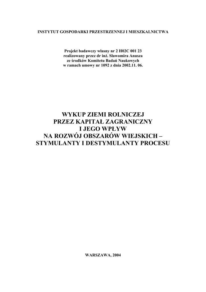 INSTYTUT GOSPODARKI PRZESTRZENNEJ I MIESZKALNICTWA Projekt badawczy własny nr 2 H02C 001 23 realizowany przez dr inż. Sławomira Anusza ze środków Komitetu Badań Naukowych w ramach umowy nr 1092 z dnia 2002.11. 06. WYKUP ZIEMI ROLNICZEJ PRZEZ KAPITAŁ ZAGRANICZNY I JEGO WPŁYW NA ROZWÓJ OBSZARÓW WIEJSKICH – STYMULANTY I DESTYMULANTY PROCESU WARSZAWA, 2004 SPIS TREŚCI 1. Wprowadzenie 2. 2.1. Wnioski z przeglądu literatury przedmiotu dotyczące prawnych i materialnych możliwości zakupu i dzierżawy ziemi przez cudzoziemców Prawne możliwości zakupu i dzierżawy ziemi przez obcokrajowców 2.2. Materialne możliwości zakupu ziemi przez cudzoziemców s. 7 s. 9 3.1. Ekonomiczne aspekty zjawiska lokalizacji gospodarstw będących w posiadaniu cudzoziemców Szacunki skali zjawiska 3. 3.1.1. 3.1.2. 3.2. 3.2.1. 3.2.2. 3.2.2.1. 3.2.2.2. s. 2 s. 3 Ocena skali zjawiska na podstawie sprawozdań MSWiA oraz MR i Rozwoju Wsi Szacunki skali zjawiska na podstawie opinii publikowanych w prasie i dyskusji politycznej Motywy ekonomiczne lokalizowania inwestycji zagranicznych w rolnictwo w Polsce Konkurencyjność uwarunkowań polskiego rolnictwa jako czynnik przyciągający obcy kapitał Badania własne rozmieszczenia nieruchomości i gospodarstw rolnych będących we władaniu osób fizycznych i prawnych angażujących w produkcję rolniczą kapitał zagraniczny i ich wpływu na rozwój obszarów wiejskich Opis metody 5.1. Ewidencja nieruchomości rolniczych z zaangażowanym kapitałem zagranicznym na podstawie danych z AWRSP Ewidencja gospodarstw rolniczych z zaangażowanym kapitałem zagranicznym na podstawie badań własnych Charakterystyka gospodarstw absorbujących inwestycje zagraniczne na podstawie wyników ankiety Charakterystyka struktur przestrzennych obszarów wiejskich s. 35 akumulujących inwestycje zagraniczne w gospodarstwa w Polsce oraz badanie wybranych przykładów Wpływ inwestycji zagranicznych w gospodarstwa rolnicze s. 40 na rozwój gmin Istota rozwoju lokalnego 5.2. Rozwój gmin na tle inwestycji zagranicznych w gospodarstwa rolne 3.2.2.3. 3.2.2.4. 4. 5. 2 6. 6.1. 6.1.1. 6.1.2. 6.1.2.1. 6.1.2.2. 6.2. 6.2.1. 6.2.2. 6.3. 6.3.1. 6.3.2. 7. 8. Polityka i interwencjonizm państwa dotyczące zagospodarowania s. 50 przestrzennego, restrukturyzacji rolnictwa i rozwoju obszarów wiejskich w badanych regionach Kierunki działań oraz programy wspierające proces restrukturyzacji rolnictwa w latach 1990 – 2002 z uwzględnieniem poprawy struktury obszarowej gospodarstw, modernizacji gospodarstw i poszczególnych kierunków produkcji, rozwoju funkcji pozarolniczych i aktywizacji obszarów wiejskich Diagnoza stanu Charakterystyka działań podejmowanych przez Ministerstwo Rolnictwa i Rozwoju Wsi na rzecz poprawy sytuacji w rolnictwie i na obszarach wiejskich Najważniejsze programy strategiczne w zakresie rolnictwa i obszarów wiejskich przyjęte po 1990 r kształtujące dotychczasowe procesy restrukturyzacji wsi i rolnictwa Programy strategiczne w zakresie rolnictwa i obszarów wiejskich, które będą wywierały wpływ na zagospodarowanie obszarów wiejskich i restrukturyzację rolnictwa w przyszłości Kierunki polityki przestrzennego zagospodarowania oraz restrukturyzacji wsi i rolnictwa w obszarach objętych badaniem wynikające z planowania przestrzennego Koncepcja polityki przestrzennego zagospodarowania kraju Analiza porównawcza kierunków polityki restrukturyzacji wsi i rolnictwa zawartych w Koncepcji polityki przestrzennego zagospodarowania kraju, Studiach zagospodarowania przestrzennego województw i Planach zagospodarowania przestrzennego województw Wymierny zakres interwencji państwa w proces restrukturyzacji wsi i rolnictwa Syntetyczne wyniki wdrażania programów i planów restrukturyzacji rolnictwa i obszarów wiejskich Interwencjonizm państwa w wymiarze regionalnym realizowany poprzez kredyty preferencyjne Przestrzenny model inwestycji w gospodarstwa rolnicze i wykupu s. 83 ziemi przez inwestorów zagranicznych Wnioski do polityki regionalnej s. 91 Bibliografia 3 SPIS TABEL Tabela 1. Zagospodarowanie gruntów Zasobu WRSP wg stanu na dzień 31.01.2003 w ha Tabela 2. Zgody Ministra Rolnictwa i Rozwoju Wsi na sprzedaż ziemi cudzoziemcom Tabela 3 Gminy i nieruchomości rolnicze z udziałem kapitału zagranicznego w podziale na grupy wielkościowe wg AWRSP (stan z grudnia 2002 r.) Tabela 4. Angażowanie się kapitału zagranicznego w gospodarstwa rolne w Polsce w latach 1991-2002 – liczba i powierzchnia transakcji dokonanych przez AWRSP do końca grudnia 2002 Tabela 5. Nieruchomości rolne z kapitałem zagranicznym według form organizacyjnych i rodzaju transakcji wg AWRSP Tabela 6. Statystyka odpowiedzi zawartych w ankiecie w porównaniu z danymi z AWRSP Tabela 7. Charakterystyka poprzedniej formy własności (podażowa strona transakcji)Tabela 8 Tabela 8. Formy organizacyjne gospodarstw i rodzaj transakcji Tabela 9. Kierunki produkcji gospodarstw z kapitałem zagranicznym Tabela 10 Struktura typologiczna gmin posiadających nieruchomości bądź gospodarstwa z udziałem kapitału zagranicznego Tabela 11 Macierz przepływów gmin pomiędzy klasami typologicznymi w latach 1988-2000 Tabela 12 Struktura linii kredytowych w przeliczeniu na 100 ha użytków rolnych gospodarstw indywidualnych w województwach w latach 1995-2002 Tabela 13 Wykaz cech dla roku 1988 Tabela 14 Wykaz cech dla roku 1996 Tabela 15 Klasyfikacja gmin z punktu widzenia teoretycznych możliwości wykupu ziemi 4 1. Wprowadzenie Wykup ziemi rolniczej przez inwestorów zagranicznych osiągnął w ostatniej dekadzie rangę wyzwania w wielu dyskusjach o charakterze społeczno-politycznym. Szczególnie dużo czasu poświęcono temu tematowi w dysputach sejmowych i polemice prasowej w latach 1999-2001, które poprzedzały końcową fazę negocjacji warunków akcesji Polski do Unii Europejskiej. W negocjacjach tych najwięcej emocji wywoływały ostatnio dwa tematy. Jednym była kwestia pełnego objęcia 