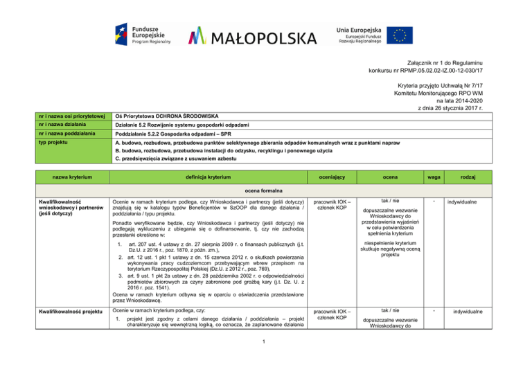 Załącznik nr 1 do Regulaminu konkursu nr RPMP.05.02.02-IZ.00-12-030/17 Kryteria przyjęto Uchwałą Nr 7/17 Komitetu Monitorującego RPO WM na lata 2014-2020 z dnia 26 stycznia 2017 r. nr i nazwa osi priorytetowej Oś Priorytetowa OCHRONA ŚRODOWISKA nr i nazwa działania Działanie 5.2 Rozwijanie systemu gospodarki odpadami nr i nazwa poddziałania Poddziałanie 5.2.2 Gospodarka odpadami – SPR typ projektu A. budowa, rozbudowa, przebudowa punktów selektywnego zbierania odpadów komunalnych wraz z punktami napraw B. budowa, rozbudowa, przebudowa instalacji do odzysku, recyklingu i ponownego użycia C. przedsięwzięcia związane z usuwaniem azbestu nazwa kryterium definicja kryterium oceniający ocena waga pracownik IOK – członek KOP tak / nie - rodzaj ocena formalna Kwalifikowalność wnioskodawcy i partnerów (jeśli dotyczy) Ocenie w ramach kryterium podlega, czy Wnioskodawca i partnerzy (jeśli dotyczy) znajdują się w katalogu typów Beneficjentów w SzOOP dla danego działania / poddziałania / typu projektu. Ponadto weryfikowane będzie, czy Wnioskodawca i partnerzy (jeśli dotyczy) nie podlegają wykluczeniu z ubiegania się o dofinansowanie, tj. czy nie zachodzą przesłanki określone w: art. 207 ust. 4 ustawy z dn. 27 sierpnia 2009 r. o finansach publicznych (j.t. Dz.U. z 2016 r., poz. 1870, z późn. zm.), 2. art. 12 ust. 1 pkt 1 ustawy z dn. 15 czerwca 2012 r. o skutkach powierzania wykonywania pracy cudzoziemcom przebywającym wbrew przepisom na terytorium Rzeczypospolitej Polskiej (Dz.U. z 2012 r., poz. 769), 3. art. 9 ust. 1 pkt 2a ustawy z dn. 28 października 2002 r. o odpowiedzialności podmiotów zbiorowych za czyny zabronione pod groźbą kary (j.t. Dz. U. z 2016 r. poz. 1541). Ocena w ramach kryterium odbywa się w oparciu o oświadczenia przedstawione przez Wnioskodawcę. Ocenie w ramach kryterium podlega, czy: 1. projekt jest zgodny z celami danego działania / poddziałania – projekt charakteryzuje się wewnętrzną logiką, co oznacza, że zaplanowane działania 1 dopuszczalne wezwanie Wnioskodawcy do przedstawienia wyjaśnień w celu potwierdzenia spełnienia kryterium niespełnienie kryterium skutkuje negatywną oceną projektu 1. Kwalifikowalność projektu indywidualne pracownik IOK – członek KOP tak / nie dopuszczalne wezwanie Wnioskodawcy do - indywidualne odpowiadają na zdefiniowany problem i pozwolą na osiągnięcie założonego celu, wpisującego się w cele danego działania / poddziałania, 2. projekt wpisuje się w typy projektów wskazane dla danego działania / poddziałania, zgodnie z SzOOP i regulaminem konkursu, 3. projekt jest zgodny z warunkami specyficznymi dla danego działania / poddziałania, określonymi w SzOOP i regulaminie konkursu, 4. projekt jest zgodny z przepisami prawa w zakresie ocen oddziaływania na środowisko (jeśli dotyczy), tj. ustawy z dn. 3 października 2008 r. o udostępnianiu informacji o środowisku i jego ochronie, udziale społeczeństwa w ochronie środowiska oraz o ocenach oddziaływania na środowisko (Dz.U. 2016 poz. 353) Ocena odbywa się w oparciu o dokumentację załączoną do wniosku o dofinansowanie. projekt jest zgodny z przepisami art. 65 ust. 6 i art. 125 ust. 3 lit. e) i f) Rozporządzenia Parlamentu Europejskiego i Rady (UE) nr 1303/2013 z dn. 17 grudnia 2013 r. tj. Wnioskodawca złożył oświadczenie, że: projekt nie został zakończony w rozumieniu art. 65 ust. 6, nie rozpoczął realizacji projektu przed dniem złożenia wniosku o dofinansowanie albo, że realizując projekt przed dniem złożenia wniosku, przestrzegał obowiązujących przepisów prawa dotyczących danej operacji (art. 125 ust. 3 lit. e), projekt nie obejmuje przedsięwzięć będących częścią operacji, które zostały objęte lub powinny były zostać objęte procedurą odzyskiwania zgodnie z art. 71 (trwałość operacji) w następstwie przeniesienia działalności produkcyjnej poza obszar objęty programem, 5. projekt (lub jego część) nie otrzymał dofinansowania z innych środków, Ocena w pkt. 5 i 6 odbywa się w oparciu o oświadczenia przedstawione przez Wnioskodawcę. 7. okres realizacji projektu jest zgodny z wymaganiami określonymi w regulaminie konkursu. Ocenie w ramach kryterium podlega poprawność formalna wniosku o dofinansowanie, tj. prawidłowość wypełniania poszczególnych pól, a także kompletność informacji wymaganych regulaminem konkursu oraz instrukcją wypełniania wniosku o dofinansowanie. Weryfikacji podlega: przedstawienia wyjaśnień w celu potwierdzenia spełnienia kryterium niespełnienie kryterium skutkuje negatywną oceną projektu 6. Kompletność oraz poprawność wypełnienia wniosku i załączników 1. 2. 3. Poprawność przyjętych wskaźników czy wniosek o dofinansowanie został wypełniony zgodnie z wyżej wymienioną instrukcją, czy zostały przedstawione wszystkie wymagane załączniki, czy załączniki zostały przygotowane zgodnie z wyżej wymienioną instrukcją. Ocenie w ramach kryterium podlega formalna poprawność przyjętych wskaźników: 1. pracownik IOK – członek KOP czy Wnioskodawca dokonał wyboru obligatoryjnych wskaźników dla danego działania / poddziałania, 2 tak / nie - indywidualne - indywidualne dopuszczalne wezwanie Wnioskodawcy do przedstawienia wyjaśnień w celu potwierdzenia spełnienia kryterium niespełnienie kryterium skutkuje negatywną oceną projektu pracownik IOK – członek KOP tak / nie dopuszczalne wezwanie Wnioskodawcy do przedstawienia wyjaśnień 2. 3. Pomoc publiczna czy Wnioskodawca wybrał wszystkie wskaźniki adekwatne ze względu na zakres projektu, czy Wnioskodawca przedstawił założenia dotyczące szacowania wartości wskaźników. Ocenie w ramach kryterium podlega, czy w projekcie występuje pomoc publiczna: 1. w przypadku, gdy pomoc publiczna nie występuje w projekcie – czy przedstawiono uzasadnienie dla braku spełnienia przesłanek występowania pomocy publicznej wskazanych w art. 107 Traktatu o fu