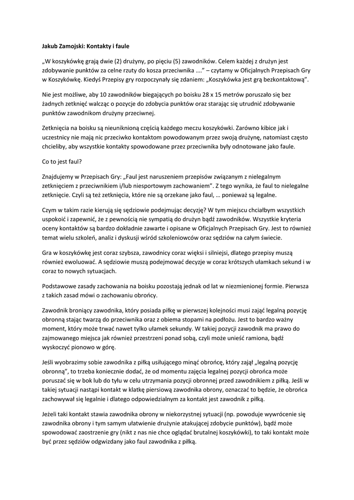 Jakub Zamojski: Kontakty i faule „W koszykówkę grają dwie (2) drużyny, po pięciu (5) zawodników. Celem każdej z drużyn jest zdobywanie punktów za celne rzuty do kosza przeciwnika ….” – czytamy w Oficjalnych Przepisach Gry w Koszykówkę. Kiedyś Przepisy gry rozpoczynały się zdaniem: „Koszykówka jest grą bezkontaktową”. Nie jest możliwe, aby 10 zawodników biegających po boisku 28 x 15 metrów poruszało się bez żadnych zetknięd walcząc o pozycje do zdobycia punktów oraz starając się utrudnid zdobywanie punktów zawodnikom drużyny przeciwnej. Zetknięcia na boisku są nieuniknioną częścią każdego meczu koszykówki. Zarówno kibice jak i uczestnicy nie mają nic przeciwko kontaktom powodowanym przez swoją drużynę, natomiast często chcieliby, aby wszystkie kontakty spowodowane przez przeciwnika były odnotowane jako faule. Co to jest faul? Znajdujemy w Przepisach Gry: „Faul jest naruszeniem przepisów związanym z nielegalnym zetknięciem z przeciwnikiem i/lub niesportowym zachowaniem”. Z tego wynika, że faul to nielegalne zetknięcie. Czyli są też zetknięcia, które nie są orzekane jako faul, … ponieważ są legalne. Czym w takim razie kierują się sędziowie podejmując decyzję? W tym miejscu chciałbym wszystkich uspokoid i zapewnid, że z pewnością nie sympatią do drużyn bądź zawodników. Wszystkie kryteria oceny kontaktów są bardzo dokładnie zawarte i opisane w Oficjalnych Przepisach Gry. Jest to również temat wielu szkoleo, analiz i dyskusji wśród szkoleniowców oraz sędziów na całym świecie. Gra w koszykówkę jest coraz szybsza, zawodnicy coraz więksi i silniejsi, dlatego przepisy muszą również ewoluowad. A sędziowie muszą podejmowad decyzje w coraz krótszych ułamkach sekund i w coraz to nowych sytuacjach. Podstawowe zasady zachowania na boisku pozostają jednak od lat w niezmienionej formie. Pierwsza z takich zasad mówi o zachowaniu obroocy. Zawodnik broniący zawodnika, który posiada piłkę w pierwszej kolejności musi zająd legalną pozycję obronną stając twarzą do przeciwnika oraz z obiema stopami na podłożu. Jest to bardzo ważny moment, który może trwad nawet tylko ułamek sekundy. W takiej pozycji zawodnik ma prawo do zajmowanego miejsca jak również przestrzeni ponad sobą, czyli może unieśd ramiona, bądź wyskoczyd pionowo w górę. Jeśli wyobrazimy sobie zawodnika z piłką usiłującego minąd obroocę, który zajął „legalną pozycję obronną”, to trzeba koniecznie dodad, że od momentu zajęcia legalnej pozycji obrooca może poruszad się w bok lub do tyłu w celu utrzymania pozycji obronnej przed zawodnikiem z piłką. Jeśli w takiej sytuacji nastąpi kontakt w klatkę piersiową zawodnika obrony, oznaczad to będzie, że obrooca zachowywał się legalnie i dlatego odpowiedzialnym za kontakt jest zawodnik z piłką. Jeżeli taki kontakt stawia zawodnika obrony w niekorzystnej sytuacji (np. powoduje wywrócenie się zawodnika obrony i tym samym ułatwienie drużynie atakującej zdobycie punktów), bądź może spowodowad zaostrzenie gry (nikt z nas nie chce oglądad brutalnej koszykówki), to taki kontakt może byd przez sędziów odgwizdany jako faul zawodnika z piłką. Może też zdarzyd się tak, że zawodnik ataku jest szybszy od obroocy i udaje mu się minąd obroocę, jednakże poruszający się w bok obrooca powoduje kontakt barkiem, biodrem lub kolanem – za taki kontakt odpowiedzialny jest obrooca i jemu może zostad odgwizdany faul. Musimy też w takich sytuacjach pamiętad, że czasami zawodnicy starają się „pomóc” sędziemu w podjęciu decyzji wywracając się bez żadnego kontaktu bądź po kontakcie zupełnie nieadekwatnym do zdarzenia. W takiej sytuacji sędzia może nawet ukarad takiego „teatralnego” zawodnika przewinieniem technicznym. Ale o takich „teatralnych” zagraniach oraz innych sytuacjach, które nie zawsze są zrozumiałe dla kibiców w następnych odcinkach… Źródło: www.polskikosz.pl
