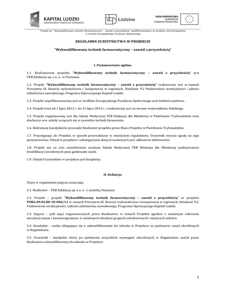 Projekt pt. "Wykwalifikowany technik farmaceutyczny – zawód z przyszłością" współfinansowany ze środków Unii Europejskiej w ramach Europejskiego Funduszu Społecznego REGULAMIN UCZESTNICTWA W PROJEKCIE ”Wykwalifikowany technik farmaceutyczny – zawód z przyszłością” I. Postanowienia ogólne. 1.1. Realizatorem projektu ”Wykwalifikowany technik farmaceutyczny – zawód z przyszłością” jest TEB Edukacja sp. z o. o. w Poznaniu. 1.2. Projekt ”Wykwalifikowany technik farmaceutyczny – zawód z przyszłością” realizowany jest w ramach Priorytetu IX. Rozwój wykształcenia i kompetencji w regionach, Działanie 9.2 Podniesienie atrakcyjności i jakości szkolnictwa zawodowego, Programu Operacyjnego Kapitał Ludzki. 1.3. Projekt współfinansowany jest ze środków Europejskiego Funduszu Społecznego oraz budżetu państwa. 1.4. Projekt trwa od 1 lipca 2012 r. do 31 lipca 2013 r. i realizowany jest na terenie województwa łódzkiego. 1.5. Projekt organizowany jest dla Szkoły Medycznej TEB Edukacja dla Młodzieży w Piotrkowie Trybunalskim oraz słuchaczy ww. szkoły uczących się w zawodzie technik farmaceuta. 1.6. Rekrutację kandydatów prowadzi Realizator projektu przez Biuro Projektu w Piotrkowie Trybunalskim. 1.7. Przystępując do Projektu w sposób przewidziany w niniejszym regulaminie, Uczestnik wyraża zgodę na jego postanowienia. Udział w projekcie i udostępnienie danych osobowych jest całkowicie dobrowolne. 1.8. Projekt ma na celu umożliwienie uczniom Szkoły Medycznej TEB Edukacja dla Młodzieży podwyższenie kwalifikacji zawodowych poza godzinami nauki. 1.9. Udział Uczestników w projekcie jest bezpłatny. II. Definicje. Użyte w regulaminie pojęcia oznaczają: 2.1. Realizator – TEB Edukacja sp. z o. o. z siedzibą Poznaniu 2.2. Projekt – projekt ”Wykwalifikowany technik farmaceutyczny – zawód z przyszłością” nr projektu POKL.09.02.00-10-006/11 w ramach Priorytetu IX. Rozwój wykształcenia i kompetencji w regionach, Działanie 9.2. Podniesienie atrakcyjności i jakości szkolnictwa zawodowego, Programu Operacyjnego Kapitał Ludzki. 2.3. Zajęcia – cykl zajęć organizowanych przez Realizatora w ramach Projektu zgodnie z ustalonym zakresem merytorycznym i harmonogramem, w ustalonych odrębnie grupach szkoleniowych i miejscach szkoleń. 2.4. Kandydat – osoba ubiegająca się o zakwalifikowanie do udziału w Projekcie na podstawie zasad określonych w Regulaminie. 2.5. Uczestnik – kandydat, który po spełnieniu wszystkich wymogów określonych w Regulaminie został przez Realizatora zakwalifikowany do udziału w Projekcie. 1 Projekt pt. "Wykwalifikowany technik farmaceutyczny – zawód z przyszłością" współfinansowany ze środków Unii Europejskiej w ramach Europejskiego Funduszu Społecznego III. Założenia i warunki uczestnictwa w projekcie. 3.1. Projekt przewiduje podwyższenie kwalifikacji zawodowych w zawodzie technik farmaceuta wśród słuchaczy Szkoły Medycznej TEB Edukacja dla Młodzieży poprzez udział w szkoleniach z zakresu: język angielski zawodowy w farmacji, przedstawiciel handlowy w branży farmaceutycznej, technologie IT w pracy technika farmacji. 3.2. Zajęcia dydaktyczne będą odbywały się na terenie województwa łódzkiego w trybie wieczorowym lub zaocznym. 3.3. Kandydaci muszą spełniać wymogi zawarte w dokumentacji projektu określające grupy docelowe. 3.4. Projekt dotyczy osób, o których jest mowa w punkcie 1.5 niniejszego regulaminu, tj. będących słuchaczami Szkoły Medycznej TEB Edukacja dla Młodzieży w Piotrkowie Trybunalskim na kierunku technik farmaceuta. 3.5. Oprócz kryteriów z punktu 3.4 Kandydat dodatkowo musi: - kompletnie wypełnić i czytelnie podpisać kwestionariusz, - wyrazić zgodę na przetwarzanie swoich danych osobowych na potrzeby realizacji projektu, - podpisać deklarację udziału w projekcie, - zapoznać się i zaakceptować treść regulaminu, - podpisać umowę uczestnictwa w projekcie w obecności pracownika Biura Projektu. 3.6. Rekrutacja będzie prowadzona w sposób ciągły, aż do zakwalifikowania planowanej liczby Uczestników. W razie rezygnacji ze szkolenia Uczestnika w terminie nie później niż przed upływem 20% prowadzonych zajęć, na jego miejsce zostanie przyjęta osoba z listy rezerwowej. 3.7. W przypadku większej liczby zgłoszeń Kandydatów oraz w celu zabezpieczenia frekwencji, na wypadek choroby lub zdarzeń losowych powodujących rezygnację Uczestników, przewiduje się utworzenie list rezerwowych (5 osób dla każdego kierunku szkolenia). 3.8. Proces rekrutacji prowadzony będzie odrębnie dla każdej z grup do momentu zamknięcia listy Uczestników. Szkolenia z zakresu branżowego języka angielskiego zorganizowane zostaną dla 3 grup 10 osobowych. Szkolenia z zakresu kompetencji przedstawiciela handlowego zorganizowane zostaną dla 2 grup 10 osobowych. Szkolenia z zakresu technologii IT wykorzystywanych w branży farmaceutycznej zorganizowane zostaną dla 2 grup 10 osobowych. Każdy cykl szkoleniowy obejmuje 50 godzin dydaktycznych zajęć. 3.9. Kwalifikacja Kandydatów odbywać się będzie na podstawie złożonych dokumentów zgłoszeniowych. 3.10. O zakwalifikowaniu Kandydata do udziału w Projekcie decyduje: - zgodność danych podanych przez Kandydata z założeniami projektu (kryterium grup docelowych), - poprawne wypełnienie i złożenie deklaracji zgłoszeniowej wraz z wymaganymi w regulaminie dokumentami, - kolejność zgłoszeń. 3.11. Organizator zakłada możliwość uczestnictwa Kandydata w więcej niż jednym szkoleniu. 3.12. Zgłoszenia dokonywane z naruszeniem powyższych postanowień nie będą rozpatrywane, a złożone przez Kandydata dokumenty aplikacyjne nie podlegają zwrotowi. 3.13. Każdy zakwalifikowany Kandydat zostanie powiadomiony o wynikach rekrutacji drogą pisemną, mailową lub telefonicznie. 3.14. Zajęcia będą odbywać się zgodnie z harmonogramem określonym przed rozpoczęciem szkolen
