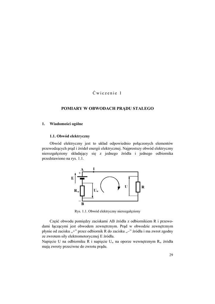 Ćwiczenie 1 POMIARY W OBWODACH PRĄDU STAŁEGO 1. Wiadomości ogólne 1.1. Obwód elektryczny Obwód elektryczny jest to układ odpowiednio połączonych elementów przewodzących prąd i źródeł energii elektrycznej. Najprostszy obwód elektryczny nierozgałęziony składający się z jednego źródła i jednego odbiornika przedstawiono na rys. 1.1. Rys. 1.1. Obwód elektryczny nierozgałęziony Część obwodu pomiędzy zaciskami AB źródła z odbiornikiem R i przewodami łączącymi jest obwodem zewnętrznym. Prąd w obwodzie zewnętrznym płynie od zacisku „+” przez odbiornik R do zacisku „−” źródła i ma zwrot zgodny ze zwrotem siły elektromotorycznej E źródła. Napięcie U na odbiorniku R i napięcie Uw na oporze wewnętrznym Rw źródła mają zwroty przeciwne do zwrotu prądu. 29 1.2. Źródła i odbiorniki Źródła są to maszyny i urządzenia w których następuje zamiana różnego rodzaju energii na energię elektryczną, np. prądnice - energii mechanicznej na elektryczną, fotoogniwa - energii świetlnej na elektryczną, termoogniwa - energii cieplnej na elektryczną itp. Podstawowymi wielkościami charakteryzującymi źródła prądu stałego są: E - siła elektromotoryczna, In - prąd znamionowy, Rw - rezystancja wewnętrzna. Odbiorniki są to maszyny, urządzenia i aparaty w których następuje zamiana energii elektrycznej na inny rodzaj energii, np.: silnik - energii elektrycznej na mechaniczną, grzejnik - energii elektrycznej na cieplną, akumulator w procesie ładowania - energii elektrycznej na chemiczną itp. Podstawowymi wielkościami charakteryzującymi odbiorniki są: Un - napięcie znamionowe, In - prąd znamionowy, Pn - moc znamionowa. 1.3. Podstawowe prawa dotyczące obwodów elektrycznych Prawo Ohma: prąd I płynący w obwodzie jest wprost proporcjonalny do napięcia zasilającego U i odwrotnie proporcjonalny do rezystancji R obwodu: I= U R U = I⋅R , R = lub U . I (1.1.) Prawa Kirchhoffa. Pierwsze prawo Kirchhoffa: suma algebraiczna prądów w węźle (węzeł punkt w obwodzie w którym zbiegają się co najmniej trzy prądy) jest równa zeru, tzn. suma prądów wpływających do węzła równa jest sumie prądów wypływających ∑ Ik = 0 . (1.2) k W zależności (1.2), prądy wpływające do węzła uwzględnia się ze znakiem „+” a wypływające z węzła ze znakiem „−”. 30 Drugie prawo Kirchhoffa: algebraiczna suma sił elektromotorycznych i napięć (na elementach pasywnych) w każdym obwodzie zamkniętym - oczku jest równa zeru ∑ (E k + Uk ) = 0 . (1.3) k W celu poprawnego zapisu drugiego prawa Kirchhoffa dla konkretnego obwodu zamkniętego z zastrzałkowanymi napięciami i siłami elektromotorycznymi, należy przyjąć za dodatni dowolny obieg obwodu, np. zgodny z obiegiem wskazówek zegara. Napięcia i siły elektromotoryczne mające zwroty zgodne z przyjętym obiegiem w obwodzie, w zależności (1.3) uwzględnia się ze znakiem „+” a niezgodne ze znakiem „−”. Dla obwodu elektrycznego z rys. 1.1, równanie (1.3) miałoby postać: + E − U − Uw = 0 . (1.4) Równanie (1.4) przedstawione w postaci: U = E − Uw = E − I ⋅ R w (1.5) jest równaniem charakterystyki zewnętrznej źródła, ujmującej zależność napięcia U na zaciskach źródła w funkcji prądu obciążenia I (rys. 1.2). Rys. 1.2. Charakterystyka zewnętrzna U = f(I) źródła prądu stałego 1.4. Obwody liniowe i nieliniowe Obwód jest liniowy jeżeli jego rezystancja jest stała (rys. 1.3a) a nieliniowy, jeżeli jego rezystancja zmienia się, np. przy zmianach temperatury, wskutek przepływu prądu elektrycznego (rys. 1.3b). 31 Rys. 1.3. Charakterystyki napięciowo - prądowe U = f(I): a) odbiornika liniowego; b) odbiornika nieliniowego Przykładem odbiornika nieliniowego jest żarówka elektryczna. 1.5. Moc prądu elektrycznego Moc prądu elektrycznego jest to zdolność maszyny, urządzenia czy aparatu do wykonania pracy. Dla odbiornika rezystancyjnego, moc może być opisana zależnościami: P = U ⋅ I , P = I2 ⋅ R , P= U2 . R (1.6) Dla odbiornika o stałej rezystancji, moc jest proporcjonalna do kwadratu napięcia. Rys. 1.4. Zależność mocy odbiornika liniowego od napięcia zasilającego 1.6. Łączenie oporów Połączeniem szeregowym elementów obwodu elektrycznego nazywamy takie połączenie, w którym przez wszystkie połączone elementy płynie ten sam prąd (rys. 1.5a). 32 Rys. 1.5. Połączenie rezystancji: a) szeregowe, b) równoległe, c) szeregowo-równoległe Rezystancję zastępczą wyznacza się z zależności: R z = R1 + R 2 . (1.7) Przy połączeniu równoległym, wszystkie elementy znajdują się pod działaniem tego samego napięcia (rys. 1.5b). Rezystancję zastępczą wyznacza się z zależności: R ⋅R 1 1 1 = + lub R z = 1 2 . R z R1 R 2 R1 + R 2 (1.8) W połączeniu szeregowo-równoległym (nazywane jest również połączeniem mieszanym) występują elementy połączone szeregowo i elementy równoległe. Dla układu oporów z rys. 1.5c, rezystancję zastępczą określa zależność: R z = R1 + R2 ⋅ R3 . R2 + R3 (1.9) 1.7. Pomiary napięcia, prądu i mocy Do pomiarów napięcia i prądu w obwodach prądu stałego stosuje się przyrządy magnetoelektryczne, natomiast do pomiaru mocy - watomierze ferrodynamiczne. Sposób włączenia w obwód elektryczny poszczególnych przyrządów przedstawiono na rys. 1.6. Rys. 1.6. Włączenie woltomierza, amperomierza i watomierza w obwód elektryczny 33 Moc odbiornika można również określić z zależności (1.6) na podstawie pomiarów napięcia i prądu. 2. Wykonanie ćwiczenia Część praktyczna ćwiczenia obejmuje: − sprawdzenie I i II prawa Kirchhoffa, − łączenie oporów, − badanie odbiorników liniowych i nieliniowych. 2.1. Sprawdzenie I i II prawa Kirchhoffa Zestawić układ pomiarowy przedstawiony na rys. 1.7. Rys. 1.7. Układ pomiarowy do badania rozgałęzionego obwodu elektrycznego Zapisać wartości rezystancji oporników włączonych w ob