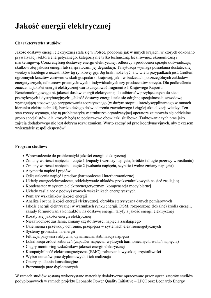 Jakość energii elektrycznej Charakterystyka studiów: Jakość dostawy energii elektrycznej stała się w Polsce, podobnie jak w innych krajach, w których dokonano prywatyzacji sektora energetycznego, kategorią nie tylko techniczną, lecz również ekonomiczną i marketingową. Coraz częściej dostawcy energii elektrycznej, odbiorcy i producenci sprzętu doświadczają skutków złej jakości energii lub są sprawcami jej degradacji. Ta sytuacja wymaga posiadania dostatecznej wiedzy u każdego z uczestników tej rynkowej gry. Jej brak może być, a w wielu przypadkach jest, źródłem ogromnych kosztów zarówno w skali gospodarki krajowej, jak i w budżetach poszczególnych zakładów energetycznych, odbiorców przemysłowych i indywidualnych czy producentów sprzętu. Dla podkreślenia znaczenia jakości energii elektrycznej warto zacytować fragment z I Krajowego Raportu Benchmarkingowego nt. jakości dostaw energii elektrycznej do odbiorców przyłączonych do sieci przesyłowych i dystrybucyjnych: „Jakość dostawy energii stała się odrębną specjalnością zawodową wymagającą stosownego przygotowania teoretycznego (w dużym stopniu interdyscyplinarnego w ramach kierunku elektrotechniki), bardzo dużego doświadczenia zawodowego i ciągłej aktualizacji wiedzy. Ten stan rzeczy wymaga, aby tą problematyką w strukturze organizacyjnej operatora zajmowało się oddzielne grono specjalistów, dla których będą to podstawowe obowiązki służbowe. Traktowanie tych prac jako zajęcia dodatkowego nie jest dobrym rozwiązaniem. Warto zacząć od prac koordynacyjnych, aby z czasem wykształcić zespół ekspertów”. Program studiów: Wprowadzenie do problematyki jakości energii elektrycznej Zmiany wartości napięcia – część 1 (zapady i wzrosty napięcia, krótkie i długie przerwy w zasilaniu) Zmiany wartości napięcia – część 2 (wahania napięcia, szybkie i wolne zmiany napięcia) Asymetria napięć i prądów Odkształcenia napięć i prądów (harmoniczne i interharmoniczne) Układy energoelektroniczne, oddziaływanie układów przekształtnikowych na sieć zasilającą Kondensator w systemie elektroenergetycznym, kompensacja mocy biernej Układy zasilające o podwyższonych wskaźnikach energetycznych Pomiary wskaźników jakości energii Analiza i ocena jakości energii elektrycznej, obróbka statystyczna danych pomiarowych Jakość energii elektrycznej w warunkach rynku energii, DSM, rozproszone (lokalne) źródła energii, zasady formułowania kontraktów na dostawę energii, taryfy a jakość energii elektrycznej Koszty złej jakości energii elektrycznej Niezawodność zasilania, zmiany częstotliwości napięcia zasilającego Uziemienia i przewody ochronne, przepięcia w systemach elektroenergetycznych Systemy gromadzenia energii Filtracja pasywna i aktywna, dynamiczna stabilizacja napięcia Lokalizacja źródeł zaburzeń (zapadów napięcia, wyższych harmonicznych, wahań napięcia) Ciągły monitoring wskaźników jakości energii elektrycznej Kompatybilność elektromagnetyczna (EMC), zaburzenia wysokiej częstotliwości Wybór tematów prac dyplomowych i ich realizacja Cztery spotkania konsultacyjne Prezentacja prac dyplomowych W ramach studiów zostaną wykorzystane materiały dydaktyczne opracowane przez ogranizatorów studiów podyplomowych w ramach projektu Leonardo Power Quality Initiative – LPQI oraz Leonardo Energy W ramach studiów zostaną wykorzystane materiały dydaktyczne opracowane przez ogranizatorów studiów podyplomowych w ramach projektu Leonardo Power Quality Initiative – LPQI oraz Leonardo Energy Academy. Projekt LPQI, sponsorowany przez Komisję Europejską, stworzył podwaliny edukacji przez Internet w dziedzinie jakości energii elektrycznej. Platforma Leonardo Energy Academy jest jedynym w swoim rodzaju centrum informacyjno-edukacyjnym dostępnym on-line. Jest ona dedykowana profesjonalistom zajmującym się na co dzień problemami wytwarzania energii elektrycznej, zarządzania energią, jakością energii czy efektywnością energetyczną. Sylwetka absolwenta: Studia podyplomowe i kursy profesjonalne (poszczególne moduły wykładowe) przeznaczone są przede wszystkim dla pracowników przedsiębiorstw elektroenergetyki zawodowej (zarówno działów technicznych, jak i obsługi klientów), przedsiębiorstw elektroinstalacyjnych, odbiorców energii elektrycznej z sektora przemysłu i usług, producentów sprzętu oraz pracowników działów marketingowych firm oferujących na rynku sprzęt elektrotechniczny, elektroniczny i informatyczny. Celem studiów jest przekazanie inżynierom podstaw rozumienia zagadnień jakości energii elektrycznej z punktu widzenia odbiorcy, operatora systemu elektroenergetycznego, handlowca oraz producenta urządzeń elektrotechnicznych i elektronicznych. W roku 2005/2006 Katedra Automatyki Napędu i Urządzeń Przemysłowych (obecnie Katedra Energoelektroniki i Automatyki Systemów Przetwarzania Energii) uczestniczyła w realizacji europejskiego projektu dydaktycznego Leonardo Power Quality Initiative Vocational Education System – LPQIVES, dotyczącego jakości energii elektrycznej. Jednym z efektów tego projektu było wdrożenie – na bazie powyższych studiów podyplomowych – międzynarodowego europejskiego standardu nauczania w tej dziedzinie i uruchomienie w kilku krajach europejskich (Węgry, Rumunia, Niemcy, Włochy, Belgia, Czechy) systemu szkoleń uprawniających do uzyskania – po zdanym międzynarodowym teście – stopnia zawodowego specjalisty w dziedzinie jakości energii elektrycznej. Organizatorzy studiów podyplomowych AGH są w gronie komitetu sterującego europejskiego systemu edukacji. Czas trwania: 2 semestry (od XI 2016 r. do XII 2017 r.) Termin zgłoszeń: do 31 X 2016 r. Wymagane dokumenty: kwestionariusz osobowy, podanie o przyjecie na studia dyplom ukończenia studiów technicznych (uwierzytelniona kopia). Tryb zgłoszeń: kolejność zgłoszeń Liczba miejsc