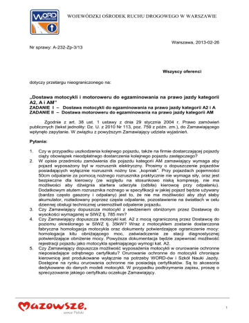 WOJEWÓDZKI OŚRODEK RUCHU DROGOWEGO W WARSZAWIE Warszawa, 2013-02-26 Nr sprawy: A-232-Zp-3/13 Wszyscy oferenci dotyczy przetargu nieograniczonego na: „Dostawa motocykli i motoroweru do egzaminowania na prawo jazdy kategorii A2, A i AM” ZADANIE I – Dostawa motocykli do egzaminowania na prawo jazdy kategorii A2 i A ZADANIE II – Dostawa motoroweru do egzaminowania na prawo jazdy kategorii AM Zgodnie z art. 38 ust. 1 ustawy z dnia 29 stycznia 2004 r. Prawo zamówień publicznych (tekst jednolity: Dz. U. z 2010 Nr 113, poz. 759 z późn. zm.), do Zamawiającego wpłynęło zapytanie. W związku z powyższym Zamawiający udziela wyjaśnień. Pytania: 1. 2. 3. 4. 5. Czy w przypadku uszkodzenia kolejnego pojazdu, także na firmie dostarczającej pojazdy ciąży obowiązek nieodpłatnego dostarczenia kolejnego pojazdu zastępczego? W opisie przedmiotu zamówienia dla pojazdu kategorii AM zamawiający wymaga aby pojazd wyposażony był w rozrusznik elektryczny. Prosimy o dopuszczenie pojazdów posiadających wyłącznie rozrusznik nożny tzw. „kopniak”. Przy pojazdach pojemności 50cm odpalanie za pomocą nożnego rozrusznika praktycznie nie wymaga siły, oraz jest bezpieczne dla kierowcy (ze względu na stosunkowo niską kompresję, nie ma możliwości aby dźwignia startera uderzyła (odbiła) kierowcę przy odpalaniu). Dodatkowym atutem rozrusznika nożnego w specyfikacji w jakiej pojazd będzie używany (bardzo często gaszony i odpalany) jest to, że nie ma możliwości aby zbyt słaby akumulator, rozładowany poprzez częste odpalanie, pozostawienie na światłach w celu dziennej obsługi technicznej uniemożliwił odpalenie pojazdu. Czy Zamawiający dopuszcza motocykl z siedzeniem obniżonym przez Dostawcę do wysokości wymaganej w SIWZ tj. 785 mm? Czy Zamawiający dopuszcza motocykl kat. A2 z mocą ograniczoną przez Dostawcę do poziomu określonego w SIWZ tj. 35kW? Wraz z motocyklem zostanie dostarczona fabryczna homologacja motocykla oraz dokumenty potwierdzające ograniczenie mocy: homologacja kitu obniżającego moc, zaświadczenie ze stacji diagnostycznej potwierdzające obniżenie mocy. Powyższa dokumentacja będzie zapewniać możliwość rejestracji pojazdu jako motocykla spełniającego wymogi kat. A2. Czy Zamawiający dopuszcza możliwość wyposażenia motocykli w orurowanie ochronne nieposiadające odrębnego certyfikatu? Orurowanie ochronne do motocykli chroniące kierownicę jest produkowane wyłącznie na potrzeby WORD-ów i Szkół Nauki Jazdy. Dostępne na rynku orurowania ochronne nie posiadają certyfikatów. Są to akcesoria dedykowane do danych modeli motocykli. W przypadku podtrzymania zapisu, proszę o sprecyzowanie jakiego certyfikatu oczekuje Zamawiający. 1 WOJEWÓDZKI OŚRODEK RUCHU DROGOWEGO W WARSZAWIE Odpowiedzi: 1. 2. 3. 4. 5. Zamawiający wyjaśnia, że zapis dotyczy tylko jednego pojazdu zastępczego w zakresie kat. A, A2. Zamawiający dopuszcza dwa niezależne systemy uruchomienia silnika łącznie, rozrusznik elektryczny oraz rozrusznik nożny ze względu na alternatywne możliwości uruchomienia silnika. Wysokość siedzenia powinna być zgodna z danymi technicznymi motocykla zawartymi w ofercie handlowej. Zamawiający nie dopuszcza indywidualnych przeróbek. Moc silnika musi wynikać ze świadectwa homologacji silnika. Zamawiający nie dopuszcza indywidualnych przeróbek. Zamawiający doprecyzowując zapis stwierdza, że wymaga potwierdzenia przez jednostkę uprawnioną (np. PIMOT, DEKRA, TUV) spełnienia wymogów bezpieczeństwa przez orurowanie ochronne z załączonym i potwierdzonym sprawozdaniem z badań. 2