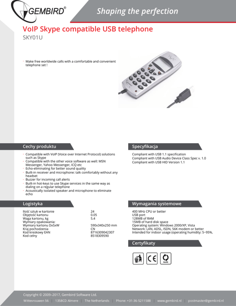 VoIP Skype compatible USB telephone SKY01U - Make free worldwide calls with a comfortable and convenient telephone set ! Cechy produktu Specyfikacja - Compatible with VoIP (Voice over Internet Protocol) solutions such as Skype - Compatible with the other voice software as well: MSN Messenger, Yahoo Messenger, ICQ etc - Echo-eliminating for better sound quality - Built-in receiver and microphone: talk comfortably without any headset - Buzzer for incoming call alerts - Built-in hot-keys to use Skype services in the same way as dialing on a regular telephone - Acoustically isolated speaker and microphone to eliminate echo Compliant with USB 1.1 specification Compliant with USB Audio Device Class Spec v. 1.0 Compliant with USB HID Version 1.1 Logistyka Wymagania systemowe Ilość sztuk w kartonie Objętość kartonu Waga kartonu, kg Wymiary opakowania: Wymiary kartonu DxSxW Kraj pochodzenia Kod kreskowy EAN Kod celny 24 0.05 5.4 400 MHz CPU or better USB port 128MB of RAM 15MB of hard disk space Operating system: Windows 2000/XP, Vista Network: LAN, ADSL, ISDN, 56K modem or better Intended for indoor usage (operating humidity: 5~95%, 590x340x250 mm CN 8716309042307 8518309590 Certyfikaty Copyright © 2009–2017, Gembird Software Ltd. ! " # $ ! "