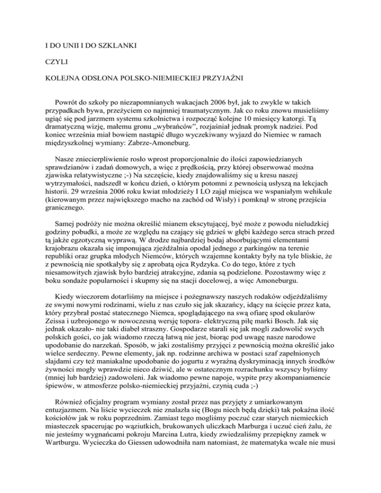 I DO UNII I DO SZKLANKI CZYLI KOLEJNA ODSŁONA POLSKO-NIEMIECKIEJ PRZYJAŹNI Powrót do szkoły po niezapomnianych wakacjach 2006 był, jak to zwykle w takich przypadkach bywa, przeżyciem co najmniej traumatycznym. Jak co roku znowu musieliśmy ugiąć się pod jarzmem systemu szkolnictwa i rozpocząć kolejne 10 miesięcy katorgi. Tą dramatyczną wizję, małemu gronu „wybrańców”, rozjaśniał jednak promyk nadziei. Pod koniec września miał bowiem nastąpić długo wyczekiwany wyjazd do Niemiec w ramach międzyszkolnej wymiany: Zabrze-Amoneburg. Nasze zniecierpliwienie rosło wprost proporcjonalnie do ilości zapowiedzianych sprawdzianów i zadań domowych, a więc z prędkością, przy której obserwować można zjawiska relatywistyczne ;-) Na szczęście, kiedy znajdowaliśmy się u kresu naszej wytrzymałości, nadszedł w końcu dzień, o którym potomni z pewnością usłyszą na lekcjach historii. 29 września 2006 roku kwiat młodzieży I LO zajął miejsca we wspaniałym wehikule (kierowanym przez największego macho na zachód od Wisły) i pomknął w stronę przejścia granicznego. Samej podróży nie można określić mianem ekscytującej, być może z powodu nieludzkiej godziny pobudki, a może ze względu na czający się gdzieś w głębi każdego serca strach przed tą jakże egzotyczną wyprawą. W drodze najbardziej bodaj absorbującymi elementami krajobrazu okazała się imponująca zjeżdżalnia opodal jednego z parkingów na terenie republiki oraz grupka młodych Niemców, których wzajemne kontakty były na tyle bliskie, że z pewnością nie spotkałyby się z aprobatą ojca Rydzyka. Co do tego, które z tych niesamowitych zjawisk było bardziej atrakcyjne, zdania są podzielone. Pozostawmy więc z boku sondaże popularności i skupmy się na stacji docelowej, a więc Amoneburgu. Kiedy wieczorem dotarliśmy na miejsce i pożegnawszy naszych rodaków odjeżdżaliśmy ze swymi nowymi rodzinami, wielu z nas czuło się jak skazańcy, idący na ścięcie przez kata, który przybrał postać statecznego Niemca, spoglądającego na swą ofiarę spod okularów Zeissa i uzbrojonego w nowoczesną wersję topora- elektryczną piłę marki Bosch. Jak się jednak okazało- nie taki diabeł straszny. Gospodarze starali się jak mogli zadowolić swych polskich gości, co jak wiadomo rzeczą łatwą nie jest, biorąc pod uwagę nasze narodowe upodobanie do narzekań. Sposób, w jaki zostaliśmy przyjęci z pewnością można określić jako wielce serdeczny. Pewne elementy, jak np. rodzinne archiwa w postaci szaf zapełnionych slajdami czy też maniakalne upodobanie do jogurtu z wyraźną dyskryminacją innych środków żywności mogły wprawdzie nieco dziwić, ale w ostatecznym rozrachunku wszyscy byliśmy (mniej lub bardziej) zadowoleni. Jak wiadomo pewne napoje, wypite przy akompaniamencie śpiewów, w atmosferze polsko-niemieckiej przyjaźni, czynią cuda ;-) Również oficjalny program wymiany został przez nas przyjęty z umiarkowanym entuzjazmem. Na liście wycieczek nie znalazła się (Bogu niech będą dzięki) tak pokaźna ilość kościołów jak w roku poprzednim. Zamiast tego mogliśmy poczuć czar starych niemieckich miasteczek spacerując po wąziutkich, brukowanych uliczkach Marburga i uczuć cień żalu, że nie jesteśmy wygnańcami pokroju Marcina Lutra, kiedy zwiedzaliśmy przepiękny zamek w Wartburgu. Wycieczka do Giessen udowodniła nam natomiast, że matematyka wcale nie musi być nudna, gdy z dziecięcą radością i zapałem układaliśmy klocuszki w Mathematikum. Najbardziej atrakcyjnym punktem wymiany była oczywiście wycieczka do winiarni, gdzie (o zgrozo!) w obecności nauczycieli degustowaliśmy różnorodne rodzaje win, udając, że wcale nie wiemy, iż alkohol dozwolony jest od lat 18. Rządnych wiedzy, którzy pragną uzyskać szczegółowe informacje na temat zwiedzanych przez nas obiektów, odsyłam do przewodników po Frankfurcie, Marburgu, Giessen czy Wartburgu, natomiast tych, którzy od zapachu farby drukarskiej wolą poczuć smak choćby kilku spośród 5000 tysięcy niemieckich gatunków szlachetnego, złocistego trunku z pianką, zachęcam do odwiedzenia kraju za Odrą w ramach kolejnej wymiany, by na słowo „Dojczland” móc odpowiedzieć inaczej niż: KEINE AHNUNG! Anna Papiernik