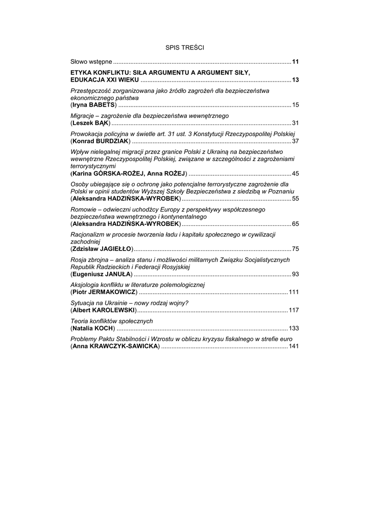 SPIS TREŚCI Słowo wstępne ........................................................................................................ 11 ETYKA KONFLIKTU: SIŁA ARGUMENTU A ARGUMENT SIŁY, EDUKACJA XXI WIEKU ........................................................................................ 13 Przestępczość zorganizowana jako źródło zagrożeń dla bezpieczeństwa ekonomicznego państwa (Iryna BABETS) ..................................................................................................... 15 Migracje – zagrożenie dla bezpieczeństwa wewnętrznego (Leszek BĄK) ......................................................................................................... 31 Prowokacja policyjna w świetle art. 31 ust. 3 Konstytucji Rzeczypospolitej Polskiej (Konrad BURDZIAK) ............................................................................................. 37 Wpływ nielegalnej migracji przez granice Polski z Ukrainą na bezpieczeństwo wewnętrzne Rzeczypospolitej Polskiej, związane w szczególności z zagrożeniami terrorystycznymi (Karina GÓRSKA-ROŻEJ, Anna ROŻEJ) ............................................................ 45 Osoby ubiegające się o ochronę jako potencjalne terrorystyczne zagrożenie dla Polski w opinii studentów Wyższej Szkoły Bezpieczeństwa z siedzibą w Poznaniu (Aleksandra HADZIŃSKA-WYROBEK) ................................................................ 55 Romowie – odwieczni uchodźcy Europy z perspektywy współczesnego bezpieczeństwa wewnętrznego i kontynentalnego (Aleksandra HADZIŃSKA-WYROBEK) ................................................................ 65 Racjonalizm w procesie tworzenia ładu i kapitału społecznego w cywilizacji zachodniej (Zdzisław JAGIEŁŁO) ............................................................................................ 75 Rosja zbrojna – analiza stanu i możliwości militarnych Związku Socjalistycznych Republik Radzieckich i Federacji Rosyjskiej (Eugeniusz JANUŁA) ............................................................................................ 93 Aksjologia konfliktu w literaturze polemologicznej (Piotr JERMAKOWICZ) ....................................................................................... 111 Sytuacja na Ukrainie – nowy rodzaj wojny? (Albert KAROLEWSKI) ........................................................................................ 117 Teoria konfliktów społecznych (Natalia KOCH) .................................................................................................... 133 Problemy Paktu Stabilności i Wzrostu w obliczu kryzysu fiskalnego w strefie euro (Anna KRAWCZYK-SAWICKA) .......................................................................... 141 Bezpieczeństwo a stres ekstremalny (Roman KRAWCZYŃSKI).................................................................................... 151 Polskie Siły Zbrojne w misjach pokojowych i rozjemczych (Józef KUBICA) .................................................................................................... 167 Bakterie zasiedlające filtry węglowe w Zakładzie Uzdatniania Wody w Goczałkowicach (Anna LIS, Paulina WAWRZYNIAK) ................................................................... 173 Ochotnicza Straż Pożarna i jej wpływ na bezpieczeństwo (Monika ŁUSZKIEWICZ) ...................................................................................... 183 Ignorance and insignificance make us safe? – Poland’s (in)experience in countering terrorism in the XXI century (Ryszard M. MACHNIKOWSKI, Kacper RĘKAWEK) ........................................ 197 Pozytywne aspekty błędów nauczycieli na podstawie opinii uczniów (Małgorzata MĄDRY-KUPIEC) ............................................................................ 215 Negocjacje międzynarodowe w wymiarze etycznym (Marlena NIEMIEC) .............................................................................................. 229 Systemy bezpieczeństwa w projektowaniu architektonicznym budynków sądowych (Kamila PIĘTKA).… ............................................................................................. 245 Pojęcie urządzenia przesyłowego – zagadnienia doktrynalne i orzecznicze (Łukasz Bartłomiej PILARZ) ............................................................................... 255 Bezpieczeństwo mikrobiologiczne i chemiczne wody pitnej – analiza zjawiska (Marta PRÓBA) .................................................................................................... 273 Przyczyny masowych imigracji ludności oraz ich wpływ na bezpieczeństwo (Małgorzata REJMAN-KAROLEWSKA) ............................................................. 283 Analiza wystąpienia zagrożeń naturalnych na przykładzie analizy zagrożeń związanych z burzami na terenie powiatu gliwickiego i miasta Gliwice (Jakub STRADOMSKI, Marcin KRAUSE) .......................................................... 293 Stosowanie środków przymusu bezpośredniego a zapewnienie bezpieczeństwa i porządku prawnego w działaniach Policji (Andrzej SZYMAŃSKI) ........................................................................................ 307 Edukacja w zakresie Narodowego Programu Ochrony Infrastruktury Krytycznej (Paulina WIĄCZEK) ............................................................................................. 321 Terroryzm XXI wieku a zagrożenie bezpieczeństwa państwa – próba charakterystyki (Paulina WIĄCZEK) ............................................................................................. 331 Lekarski obowiązek zawiadamiania o przestępstwie a bezpieczeństwo państwa (Iwona WRZEŚNIEWSKA-WAL) ......................................................................... 341 Planowianie rowoju państw członkowskich Unii Europejskiej w obliczu kryzysu gospodarczego (Tomasz ZABOREK) ..........................................................................