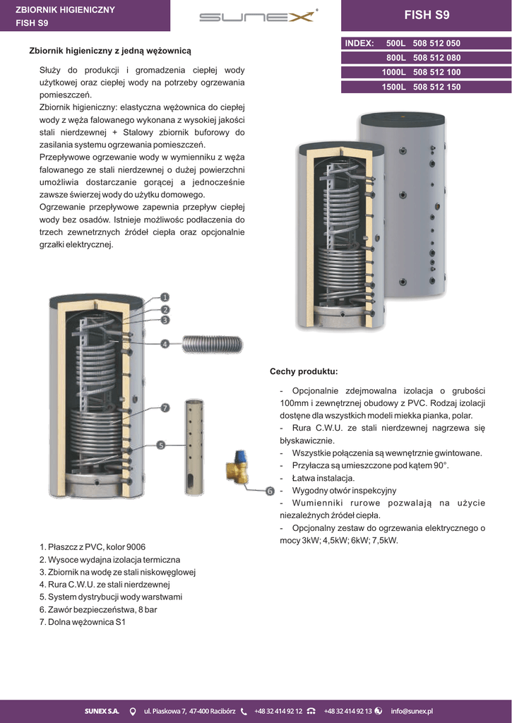 ZBIORNIK HIGIENICZNY FISH S9 FISH S9 INDEX: Zbiornik higieniczny z jedną wężownicą 500L 508 512 050 800L 508 512 080 Służy do produkcji i gromadzenia ciepłej wody użytkowej oraz ciepłej wody na potrzeby ogrzewania pomieszczeń. Zbiornik higieniczny: elastyczna wężownica do ciepłej wody z węża falowanego wykonana z wysokiej jakości stali nierdzewnej + Stalowy zbiornik buforowy do zasilania systemu ogrzewania pomieszczeń. Przepływowe ogrzewanie wody w wymienniku z węża falowanego ze stali nierdzewnej o dużej powierzchni umożliwia dostarczanie gorącej a jednocześnie zawsze świerzej wody do użytku domowego. Ogrzewanie przepływowe zapewnia przepływ ciepłej wody bez osadów. Istnieje możliwośc podłaczenia do trzech zewnetrznych źródeł ciepła oraz opcjonalnie grzałki elektrycznej. 1000L 508 512 100 1500L 508 512 150 Cechy produktu: 1. Płaszcz z PVC, kolor 9006 2. Wysoce wydajna izolacja termiczna 3. Zbiornik na wodę ze stali niskowęglowej 4. Rura C.W.U. ze stali nierdzewnej 5. System dystrybucji wody warstwami 6. Zawór bezpieczeństwa, 8 bar 7. Dolna wężownica S1 - Opcjonalnie zdejmowalna izolacja o grubości 100mm i zewnętrznej obudowy z PVC. Rodzaj izolacji dostęne dla wszystkich modeli miekka pianka, polar. - Rura C.W.U. ze stali nierdzewnej nagrzewa się błyskawicznie. - Wszystkie połączenia są wewnętrznie gwintowane. - Przyłacza są umieszczone pod kątem 90°. - Łatwa instalacja. - Wygodny otwór inspekcyjny - Wumienniki rurowe pozwalają na użycie niezależnych źródeł ciepła. - Opcjonalny zestaw do ogrzewania elektrycznego o mocy 3kW; 4,5kW; 6kW; 7,5kW. ZBIORNIK HIGIENICZNY FISH S9 FISH S9 P T N,O L M h K R,S I hi H G F E D U A,B,C S9 500/28 Ø S9 1500/50 Pojemność L 500 800 1000 1500 L 480/20 775/25 975/25 1464/36 2170/2220 Wysokość h / z izolacją hi mm 1700/1750 1840/1890 2040/2090 Min. pionowy prześwit mm 1720 1865 2074 2262 Średnica bez Ø / z izolacją - Øi mm ø650/850 ø790/990 ø790/990 ø1000/1200 Powierzchnia wężownicy c.w.u. m2 5,06 6,11 6,11 8,93 1,7 10.2 2,4 14,3 2,48 15,2 3,4 20,6 2 m L Ciśnienie robocze / max. temp. wężownicy bar/°C 16/110 16/110 16/110 16/110 Ciśnienie robocze / max. temp. bufora bar/°C 3/95 3/95 3/95 3/95 Ciśnienie robocze / max. tamp. rury c.w.u. bar/°C 6/95 6/95 6/95 6/95 L/h 1080 1840 1840 2800 L/h 1350 2300 2300 3500 Ciągły wypływ 10/45°C gdy buffor jest nagrzany do 65°C Ciągły wypływ 10/38°C gdy buffor jest nagrzany do 65°C Zalecana wielkość kotła podłączona do bufora kW 44 75 75 114 Pojedyńcza pojemność rozładowania (aż do 38°C) gdy bufor jest nagrzany do 65°C L 375 580 790 1150 ΔT - Różnica temperatur pomiędzy buforem i wylotem gorącej wody, szybkość przepływu, gorąca woda 30/40/50 l/min. K 6/8/12 3,5/5/8 3,5/5/8 2/3/5 System dystrybucji wody warstwami Ø 140 140 140 140 opcja Termometr Grzałka elektryczna (opcja) 3 / 4,5 / 6 / 7,5 kW kg 200/18 290/23,2 Wyjście nośnika ciepła kocioł A,mm G1½” 150 170 170 235 Wyjście nośnika ciepła kocioł B,mm G1½” 150 170 170 235 Wyjście nośnika ciepła kocioł C,mm G1½” 150 170 170 235 D,mm G1" 325 350 390 445 E,mm G1½" 430 470 500 690 Tuleja czujnika F,mm G½" 540 590 620 800 Tuleja czujnika G,mm G½" 650 710 770 920 H,mm G1" 775 845 930 1045 Kocioł nośnik ciepła / Grzałka elektryczna I,mm G1½" 900 930 1050 1280 Tuleja czujnika K,mm G½" 1140 1160 1320 1520 Tuleja czujnika L,mm G½" 1420 1520 1700 1790 Wejście nośnika ciepła M,mm G1½" 1360 1410 1570 1720 Wejście nośnika ciepła kocioł N,mm G1½" 1450 1550 1740 1820 Wejście nośnika ciepła kocioł O,mm G1½" 1450 1550 1740 1820 Odpowietrznik P.,mm G1½" 1700 1840 2040 2170 Kocioł nośnik ciepła R,mm G1½" 1030 1050 1210 1405 Kocioł nośnik ciepła waga / izolacja 90º S9 1000/28 Pojemność bufora / Pojemność wężownicy c.w.u. Dolny wymiennik ciepła S1 Powierzchnia wymiany ciepła Pojemność wymiennika ciepła Øi S9 800/28 Wylot dolnej wężownicy S1 Kocioł nośnik ciepła Wlot dolnej wężownicy S1 150/12,3 170/16,4 S,mm G1½" 1030 1050 1210 1405 Wylot ciepłej wody HYG T,mm G1" 1480 1590 1760 1850 Wlot zimnej wody HYG U,mm G1" 250 270 310 345