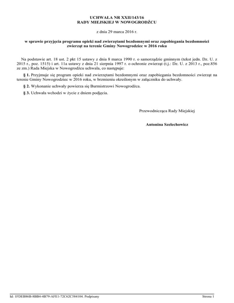 UCHWAŁA NR XXII/143/16 RADY MIEJSKIEJ W NOWOGRODŹCU z dnia 29 marca 2016 r. w sprawie przyjęcia programu opieki nad zwierzętami bezdomnymi oraz zapobiegania bezdomności zwierząt na terenie Gminy Nowogrodziec w 2016 roku Na podstawie art. 18 ust. 2 pkt 15 ustawy z dnia 8 marca 1990 r. o samorządzie gminnym (tekst jedn. Dz. U. z 2015 r., poz. 1515) i art. 11a ustawy z dnia 21 sierpnia 1997 r. o ochronie zwierząt (t.j.: Dz. U. z 2013 r., poz.856 ze zm.) Rada Miejska w Nowogrodźcu uchwala, co następuje: § 1. Przyjmuje się program opieki nad zwierzętami bezdomnymi oraz zapobiegania bezdomności zwierząt na terenie Gminy Nowogrodziec w 2016 roku, w brzmieniu określonym w załączniku do uchwały. § 2. Wykonanie uchwały powierza się Burmistrzowi Nowogrodźca. § 3. Uchwała wchodzi w życie z dniem podjęcia. Przewodnicząca Rady Miejskiej Antonina Szelechowicz Id: 1FDEB86B-8BB4-4B79-AFE1-72C62C584104. Podpisany Strona 1 Załącznik do Uchwały Nr XXII/143/16 Rady Miejskiej w Nowogrodźcu z dnia 29 marca 2016 r. Program opieki nad zwierzętami bezdomnymi oraz zapobiegania bezdomności zwierząt na terenie Gminy Nowogrodziec w 2016 roku Rozdział 1. POSTANOWIENIA OGÓLNE § 1. Ilekroć w uchwale jest mowa o: 1) Urzędzie, należy przez to rozumieć Urząd Miejski w Nowogrodźcu, jednostkę organizacyjną, przy pomocy której Burmistrz Nowogrodźca wykonuje zadania; 2) schronisku dla zwierząt, należy przez to rozumieć Schronisko dla Zwierząt Małych w Wielkim Lubańskim Lesie, Przylasek 18, 59-816 Platerówka, będące własnością Związku Gmin „Kwisa”, którego Gmina Nowogrodziec jest członkiem i ponosi koszty na jego funkcjonowanie; 3) Programie, należy przez to rozumieć Program opieki nad zwierzętami bezdomnymi oraz zapobiegania bezdomności zwierząt na terenie Gminy Nowogrodziec w 2016 roku. § 2. 1. Koordynatorem i realizatorem Programu jest Burmistrz Nowogrodźca. 2. Burmistrz Nowogrodźca realizuje Program : 1) poprzez wspólne prowadzenie wraz z członkami Związku Gmin „Kwisa” i ponoszenie kosztów na funkcjonowanie schroniska dla zwierząt; 2) przy współudziale organizacji pozarządowych, których celem statutowym jest ochrona zwierząt, współpracujących z Urzędem Miejskim w Nowogrodźcu i innymi jednostkami organizacyjnymi Gminy Nowogrodziec. Rozdział 2. CELE I ZADANIA PROGRAMU § 3. Celem Programu jest zapobieganie bezdomności zwierząt na terenie Gminy Nowogrodziec oraz opieki nad zwierzętami bezdomnymi. Rozdział 3. OGRANICZANIE POPULACJI BEZDOMNYCH ZWIERZĄT § 4. Ograniczenie populacji bezdomnych zwierząt poprzez sterylizację i kastrację zwierząt, realizuje Burmistrz Nowogrodźca przy współpracy ze schroniskiem dla zwierząt, które obligatoryjnie przeprowadza zabiegi sterylizacji i kastracji zwierząt przyjętych do schroniska. Rozdział 4. OPIEKA NAD ZWIERZĘTAMI § 5. Zapewnienie opieki bezdomnym zwierzętom z terenu Gminy Nowogrodziec realizuje Burmistrz Nowogrodźca: 1) przy współpracy ze schroniskiem dla zwierząt; 2) za pośrednictwem Urzędu Miejskiego w Nowogrodźcu, poprzez zapewnienie miejsca dla zwierząt gospodarskich w gospodarstwie rolnym położonym w miejscowości Gierałtów 283; 3) przy współpracy z organizacjami pozarządowymi, które realizacją zadania publiczne obejmujące opiekę nad zwierzętami bezdomnymi. § 6. Sprawowanie opieki nad wolno żyjącymi kotami, w tym ich dokarmianie realizuje Burmistrz Nowogrodźca: 1) za pośrednictwem Urzędu Miejskiego w Nowogrodźcu poprzez: Id: 1FDEB86B-8BB4-4B79-AFE1-72C62C584104. Podpisany Strona 1 a) wspieranie społecznych opiekunów (karmicieli) kotów wolno żyjących, którzy zarejestrowali się w urzędzie; b) podejmowanie interwencji w sprawach kotów wolno żyjących przy udziale organizacji pozarządowych; 2) przy współpracy z organizacjami pozarządowymi, które realizacją zadania publiczne obejmujące opiekę nad kotami wolno żyjącymi oraz podejmujące interwencje w sprawach kotów wolno żyjących. § 7. Poszukiwanie nowych właścicieli dla bezdomnych zwierząt realizuje Burmistrz Nowogrodźca: 1) przy współpracy ze schroniskiem da zwierząt, które prowadzi działania zmierzające do pozyskiwania nowych właścicieli i oddawania do adopcji bezdomnych zwierząt osobom zainteresowanym i zdolnym zapewnić im należyte warunki bytowania; 2) za pośrednictwem Urzędu Miejskiego w Nowogrodźcu poprzez prowadzenie działań zmierzających do pozyskiwania nowych właścicieli, m.in. umieszczanie ogłoszeń o adopcji zwierząt na stronie internetowej urzędu. § 8. 1. Odławianie bezdomnych zwierząt z terenu Gminy Nowogrodziec realizuje Burmistrz Nowogrodźca przy współpracy ze schroniskiem dla zwierząt. 2. W przypadku pojawienia się bezdomnego zwierzęcia mieszkańcy Gminy Nowogrodziec winni powiadomić telefonicznie bądź osobiście funkcjonariuszy Straży Miejskiej w Nowogrodźcu. 3. W przypadku konieczności zapewnienia opieki weterynaryjnej zwierzętom gospodarskim umieszczonym na czas leczenia w gospodarstwie rolnym, o którym mowa w § 5 pkt 2 Programu, Burmistrz Nowogrodźca zleci lekarzowi weterynarii świadczenie usług weterynaryjnych, zgodnie ze zdiagnozowanym przypadkiem. § 9. Zapewnienie całodobowej opieki weterynaryjnej w przypadkach zdarzeń drogowych z udziałem zwierząt realizuje Burmistrz Nowogrodźca przy współpracy ze schroniskiem dla zwierząt, które posiada podpisaną umowę z Przychodnią Weterynaryjną Psilasek Lek. Wet. Dorota Giergiczna, Przylasek 18, 59-816 Przylasek oraz Gabinetem Weterynarii ul. Wolności 4, 59-830 Olszyna. § 10. Usypianie ślepych miotów zwierząt realizuje Burmistrz Nowogrodźca przy współpracy ze schroniskiem dla zwierząt, które dokonuje zabiegów usypiania ślepych miotów. Rozdział 5. EDUKACJA MIESZKAŃCÓW § 11. Urząd Miejski w Nowogrodźcu w ramach Programu prowadzi we współpracy z organizacjami pozarządowymi oraz placówkami oświatowymi, działania edukacyjne m.in. w zakr