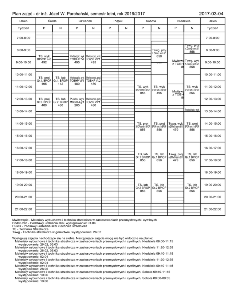 Plan zajęć - dr inż. Józef W. Parchański, semestr letni, rok 2016/2017 Dzień Tydzień Środa P Czwartek N P Piątek N P 2017-03-04 Sobota N P Niedziela N P Dzień N 7:00-8:00 7:00-8:00 8:00-9:00 9:00-10:00 10:00-11:00 11:00-12:00 12:00-13:00 TS, wyk BPiOP s.6 492 Mwitswzpic, wyk Mwitswzpic, wyk TOBHP VI IOZK VI/1 495 495 TS, proj TS, lab Mwitswzpic, proj Mwitswzpic, proj Gr.1. BPiOP Gr.1. BPiOP TOBHP VI/1 TOBHP VI/2 495 112 480 480 TS, proj TS, lab Pusits, wyk Mwitswzpic, proj Gr.2. BPiOP Gr.2. BPiOP MGBiD 4 gr1 IOZK VI/1 480 480 205 480 Tswg, proj Mwitswzpic, proj nz TOBHP ZMwG sem.6/1 sem.6/2 PodstUrab, Tswg, 858proj wyk nMiUGiZMwG W sem. 4, gr.1 Misem.6/1 UGiW sem. 4, gr.2 410 858 Tswg, proj n ZMwG sem.6/1 858 Mwitswzpic, proj z TOBHP sem.6 858 Mwitswzpic, Tswg, wykwyk z TOBHPn ZMwG sem.6 sem.6/1 858 858 Mwitswzpic, wyk proj z TOBHP sem.6 71B 858 TS, wyk TS, wyk BPiOP sem.6 n BPiOP BPiOP sem.6 n BPiOP PodstUrab, wyk 856 71C 856 495 MiUGiW sem. 4, gr.1 MiUGiW sem. 4, gr.2 410 TS, wyk BPiOP sem.6 n BPiOP Mwitswzpic, Mwitswzpic, proj proj 856 z TOBHPz TOBHP sem.6sem.6 858 71B PodstUrab, wyk MiUGiW sem. 4, gr.1 MiUGiW sem. 4, gr.2 410 13:00-14:00 14:00-15:00 TS, proj TS, proj Tswg, wyk Tswg, TS, proj wyk BPiOP sem.6 n BPiOP BPiOP sem.6 n BPiOP n ZMwG sem.6/1 BPi n ZMwG OP sem.6sem.6/1 n BPiOP 856 856 479 291 856 15:00-16:00 16:00-17:00 17:00-18:00 8:00-9:00 9:00-10:00 10:00-11:00 11:00-12:00 12:00-13:00 13:00-14:00 14:00-15:00 15:00-16:00 Tswg, wyk n ZMwG sem.6/1 TS, lab TS, lab Tswg, proj Tswg, TS, 112 lab proj Gr.1 BPiOP Gr.1 BPiOP n ZMwG sem.6/1 Gr.1 n ZMwGBPiOP sem.6/1 856 856 479 858 856 18:00-19:00 19:00-20:00 Tydzień Tswg, proj n ZMwG sem.6/1 112 TS, lab TS, lab Gr.2 BPiOP Gr.2 BPiOP 856 856 TS, lab Gr.2 BPiOP 856 16:00-17:00 17:00-18:00 18:00-19:00 19:00-20:00 20:00-21:00 20:00-21:00 21:00-22:00 21:00-22:00 Mwitswzpic - Materiały wybuchowe i technika strzelnicza w zastosowaniach przemysłowych i cywilnych PodstUrab - Podstawy urabiania skał, występowanie: 01.04 Pusits - Podsawy urabiania skał i technika strzelnicza TS - Technika Strzelnicza Tswg - Technika strzelnicza w górnictwie, występowanie: 26.02 Występują zajęcia nachodzące się na siebie. Następujące zajęcia mogę nie być widoczne na planie: Materiały wybuchowe i technika strzelnicza w zastosowaniach przemysłowych i cywilnych, Niedziela 08:00-11:15 występowanie: 26.02, 05.03 Materiały wybuchowe i technika strzelnicza w zastosowaniach przemysłowych i cywilnych, Niedziela 11:20-12:55 występowanie: 26.02, 05.03 Materiały wybuchowe i technika strzelnicza w zastosowaniach przemysłowych i cywilnych, Niedziela 09:40-11:15 występowanie: 02.04 Materiały wybuchowe i technika strzelnicza w zastosowaniach przemysłowych i cywilnych, Niedziela 11:20-12:55 występowanie: 02.04 Materiały wybuchowe i technika strzelnicza w zastosowaniach przemysłowych i cywilnych, Niedziela 09:40-11:15 występowanie: 28.05 Materiały wybuchowe i technika strzelnicza w zastosowaniach przemysłowych i cywilnych, Sobota 09:40-11:15 występowanie: 10.06 Materiały wybuchowe i technika strzelnicza w zastosowaniach przemysłowych i cywilnych, Sobota 08:00-09:35 występowanie: 10.06 Podstawy urabiania skał, Sobota 11:15-13:00 występowanie: 10.06 Technika strzelnicza w górnictwie, Niedziela 13:30-15:55 występowanie: 02.04 Technika strzelnicza w górnictwie, Sobota 08:00-10:25 występowanie: 27.05 Technika strzelnicza w górnictwie, Niedziela 08:50-10:25 występowanie: 11.06 Technika strzelnicza w górnictwie, Sobota 08:00-09:35 występowanie: 10.06 Technika strzelnicza w górnictwie, Niedziela 08:00-08:45 występowanie: 11.06 Technika Strzelnicza, Sobota 10:30-13:00 występowanie: 04.03 Technika Strzelnicza, Sobota 10:30-13:00 występowanie: 01.04 Technika Strzelnicza, Sobota 10:30-13:00 występowanie: 27.05 Technika Strzelnicza, Niedziela 10:30-13:00 występowanie: 11.06 Technika strzelnicza w górnictwie, Niedziela 16:00-18:25 występowanie: 02.04 Technika strzelnicza w górnictwie, Niedziela 16:00-17:35 występowanie: 28.05 Technika strzelnicza w górnictwie, Niedziela 17:40-20:05 występowanie: 28.05 Technika Strzelnicza, Niedziela 16:00-18:30 występowanie: 11.06 Technika Strzelnicza, Sobota 13:30-16:00 występowanie: 04.03 Technika Strzelnicza, Sobota 13:30-16:00 występowanie: 01.04 Technika Strzelnicza, Sobota 16:00-18:30 występowanie: 04.03 Technika Strzelnicza, Sobota 16:00-18:30 występowanie: 01.04 Technika Strzelnicza, Sobota 18:30-21:00 występowanie: 04.03 Technika Strzelnicza, Sobota 18:30-21:00 występowanie: 01.04 Poniższe zajęcia występują o różnych godzinach w różnych tygodniach, dlatego mogą nie być widoczne na planie: Podstawy urabiania skał: 01.04 -> Sobota 08:00-10:30; 28.05 -> Niedziela 11:15-16:00; 10.06 -> Sobota 11:15-13:00