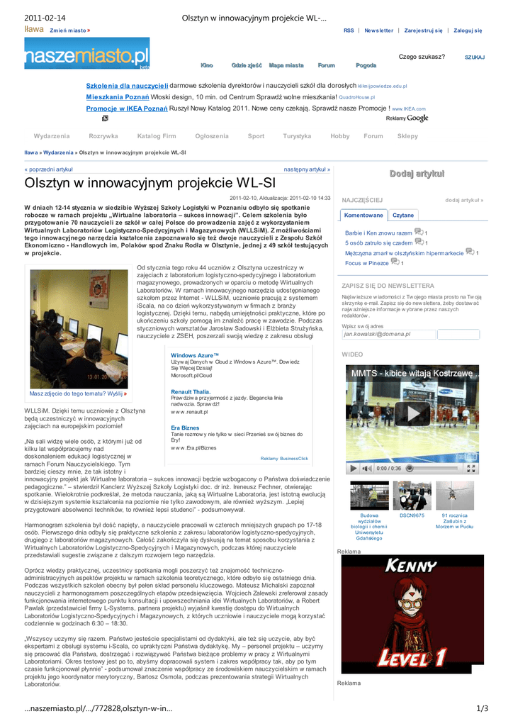 2011-02-14 Iława Olsztyn w innowacyjnym projekcie WL-… Zm ień m iasto » RSS | New sletter | Zarejestruj się | Zaloguj się Czego szukasz? Kino Gdzie zjeść Mapa miasta Forum SZUKAJ Pogoda Szkolenia dla nauczycieli darmowe szkolenia dyrektorów i nauczycieli szkół dla dorosłych kliknijpowiedze.edu.pl Mieszkania Poznań Włoski design, 10 min. od Centrum Sprawdź wolne mieszkania! QuadroHouse.pl Promocje w IKEA Poznań Ruszył Nowy Katalog 2011. Nowe ceny czekają. Sprawdź nasze Promocje ! www.IKEA.com/PL Wydarzenia Rozrywka Katalog Firm Ogłoszenia Sport Turystyka Hobby Forum Sklepy Iław a » Wydarzenia » Olsztyn w innow acyjnym projekcie WL-SI « poprzedni artykuł następny artykuł » Olsztyn w innowacyjnym projekcie WL-SI 2011-02-10, Aktualizacja: 2011-02-10 14:33 W dniach 12-14 stycznia w siedzibie Wyższej Szkoły Logistyki w Poznaniu odbyło się spotkanie robocze w ramach projektu „Wirtualne laboratoria – sukces innowacji”. Celem szkolenia było przygotowanie 70 nauczycieli ze szkół w całej Polsce do prowadzenia zajęć z wykorzystaniem Wirtualnych Laboratoriów Logistyczno-Spedycyjnych i Magazynowych (WLLSiM). Z możliwościami tego innowacyjnego narzędzia kształcenia zapoznawało się też dwoje nauczycieli z Zespołu Szkół Ekonomiczno - Handlowych im, Polaków spod Znaku Rodła w Olsztynie, jednej z 49 szkół testujących w projekcie. Od stycznia tego roku 44 uczniów z Olsztyna uczestniczy w zajęciach z laboratorium logistyczno-spedycyjnego i laboratorium magazynowego, prowadzonych w oparciu o metodę Wirtualnych Laboratoriów. W ramach innowacyjnego narzędzia udostępnianego szkołom przez Internet - WLLSiM, uczniowie pracują z systemem iScala, na co dzień wykorzystywanym w firmach z branży logistycznej. Dzięki temu, nabędą umiejętności praktyczne, które po ukończeniu szkoły pomogą im znaleźć pracę w zawodzie. Podczas styczniowych warsztatów Jarosław Sadowski i Elżbieta Strużyńska, nauczyciele z ZSEH, poszerzali swoją wiedzę z zakresu obsługi Windows Azure™ NAJCZĘŚCIEJ Komentowane dodaj artykuł » Czytane Barbie i Ken znowu razem 1 5 osób zatruło się czadem 1 Mężczyzna zmarł w olsztyńskim hipermarkecie Focus w Pinezce 1 1 ZAPISZ SIĘ DO NEWSLETTERA Najśw ieższe w iadomości z Tw ojego miasta prosto na Tw oją skrzynkę e-mail. Zapisz się do new slettera, żeby dostaw ać najw ażniejsze informacje w ybrane przez naszych redaktorów . Wpisz sw ój adres [email protected] WIDEO Używ aj Danych w Cloud z Window s Azure™. Dow iedz Się Więcej Dzisiaj! Microsoft.pl/Cloud Masz zdjęcie do tego tematu? Wyślij » WLLSiM. Dzięki temu uczniowie z Olsztyna będą uczestniczyć w innowacyjnych zajęciach na europejskim poziomie! Renault Thalia. Praw dziw a przyjemność z jazdy. Elegancka linia nadw ozia. Spraw dź! w w w .renault.pl Era Biznes Tanie rozmow y nie tylko w sieci Przenieś sw ój biznes do Ery! „Na sali widzę wiele osób, z którymi już od w w w .Era.pl/Biznes kilku lat współpracujemy nad doskonaleniem edukacji logistycznej w Reklamy BusinessClick ramach Forum Nauczycielskiego. Tym bardziej cieszy mnie, że tak istotny i innowacyjny projekt jak Wirtualne laboratoria – sukces innowacji będzie wzbogacony o Państwa doświadczenie pedagogiczne.” – stwierdził Kanclerz Wyższej Szkoły Logistyki doc. dr inż. Ireneusz Fechner, otwierając spotkanie. Wielokrotnie podkreślał, że metoda nauczania, jaką są Wirtualne Laboratoria, jest istotną ewolucją w dzisiejszym systemie kształcenia na poziomie nie tylko zawodowym, ale również wyższym. „Lepiej przygotowani absolwenci techników, to również lepsi studenci” - podsumowywał. Harmonogram szkolenia był dość napięty, a nauczyciele pracowali w czterech mniejszych grupach po 17-18 osób. Pierwszego dnia odbyły się praktyczne szkolenia z zakresu laboratoriów logistyczno-spedycyjnych, drugiego z laboratoriów magazynowych. Całość zakończyła się dyskusją na temat sposobu korzystania z Wirtualnych Laboratoriów Logistyczno-Spedycyjnych i Magazynowych, podczas której nauczyciele przedstawiali sugestie związane z dalszym rozwojem tego narzędzia. Budowa wydziałów biologii i chemii Uniwersytetu Gdańskiego DSCN9675 91 rocznica Zaślubin z Morzem w Pucku Reklama Oprócz wiedzy praktycznej, uczestnicy spotkania mogli poszerzyć też znajomość technicznoadministracyjnych aspektów projektu w ramach szkolenia teoretycznego, które odbyło się ostatniego dnia. Podczas wszystkich szkoleń obecny był pełen skład personelu kluczowego. Mateusz Michalski zapoznał nauczycieli z harmonogramem poszczególnych etapów przedsięwzięcia. Wojciech Zalewski zreferował zasady funkcjonowania internetowego punktu konsultacji i upowszechniania idei Wirtualnych Laboratoriów, a Robert Pawlak (przedstawiciel firmy L-Systems, partnera projektu) wyjaśnił kwestię dostępu do Wirtualnych Laboratoriów Logistyczno-Spedycyjnych i Magazynowych, z których uczniowie i nauczyciele mogą korzystać codziennie w godzinach 6:30 – 18:30. „Wszyscy uczymy się razem. Państwo jesteście specjalistami od dydaktyki, ale też się uczycie, aby być ekspertami z obsługi systemu i-Scala, co upraktyczni Państwa dydaktykę. My – personel projektu – uczymy się pracować dla Państwa, dostrzegać i rozwiązywać Państwa bieżące problemy w pracy z Wirtualnymi Laboratoriami. Okres testowy jest po to, abyśmy dopracowali system i zakres współpracy tak, aby po tym czasie funkcjonował płynnie” - podsumował znaczenie współpracy ze środowiskiem nauczycielskim w ramach projektu jego koordynator merytoryczny, Bartosz Osmola, podczas prezentowania strategii Wirtualnych Laboratoriów. …naszemiasto.pl/…/772828,olsztyn-w-in… Reklama 1/3 2011-02-14 Olsztyn w innowacyjnym projekcie WL-… O PROJEKCIE Wirtualne Laboratoria Logistyczno-Spedycyjne i Magazynowe są innowacyjnym narzędziem kształcenia w ramach laboratoriów zawodowych na kierunku tec