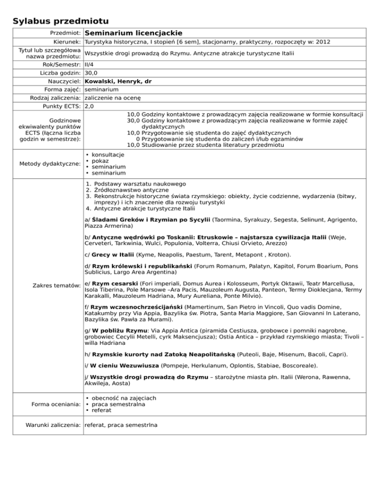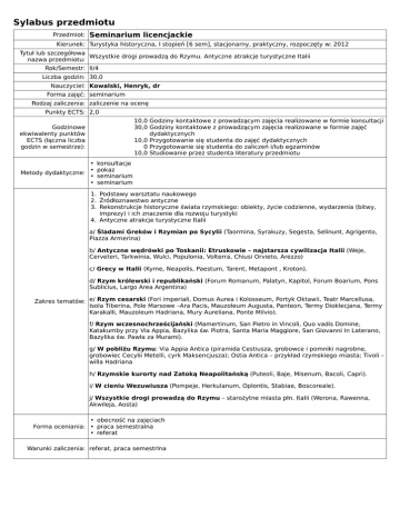 Sylabus przedmiotu Przedmiot: Seminarium licencjackie Kierunek: Turystyka historyczna, I stopień [6 sem], stacjonarny, praktyczny, rozpoczęty w: 2012 Tytuł lub szczegółowa Wszystkie drogi prowadzą do Rzymu. Antyczne atrakcje turystyczne Italii nazwa przedmiotu: Rok/Semestr: II/4 Liczba godzin: 30,0 Nauczyciel: Kowalski, Henryk, dr Forma zajęć: seminarium Rodzaj zaliczenia: zaliczenie na ocenę Punkty ECTS: 2,0 10,0 Godziny kontaktowe z prowadzącym zajęcia realizowane w formie konsultacji 30,0 Godziny kontaktowe z prowadzącym zajęcia realizowane w formie zajęć dydaktycznych 10,0 Przygotowanie się studenta do zajęć dydaktycznych 0 Przygotowanie się studenta do zaliczeń i/lub egzaminów 10,0 Studiowanie przez studenta literatury przedmiotu Godzinowe ekwiwalenty punktów ECTS (łączna liczba godzin w semestrze): • • Metody dydaktyczne: • • konsultacje pokaz seminarium seminarium 1. Podstawy warsztatu naukowego 2. Źródłoznawstwo antyczne 3. Rekonstrukcje historyczne świata rzymskiego: obiekty, życie codzienne, wydarzenia (bitwy, imprezy) i ich znaczenie dla rozwoju turystyki 4. Antyczne atrakcje turystyczne Italii a/ Śladami Greków i Rzymian po Sycylii (Taormina, Syrakuzy, Segesta, Selinunt, Agrigento, Piazza Armerina) b/ Antyczne wędrówki po Toskanii: Etruskowie – najstarsza cywilizacja Italii (Weje, Cerveteri, Tarkwinia, Wulci, Populonia, Volterra, Chiusi Orvieto, Arezzo) c/ Grecy w Italii (Kyme, Neapolis, Paestum, Tarent, Metapont , Kroton). d/ Rzym królewski i republikański (Forum Romanum, Palatyn, Kapitol, Forum Boarium, Pons Sublicius, Largo Area Argentina) Zakres tematów: e/ Rzym cesarski (Fori imperiali, Domus Aurea i Kolosseum, Portyk Oktawii, Teatr Marcellusa, Isola Tiberina, Pole Marsowe –Ara Pacis, Mauzoleum Augusta, Panteon, Termy Dioklecjana, Termy Karakalli, Mauzoleum Hadriana, Mury Aureliana, Ponte Milvio). f/ Rzym wczesnochrześcijański (Mamertinum, San Pietro in Vincoli, Quo vadis Domine, Katakumby przy Via Appia, Bazylika św. Piotra, Santa Maria Maggiore, San Giovanni In Laterano, Bazylika św. Pawła za Murami). g/ W pobliżu Rzymu: Via Appia Antica (piramida Cestiusza, grobowce i pomniki nagrobne, grobowiec Cecylii Metelli, cyrk Maksencjusza); Ostia Antica – przykład rzymskiego miasta; Tivoli – willa Hadriana h/ Rzymskie kurorty nad Zatoką Neapolitańską (Puteoli, Baje, Misenum, Bacoli, Capri). i/ W cieniu Wezuwiusza (Pompeje, Herkulanum, Oplontis, Stabiae, Boscoreale). j/ Wszystkie drogi prowadzą do Rzymu – starożytne miasta płn. Italii (Werona, Rawenna, Akwileja, Aosta) • obecność na zajęciach Forma oceniania: • praca semestralna • referat Warunki zaliczenia: referat, praca semestrlna Modułowe efekty kształcenia realizowane w ramach przedmiotu: 01 posiada znajomość podstawowej terminologii oraz literatury krajoznawczej i turystycznej, zwłaszcza przewodników turystycznych 02 wie jak samodzielnie stworzyć przewodnik lub słownik historyczno-krajoznawczy wybranej miejscowości 03 samodzielnie zdobywa wiedzę i poszerza swoje umiejętności w oparciu o różnorodne źródła informacji 04 rozumie rangę przemysłu turystycznego, jego miejsca we współczesnej Polsce i szans, jakie stwarza dla gospodarczego i cywilizacyjnego rozwoju poszczególnych regionów Literatura ogólna: 1. 2. 3. 4. 5. 6. Beard M., Henderson J., Kultura antyczna, Warszawa 1997. Durando F., Grecja. Ludzie, myśl, sztuka, Warszawa 1997. Grant M., Krótka historia cywilizacji klasycznej, Poznań 1998. Kumaniecki K., Historia kultury starożytnej Grecji i Rzymu, Warszawa 1972. Stabryła S., Zarys kultury starożytnej Grecji i Rzymu, Warszawa 2007. Starożytność. Historia, kultura, literatura, red. T. Skoczek, Bochnia-Kraków- Warszawa 2006 Sztuka: 1. Abramowiczówna Z., O sztuce starożytnej, Toruń 2002. 2. Boardman J., Sztuka grecka, Warszawa 1999. 3. Galicka I., Historia sztuki, T. I: Od Paleolitu do Rzymu, Warszawa 2003 (Europejska Akademia Sztuk). 4. Historia sztuki świata, t. I, Warszawa 1999 (wyd. Muza). 5. Hölscher T., Sztuka rzymska: język obrazowy jako system semantyczny , Poznań 2011. 6. Jastrzębowska E., Sztuka wczesnochrześcijańska, Kraków 2008. 7. Makowiecka E., Sztuka Rzymu. Od Augusta do Konstantyna, Warszawa 2010. 8. Michałowski K., Jak Grecy tworzyli sztukę, Warszawa 1986. 9. Nowicka M., Malarstwo antyczne, Wrocław – Warszawa – Kraków 1985. 10. Nowicka M., Twarze antyku. Z dziejow portretu w Grecji i w Rzymie, Warszawa 2000. 11. Ostrowski J. A., Starożytny Rzym. Polityka i sztuka, Warszawa - Kraków 1999. 12. Papuci-Władyka E., Sztuka starożytnej Grecji, Warszawa – Kraków 2001. 13. Sadurska A., Archeologia starożytnego Rzymu, t. I-II, Warszawa 1975-1978. 14. Sztuka świata , t.1, praca zbiorowa, Wydawnictwo Arkady, 1989. 15. Twardecki A., Mały słownik sztuki starożytnej Grecji i Rzymu , Warszawa 1998. Wczesne chrześcijaństwo Literatura: 1. 2. 3. 4. Deichmann F. W., Archeologia chrześcijańska, Warszawa 1994. Musiał D., Antyczne korzenie chrześcijaństwa, Warszawa 2001. Simon M., Cywilizacja wczesnego chrześcijaństwa, Warszawa 1992. Wipszycka E., Kościół w świecie późnego antyku, Warszawa 1994. Encyklopedie i leksykony 1. Gabucci A., Rzym, Warszawa 2010 (seria: Leksykon cywilizacje). 2. Słownik kultury antycznej, pod red. L.Winniczuk, Warszawa 1986. 3. Słownik kultury antycznej, pod red. R. Kuleszy, Warszawa 2012 Przewodniki 1. 2. 3. 4. 5. 6. 7. 8. 9. 10. Beard M., Pompeje. Życie rzymskiego miasta, Poznań 2010. Castiglione L., Pompeje i Herkulanum, Warszawa 1986. Ciechanowicz J., Rzym. Ludzie i budowle, Warszawa 1989. Durando F., Italia antyczna. Kolebka cywilizacji śródziemnomorskiej , Warszawa 2008. Durando F., Italia antyczna. Dziedzictwo sztuki i kultury cywilizacji rzymskiej, Warszawa 2008. Etruskowie i Rzymianie. Zwiedzasz – odkrywasz – poznajesz , Warszawa 2001. Etruskowie: Umiłowanie życia, Warszawa 1997. Hintzen-Bohlen B., Rzym. Sztuka i Architektura, Oż