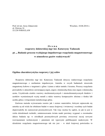 Prof. dr inż. Jerzy Zdanowski ul. Żniwna 16 52-230 WROCŁAW Wrocław, 10.06.2014 r. Ocena rozprawy doktorskiej mgr inż. Katarzyny Tadaszak pt. „ Badanie procesu wydajnego impulsowego rozpylania magnetronowego w atmosferze gazów reaktywnych” Ogólna charakterystyka rozprawy i jej celów Rozprawa doktorska mgr inż. Katarzyny Tadaszak dotyczy reaktywnego rozpylania magnetronowego z zasilaniem impulsowym. Autorka w swych badaniach stosowała magnetrony kołowe z targetami z glinu i tytanu a także tantalu i krzemu. Procesy rozpylania prowadziła w atmosferze zawierającej argon, argon z domieszką tlenu oraz argon z domieszką azotu. Uzyskiwała cienkie warstwy stechiometrycznych i niestechiometrycznych tlenków i azotków wymienionych wyżej metali a także warstwy kompozytów złożone z tlenku lub azotku glinu z wtrąceniami metalicznego glinu. Zarówno metoda wytwarzania warstw jak i zestaw materiałów, którymi zajmowała się autorka są od wielu lat obiektem badań w nauce krajowej i światowej i rezultaty tych badań doprowadziły do zastosowań przemysłowych. Tak więc można by sądzić, że jak to jest w wielu dziedzinach techniki, zainteresowania świata nauki powinny wygasać a ewentualne dalsze badania np. w ośrodkach przemysłowych powinny owocować raczej nowymi rozwiązaniami technicznymi i patentami niż typowymi publikacjami naukowymi. W dziedzinie rozpylania magnetronowego tak nie jest – w skali krajowej potwierdza to 2 realizowanie w kilku poważnych ośrodkach naukowych prac cenzusowych – doktorskich i habilitacyjnych, których wyniki wzbogacają wiedzę o szczegółowych metodach, zjawiskach i produktach rozpylania magnetronowego. Do takich prac należy rozprawa doktorska mgr inż. Katarzyny Tadaszak zrealizowana w jednym z przodujących w kraju ośrodków zajmujących się rozpylaniem magnetronowym, jakim jest od lat zespół prof. Witolda Posadowskiego. Metoda rozpylania magnetronowego jest obecnie jedną z wiodących metod nanoszenia warstw cienkich. Wyparła w znacznym stopniu z rynku naukowego i przemysłowego inne metody z grupy PVD a także CVD. Do jej podstawowych zalet należy wszechstronność materiałowa i elastyczność zastosowań, możliwość nanoszenia warstw na podłoża o różnych rozmiarach i właściwościach, w tym także na podłoża wymagające niskich temperatur w procesach nanoszenia. Przy wszystkich swych zaletach metoda jest jednak „kapryśna”, wymaga szczególnych wysiłków dla uzyskania stabilności procesów i powtarzalności ich wyników. Dotyczy to w szczególności reaktywnego rozpylania magnetronowego, w którym nanoszeniu na podłoże warstw związków chemicznych, powstających w wyniku reakcji atomów gazu domieszkowego (aktywnego chemicznie), zachodzących w fazie gazowej i na podłożu, towarzyszyć mogą reakcje zachodzące na rozpylanej tarczy – targecie. Te ostatnie powodują niepożądany efekt „zatruwania” targetu. Produkty reakcji na targecie – w recenzowanej pracy tlenki i azotki – zmieniają warunki rozpylania targetu (najczęściej obniżając wydajność rozpylania) a gdy są dielektrykami to zwiększają prawdopodobieństwo powstawania przy targecie mikrołuków mających negatywny wpływ na morfologię powierzchni targetu i na właściwości nanoszonych warstw. Poszukiwanie metod i warunków przebiegu zjawisk na targecie jest jednym z ważnych tematów badań procesu reaktywnego rozpylania magnetronowego i jedną z ważkich przyczyn stosowania zasilania impulsowego. Autorka recenzowanej rozprawy poświęciła tej problematyce znaczną część swych badań mając na celu uzyskanie wysokiej wydajności procesu rozpylania a jednocześnie zapewnienie stabilności procesu i uzyskanie możliwie prostych sposobów regulacji i stabilizacji rozpylania. Formułując tezę pracy mówiącą o możliwości realizacji wymienionych wyżej celów określiła obszar swych badań odnosząc je do nanoszenia z dużą wydajnością cienkich warstw wybranych tlenków i azotków metali metodą reaktywnego, impulsowego rozpylania magnetronowego. Przyjęła, że realizację celów osiągnie stosując rozpylanie w modzie metalicznym, gdy target nie jest pokryty produktami reakcji, lub na granicy modów metalicznego i przejściowego, gdy tylko niewielka część targetu jest pokryta produktami reakcji. Ambitne zamierzenia obejmowały też stabilne i kontrolowane otrzymywanie warstw 3 mieszanin (zrealizowała nanoszenie warstw kompozytów : tlenku glinu i glinu metalicznego oraz azotku glinu i glinu metalicznego) a także cienkich warstw o właściwościach dielektrycznych nanoszonych na podłoża o stosunkowo niskiej temperaturze. Zawartość rozprawy Krótki, dwustronicowy „Wstęp” do rozprawy wprowadza w zagadnienia i problemy rozpylania magnetronowego, w historię badań nad tą metodą rozpylania prowadzonych na Wydziale Elektroniki Mikrosystemów i Fotoniki Politechniki Wrocławskiej a następnie przedstawia tematykę kolejnych rozdziałów rozprawy. W rozdziale zatytułowanym „Charakterystyka procesu rozpylania magnetronowego” autorka zawarła materiały o charakterze podręcznikowym czy „literaturowym”. Pierwszy podrozdział przedstawia rozpylanie magnetronowe na tle innych metod nanoszenia warstw cienkich – samemu rozpylaniu magnetronowemu poświęcono tylko ok. 20% jego tekstu a więc jego tytuł jest niewłaściwy. Bardziej adekwatny do jego treści byłby tytuł „Rozpylanie magnetronowe na tle innych metod nanoszenia”. Do tego podrozdziału można by także włączyć zawartość podrozdziału „Rys historyczny” występującego samodzielnie w recenzowanym tekście. W kolejnym podrozdziale zatytułowanym „Wyładowanie elektryczne w gazie rozrzedzonym” zamieszczono skrótowo informacje o wyładowaniach, głównie takie, jakie są istotne dla zrozumienia zjawisk występujących w procesie rozpylania magnetronowego. Zdaniem recenzenta zbędne jest wydzielanie podtytułem ruchu cz