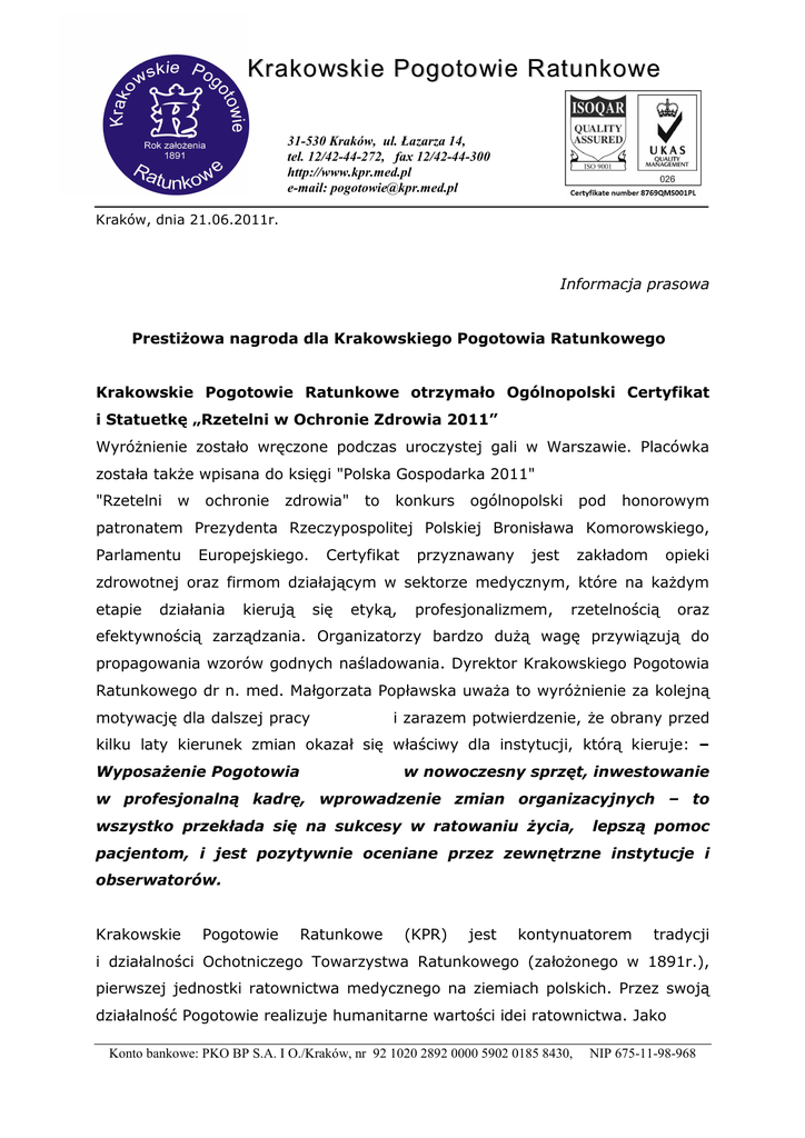 K r a k o ws k i e P o g o t o wi e R a t u n k o we 31-530 Kraków, ul. Łazarza 14, tel. 12/42-44-272, fax 12/42-44-300 http://www.kpr.med.pl e-mail: [email protected] Kraków, dnia 21.06.2011r. Informacja prasowa Prestiżowa nagroda dla Krakowskiego Pogotowia Ratunkowego Krakowskie Pogotowie Ratunkowe otrzymało Ogólnopolski Certyfikat i Statuetkę „Rzetelni w Ochronie Zdrowia 2011” Wyróżnienie zostało wręczone podczas uroczystej gali w Warszawie. Placówka została także wpisana do księgi "Polska Gospodarka 2011" "Rzetelni w ochronie zdrowia" to konkurs ogólnopolski pod honorowym patronatem Prezydenta Rzeczypospolitej Polskiej Bronisława Komorowskiego, Parlamentu Europejskiego. Certyfikat przyznawany jest zakładom opieki zdrowotnej oraz firmom działającym w sektorze medycznym, które na każdym etapie działania kierują się etyką, profesjonalizmem, rzetelnością oraz efektywnością zarządzania. Organizatorzy bardzo dużą wagę przywiązują do propagowania wzorów godnych naśladowania. Dyrektor Krakowskiego Pogotowia Ratunkowego dr n. med. Małgorzata Popławska uważa to wyróżnienie za kolejną motywację dla dalszej pracy i zarazem potwierdzenie, że obrany przed kilku laty kierunek zmian okazał się właściwy dla instytucji, którą kieruje: – Wyposażenie Pogotowia w nowoczesny sprzęt, inwestowanie w profesjonalną kadrę, wprowadzenie zmian organizacyjnych – to wszystko przekłada się na sukcesy w ratowaniu życia, lepszą pomoc pacjentom, i jest pozytywnie oceniane przez zewnętrzne instytucje i obserwatorów. Krakowskie Pogotowie Ratunkowe (KPR) jest kontynuatorem tradycji i działalności Ochotniczego Towarzystwa Ratunkowego (założonego w 1891r.), pierwszej jednostki ratownictwa medycznego na ziemiach polskich. Przez swoją działalność Pogotowie realizuje humanitarne wartości idei ratownictwa. Jako Konto bankowe: PKO BP S.A. I O./Kraków, nr 92 1020 2892 0000 5902 0185 8430, NIP 675-11-98-968 K r a k o ws k i e P o g o t o wi e R a t u n k o we 31-530 Kraków, ul. Łazarza 14, tel. 12/42-44-272, fax 12/42-44-300 http://www.kpr.med.pl e-mail: [email protected] samodzielny publiczny zakład opieki zdrowotnej zostało utworzone w celu udzielania świadczeń zdrowotnych jednostek systemu Państwowego i promocji zdrowia. Ratownictwa Wchodzi Medycznego. założycielskim KPR jest Województwo Małopolskie. Do zadań w skład Organem statutowych KPR należy niesienie pomocy medycznej przez zespoły ratownictwa w stanach nagłego zagrożenia życia i zdrowia oraz udzielanie świadczeń zdrowotnych w razie wypadku, urazu, porodu, nagłego zachorowania lub nagłego pogorszenia stanu zdrowia powodującego zagrożenie życia. Zadanie te wykonywane są przez 36 zespołów wyjazdowych rozlokowanych w 15 punktach na Krakowa i poza jego granicami administracyjnymi. terenie miasta Personel medyczny Krakowskiego Pogotowia stanowią lekarzy różnych specjalności, pielęgniarki, położne, ratownicy medyczni, dyspozytorzy medyczni, farmaceuci. Barbara Grzybek-Korgól Rzecznik prasowy Krakowskiego Pogotowia Ratunkowego 607 444 466; [email protected] Konto bankowe: PKO BP S.A. I O./Kraków, nr 92 1020 2892 0000 5902 0185 8430, NIP 675-11-98-968