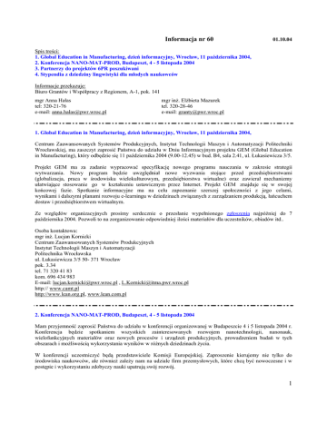 Informacja nr 60 01.10.04 Spis treści: 1. Global Education in Manufacturing, dzień informacyjny, Wrocław, 11 października 2004, 2. Konferencja NANO-MAT-PROD, Budapeszt, 4 - 5 listopada 2004 3. Partnerzy do projektów 6PR poszukiwani 4. Stypendia z dziedziny lingwistyki dla młodych naukowców Informacje przekazuje: Biuro Grantów i Współpracy z Regionem, A-1, pok. 141 mgr Anna Hałas tel: 320-21-76 e-mail: [email protected] mgr inż. Elżbieta Mazurek tel. 320-28-46 e-mail: [email protected] 1. Global Education in Manufacturing, dzień informacyjny, Wrocław, 11 października 2004, Centrum Zaawansowanych Systemów Produkcyjnych, Instytut Technologii Maszyn i Automatyzacji Politechniki Wrocławskiej, ma zaszczyt zaprosić Państwa do udziału w Dniu Informacyjnym projektu GEM (Global Education in Manufacturing), który odbędzie się 11 października 2004 (9.00-12.45) w bud. B4, sala 2.41, ul. Łukasiewicza 3/5. Projekt GEM ma za zadanie wypracować specyfikację nowego programu nauczania w zakresie strategii wytwarzania. Nowy program będzie uwzględniał nowe wyzwania stojące przed przedsiębiorstwami (globalizacja, praca w środowisku wielokulturowym, przedsiębiorstwa wirtualne) oraz zawierał mechanizmy ułatwiające stosowanie go w kształceniu ustawicznym przez Internet. Projekt GEM znajduje się w swojej końcowej fazie. Spotkanie informacyjne ma na celu zapoznanie szerszej społeczności z jego celami, wynikami i dalszymi planami rozwoju e-learningu w dziedzinach związanych z zarządzaniem produkcją, łańcuchem dostaw i przedsiębiorstwem wirtualnym. Ze względów organizacyjnych prosimy serdecznie o przesłanie wypełnionego zgłoszenia najpóźniej do 7 października 2004. Pozwoli to na zorganizowanie odpowiedniej ilości materiałów dla uczestników, obiadów itd.. Osoba kontaktowa: mgr inż. Lucjan Kornicki Centrum Zaawansowanych Systemów Produkcyjnych Instytut Technologii Maszyn i Automatyzacji Politechnika Wrocławska ul. Łukasiewicza 3/5 50- 371 Wrocław pok. 3.34 tel. 71 320 41 83 kom. 696 434 983 E-mail: [email protected] , [email protected] http:// www.camt.pl http://www.lean.org.pl, www.lean.com.pl 2. Konferencja NANO-MAT-PROD, Budapeszt, 4 - 5 listopada 2004 Mam przyjemność zaprosić Państwa do udziału w konferencji organizowanej w Budapeszcie 4 i 5 listopada 2004 r. Konferencja będzie spotkaniem wszystkich zainteresowanych rozwojem nanotechnologii, nanonauk, wielofunkcyjnych materiałów oraz nowych procesów i urządzeń produkcyjnych, prowadzeniem badań w tych obszarach i możliwością wykorzystania wyników w różnych dziedzinach życia. W konferencji uczestniczyć będą przedstawiciele Komisji Europejskiej. Zaproszenie kierujemy nie tylko do środowiska naukowców, ale również zależy nam na udziale firm przemysłowych, które chcą być nowoczesne i w postępie i wykorzystaniu zdobyczy nauki upatrują swój rozwój. 1 W programie konferencji przewidujemy: - dzień informacyjny priorytetu nanotechnologie, nanonauki, wielofunkcyjne materiały, nowe procesy i urządzenia produkcyjne - spotkania brokerskie, których celem jest ułatwianie tworzenia konsorcjów, uczestniczyć w nich będą specjalnie zaproszeni goście z kilku krajów, którzy mają ciekawe pomysły na projekty badawcze - prezentacje doświadczeń ekspertów biorących udział w ocenie wniosków - warsztaty dotyczące poszukiwania partnerów i tworzenia konsorcjów, zagadnień prawnych i administracyjnych - sesję, podczas której młodzi naukowcy będą mieli okazję zaprezentować swoje pomysły na projekty badawcze i przedyskutować je z doświadczonymi uczonymi - sesję dla MŚP i przemysłu, z udziałem MŚP, które odniosły sukces w projektach badawczych; MŚP podzielą się swoimi doświadczeniami oraz przedstawią wyniki projektów - sesję plakatową. Zapraszamy Państwa do nadsyłania propozycji prezentacji projektów badawczych. Dofinansujemy Państwu wyjazd na spotkania brokerskie również poza granice kraju lub sfinansujemy opłatę konferencyjną. Młodym naukowcom, którzy przedstawią interesujące idee projektów zaproponujemy krótkie wizyty w wybranych laboratoriach. Zachęcamy również młodych naukowców do nadsyłania streszczeń prac magisterskich i doktorskich. Autorom najbardziej obiecujących prac sfinansujemy uczestnictwo w międzynarodowych konferencjach, gdzie będą mogli prezentować swoje pomysły i wyniki, bądź ułatwimy nawiązanie kontaktów z renomowanymi instytutami w Europie. Więcej informacji o konferencji, w tym program, formularz zgłoszeniowy, formularz zgłoszenia prezentacji oraz informacje dotyczące zakwaterowania i dojazdu znajdziecie Państwo na stronie konferencji http://www.kpk.gov.pl/stef/index.php?id=i_nanomatprod. Konferencja organizowana jest w ramach projektu STEF-NANO-ACC, o którym więcej informacji można znaleźć na stronie projektu http://www.kpk.gov.pl/stef/index.php. Aleksandra Buczkowska Krajowy Punkt Kontaktowy Programów Badawczych UE ul. Świętokrzyska 21 Warszawa 3. Partnerzy do projektów 6PR poszukiwani 3. 1. Poszukiwany jest partner do projektu w konkursie łączonym w priorytecie NMP. Poniżej znajdziecie Państwo opis projektu w języku angielskim. Zgłoszenia prosimy przesyłać na adres [email protected] Introduction Semiconductor fabrication involves use of both process and inspection equipment. Current and future feature dimensions of semiconductors are of nano-metric dimensions and require at least the following characteristics: a.Suitable inspection system b.Positioning accuracy and stability c.Handling the inspected device with minimum stress d.Minimal particle contamination of the inspected device from the handling system Several techniques need to be used in order to meet the mentioned requirements. These techniques combine an inspection system, a motion system with a surface to lay and hold the device to be inspected or manipulated and a clean environment. Each of the mentioned technique