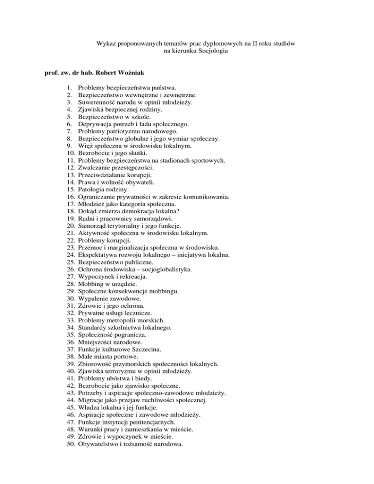 Wykaz proponowanych tematów prac dyplomowych na II roku studiów na kierunku Socjologia prof. zw. dr hab. Robert Woźniak 1. 2. 3. 4. 5. 6. 7. 8. 9. 10. 11. 12. 13. 14. 15. 16. 17. 18. 19. 20. 21. 22. 23. 24. 25. 26. 27. 28. 29. 30. 31. 32. 33. 34. 35. 36. 37. 38. 39. 40. 41. 42. 43. 44. 45. 46. 47. 48. 49. 50. Problemy bezpieczeństwa państwa. Bezpieczeństwo wewnętrzne i zewnętrzne. Suwerenność narodu w opinii młodzieży. Zjawiska bezpiecznej rodziny. Bezpieczeństwo w szkole. Deprywacja potrzeb i ładu społecznego. Problemy patriotyzmu narodowego. Bezpieczeństwo globalne i jego wymiar społeczny. Więź społeczna w środowisku lokalnym. Bezrobocie i jego skutki. Problemy bezpieczeństwa na stadionach sportowych. Zwalczanie przestępczości. Przeciwdziałanie korupcji. Prawa i wolność obywateli. Patologia rodziny. Ograniczanie prywatności w zakresie komunikowania. Młodzież jako kategoria społeczna. Dokąd zmierza demokracja lokalna? Radni i pracownicy samorządowi. Samorząd terytorialny i jego funkcje. Aktywność społeczna w środowisku lokalnym. Problemy korupcji. Przemoc i marginalizacja społeczna w środowisku. Ekspektatywa rozwoju lokalnego – inicjatywa lokalna. Bezpieczeństwo publiczne. Ochrona środowiska – socjoglobalistyka. Wypoczynek i rekreacja. Mobbing w urzędzie. Społeczne konsekwencje mobbingu. Wypalenie zawodowe. Zdrowie i jego ochrona. Prywatne usługi lecznicze. Problemy metropolii morskich. Standardy szkolnictwa lokalnego. Społeczność pogranicza. Mniejszości narodowe. Funkcje kulturowe Szczecina. Małe miasta portowe. Zbiorowość przymorskich społeczności lokalnych. Zjawiska terroryzmu w opinii młodzieży. Problemy ubóstwa i biedy. Bezrobocie jako zjawisko społeczne. Potrzeby i aspiracje społeczno-zawodowe młodzieży. Migracje jako przejaw ruchliwości społecznej. Władza lokalna i jej funkcje. Aspiracje społeczne i zawodowe młodzieży. Funkcje instytucji penitencjarnych. Warunki pracy i zamieszkania w mieście. Zdrowie i wypoczynek w mieście. Obywatelstwo i tożsamość narodowa. 51. 52. 53. 54. 55. 56. 57. 58. 59. Agresja i przemoc. Problemy migracji. Praca za granicą. Pogranicze jako obszar życia społecznego. Zróżnicowanie społeczne. Ataki na pozycję – plotki i pomówienia. Wtórne bezrobocie w małym mieście. Społeczno-kulturowe uwarunkowania ruchliwości społecznej. Społeczny wymiar firmy.