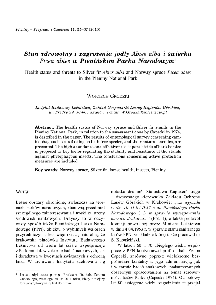 Pieniny – Przyroda i Człowiek 11: 55–67 (2010) Stan zdrowotny i zagrożenia jodły Abies alba i świerka Picea abies w Pienińskim Parku Narodowym1 Health status and threats to Silver fir Abies alba and Norway spruce Picea abies in the Pieniny National Park WOJCIECH GRODZKI Instytut Badawczy Leśnictwa, Zakład Gospodarki Leśnej Regionów Górskich, ul. Fredry 39, 30-605 Kraków, e-mail: [email protected] Abstract. The health status of Norway spruce and Silver fir stands in the Pieniny National Park, in relation to the assessment done by Capecki in 1974, is described in the paper. The results of entomological survey concerning cambiophagous insects feeding on both tree species, and their natural enemies, are presented. The high abundance and effectiveness of parasitoids of bark beetles is proposed as key factor regulating the stability and resistance of the stands against phytophagous insects. The conclusions concerning active protection measures are included. Key words: Norway spruce, Silver fir, forest health, insects, Pieniny WSTĘP Leśne obszary chronione, zwłaszcza na terenach parków narodowych, stanowią przedmiot szczególnego zainteresowania i troski ze strony środowisk naukowych. Dotyczy to w oczywisty sposób także Pienińskiego Parku Narodowego (PPN), obiektu o wybitnych walorach przyrodniczych. Jest więc rzeczą naturalną, że krakowska placówka Instytutu Badawczego Leśnictwa od wielu lat ściśle współpracuje z Parkiem, tak w zakresie badań naukowych, jak i doradztwa w kwestiach związanych z ochroną lasu. W archiwum Instytutu zachowała się 1 Praca dedykowana pamięci Profesora Dr. hab. Zenona Capeckiego, zmarłego 24 IV 2011 roku, kiedy niniejszy tom przygotowywany był do druku. notatka dra inż. Stanisława Kapuścińskiego – ówczesnego kierownika Zakładu Ochrony Lasów Górskich w Krakowie: „...z wyjazdu w dn. 10–11.09.1952 r. do Pienińskiego Parku Narodowego (...) w sprawie występowania kornika drukarza...” (Fot. 1), a także protokół komisji powołanej przez Ministra Leśnictwa w dniu 4.04.1953 r. w sprawie stanu sanitarnego lasów PPN, w składzie której także pracował dr S. Kapuściński. W latach 60. i 70 ubiegłego wieku współpracę z PPN kontynuował prof. dr hab. Zenon Capecki, zarówno poprzez wielokrotne bezpośrednie kontakty z jego administracją, jak i w formie badań naukowych, podsumowanych obszernym opracowaniem na temat zdrowotności lasów Parku (Capecki 1974). Od połowy lat 80. ubiegłego wieku zagadnienia te przejął 56 W. Grodzki – Stan zdrowotny i zagrożenia jodły i świerka w PPN Fot. 1. Pierwsza strona sprawozdania S. Kapuścińskiego z wyjazdu do Pienińskiego Parku Narodowego w roku 1952. First page of S Kapuściński’s report from the trip to Pieniny National Park in 1952. autor niniejszego artykułu, którego współpraca z Parkiem w zakresie ochrony lasu trwa do dnia dzisiejszego. Jej owocem są opracowania, które powstały w odpowiedzi na bieżące potrzeby PPN (Grodzki 1992, 2000, 2002). Ich kontynuację stanowi niniejszy artykuł, będący kolejną próbą oceny zdrowotności i zagrożenia lasów pienińskich, ze szczególnym uwzględnieniem występujących w nich jodły Abies alba Mill. i świerka Picea abies (L.) Karst. W. Grodzki – Stan zdrowotny i zagrożenia jodły i świerka w PPN CHARAKTERYSTYKA DRZEWOSTANÓW I ŹRÓDEŁ ICH ZAGROŻENIA Charakterystyka drzewostanów Według klasyfikacji Capeckiego i Tutei (1974) Pieniński PN zaliczony został do obszarów o dużym udziale drzewostanów jodłowych, zajmujących przedział 500–2000 ha. W opracowaniach wykonanych w ramach planu ochrony PPN w 2000 r. powierzchnia zajmowana przez jodłowe zbiorowiska leśne (Dentario glandulosae – Fagetum abietetosum i Carici albae – Fagetum abietetosum) oszacowana została na 930 ha (Wróbel 2003), co nie jest wprawdzie równoznaczne z powierzchnią drzewostanów jodłowych, jednak świadczy o bardzo istotnym udziale jodły w drzewostanach. Według Capeckiego (1997) udział drzewostanów z przewagą jodły w strefie ochrony ścisłej wynosi 62%, a w strefie ochrony czynnej 49%. Drzewostany z przewagą świerka dominują w zachodniej części Parku, objętej ochroną czynną. Ich udział w tej strefie wynosi 36%, wobec 11% w strefie ochrony ścisłej. Są to drzewostany leżące w reglu dolnym, stosunkowo łatwo dostępne, a przez to poddane w przeszłości znacznym przekształceniom w wyniku gospodarki ludzkiej. Cechuje je znaczna podatność na działalność wiatru i śniegu oraz choroby (zwłaszcza powodowane przez patogeny korzeni) i wzmożone występowanie owadów kambiofagicznych, których pojawy kilkakrotnie miały miejsce w drugiej połowie ubiegłego wieku (Capecki 1997). Zdrowotność drzewostanów W latach 1970–72, na podstawie szczegółowych badań, został opracowany podział obszaru Parku na trzy strefy zdrowotności (Capecki 1974) (Ryc. 1): Lasy odporne – wschodnia część Parku od Dunajca do szlaku Krościenko – Sromowce Niżne, stanowiąca ok. 28% jego powierzchni. Obszar objęty niemal w całości ochroną ścisłą, lasy o znacznym stopniu zróżnicowania gatunkowego i strukturalnego oraz dobrze funkcjonujących mechanizmach samoregulacyjnych, w których dynamiczne procesy ekologiczne 57 (w tym wydzielanie drzew i powstawanie odnowień) mają charakter naturalny, nie zagrażający trwałości lasu. Lasy osłabione – środkowa część Parku do doliny Strasznego i Hałuszowskiego Potoku, stanowiąca również 28% jego powierzchni. Obszar objęty w zdecydowanej większości ochroną ścisłą, z niewielkimi powierzchniami w ochronie czynnej. Występujące w przewadze fragmenty lasów zróżnicowanych gatunkowo cechują się lepszym stanem zdrowotnym i wyższą stabilnością, niż drzewostany ze znaczniejszym udziałem jodły, a zwłaszcza ustępującego z drzewostanów świerka. W obszarach ochrony czynnej, położonych w części północnej, obserwowane są jednak sy
