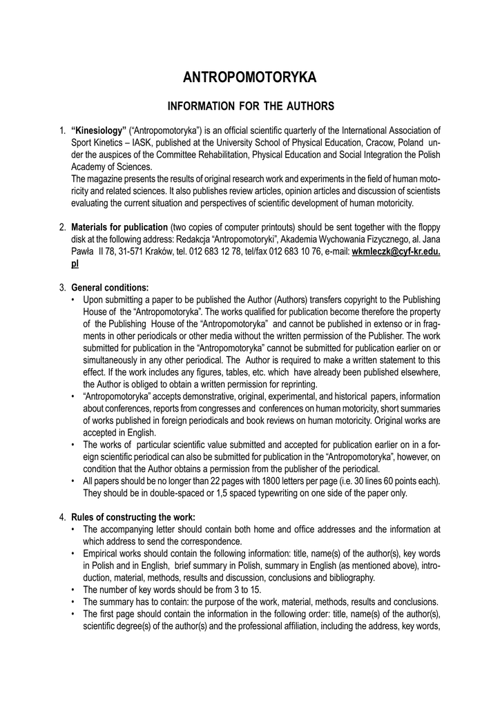 ANTROPOMOTORYKA INFORMATION FOR THE AUTHORS 1. “Kinesiology” (“Antropomotoryka”) is an official scientific quarterly of the International Association of Sport Kinetics – IASK, published at the University School of Physical Education, Cracow, Poland under the auspices of the Committee Rehabilitation, Physical Education and Social Integration the Polish Academy of Sciences. The magazine presents the results of original research work and experiments in the field of human motoricity and related sciences. It also publishes review articles, opinion articles and discussion of scientists evaluating the current situation and perspectives of scientific development of human motoricity. 2. Materials for publication (two copies of computer printouts) should be sent together with the floppy disk at the following address: Redakcja “Antropomotoryki”, Akademia Wychowania Fizycznego, al. Jana Pawła II 78, 31-571 Kraków, tel. 012 683 12 78, tel/fax 012 683 10 76, e-mail: [email protected]. pl 3. General conditions: • Upon submitting a paper to be published the Author (Authors) transfers copyright to the Publishing House of the “Antropomotoryka”. The works qualified for publication become therefore the property of the Publishing House of the “Antropomotoryka” and cannot be published in extenso or in fragments in other periodicals or other media without the written permission of the Publisher. The work submitted for publication in the “Antropomotoryka” cannot be submitted for publication earlier on or simultaneously in any other periodical. The Author is required to make a written statement to this effect. If the work includes any figures, tables, etc. which have already been published elsewhere, the Author is obliged to obtain a written permission for reprinting. • “Antropomotoryka” accepts demonstrative, original, experimental, and historical papers, information about conferences, reports from congresses and conferences on human motoricity, short summaries of works published in foreign periodicals and book reviews on human motoricity. Original works are accepted in English. • The works of particular scientific value submitted and accepted for publication earlier on in a foreign scientific periodical can also be submitted for publication in the “Antropomotoryka”, however, on condition that the Author obtains a permission from the publisher of the periodical. • All papers should be no longer than 22 pages with 1800 letters per page (i.e. 30 lines 60 points each). They should be in double-spaced or 1,5 spaced typewriting on one side of the paper only. 4. Rules of constructing the work: • The accompanying letter should contain both home and office addresses and the information at which address to send the correspondence. • Empirical works should contain the following information: title, name(s) of the author(s), key words in Polish and in English, brief summary in Polish, summary in English (as mentioned above), introduction, material, methods, results and discussion, conclusions and bibliography. • The number of key words should be from 3 to 15. • The summary has to contain: the purpose of the work, material, methods, results and conclusions. • The first page should contain the information in the following order: title, name(s) of the author(s), scientific degree(s) of the author(s) and the professional affiliation, including the address, key words, brief summary in Polish and in English. The summary should not contain less than 200 and to more than 250 words. • The reference materials should be listed on a separate sheet of paper. Only the aterials the Author refers to in the text may be included. They should be numbered using Arabic numerals and placed in the order they are quoted in the work (not in the alphabetic order). Each item of the reference materials should be written in a new verse. The surname(s) of the author(s) of the quoted work should be followed by the initials of their first name(s), then the original title of the magazine where the work was published should be given. The abbreviation of the title of a magazine should be taken from the Index Medicus (or International Committee of Medical Journal Editors: Uniform Requirements for manuscripts submitted in biomedical journals. N Engl J Med 1997; 336, 309–315). Examples: a) works printed in magazines: • Casella R, Bubendorf L, Sauter G, Moch H, Michatsch MJ, Gasser TC: Focal neuroendocrine differentiation lacks prognostics significance in prostate core needle biopsies. J Urol, 1998; 160: 406–410. b) monographs: • Matthews DE, Farewell VT: Using and Understanding Medical Statistics, ed 3, revised. Basel, Karger, 1966. c) chapters in textbooks: • Parren PWHI, Burton DR: Antibodies against HIV-1 from phage display libraries; Mapping of an immune response and progress towards antiviral immunotherapy; in Capra JD (ed): Antibody Engineering, Chem. Immunol. Basel, Karger, 1997, 65: 18–56. • Kokot F: Fizjologia nerek; (w:) Zieliński J, Leńko J (eds): Urologia, Warszawa, PZWL, 1992, 1: 9–20. All the illustrations have to be of high quality. Graphic material should be submitted on white sheets of paper. Copies of photographs and photographs should be submitted on glossy paper. The consecutive number of the photograph should be written with a soft pencil on the back side of each photograph as well as an arrow marking its top edge. Only black and white pictures are printed. Scales and pictures should be placed on separate pages and numbered with Arabic numerals. The headings, descriptions and suscriptions under the pictures and above the scales should be written in Polish and English. Example in Polish: Tabela 1., Ryc. 1., Objaśnienia, Chłopcy Example in English: Table 1., Fig. 1., Commentary, Boys Please, use round parentheses. Physical or chemical formulae should be written clearly. This refers particularly to indices and exponents. The article can be written using the editor of 