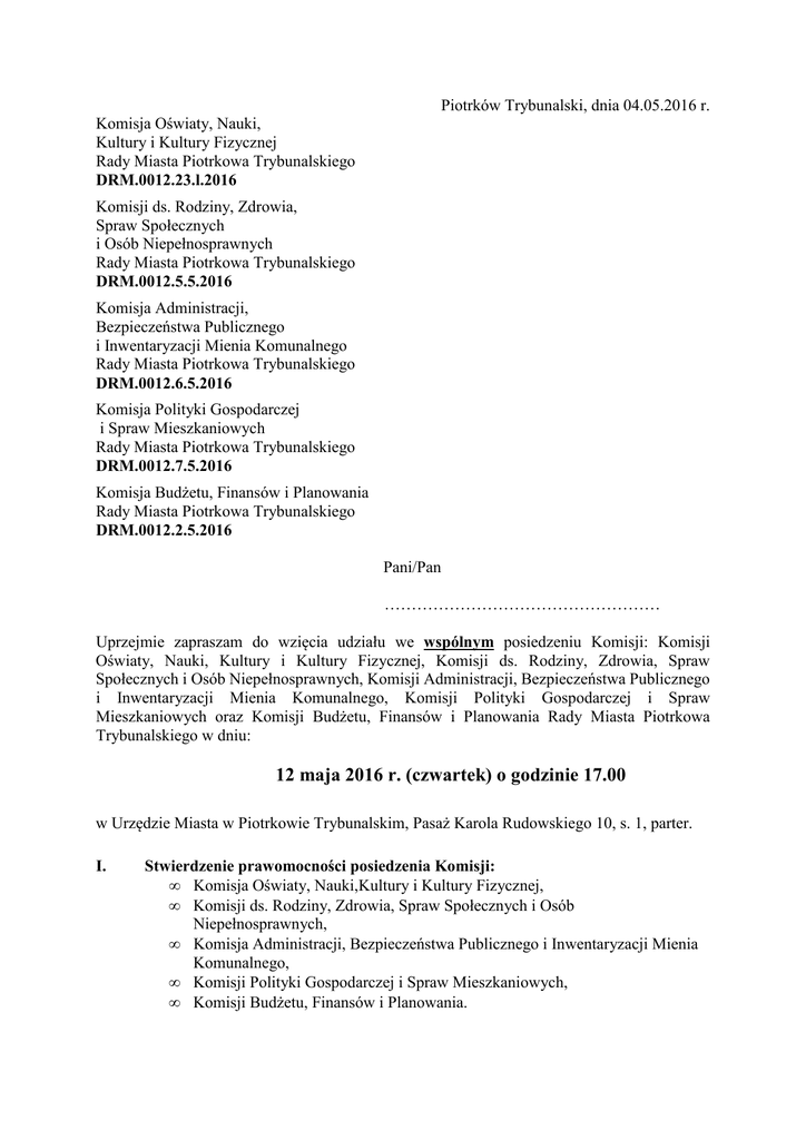 Piotrków Trybunalski, dnia 04.05.2016 r. Komisja Oświaty, Nauki, Kultury i Kultury Fizycznej Rady Miasta Piotrkowa Trybunalskiego DRM.0012.23.l.2016 Komisji ds. Rodziny, Zdrowia, Spraw Społecznych i Osób Niepełnosprawnych Rady Miasta Piotrkowa Trybunalskiego DRM.0012.5.5.2016 Komisja Administracji, Bezpieczeństwa Publicznego i Inwentaryzacji Mienia Komunalnego Rady Miasta Piotrkowa Trybunalskiego DRM.0012.6.5.2016 Komisja Polityki Gospodarczej i Spraw Mieszkaniowych Rady Miasta Piotrkowa Trybunalskiego DRM.0012.7.5.2016 Komisja Budżetu, Finansów i Planowania Rady Miasta Piotrkowa Trybunalskiego DRM.0012.2.5.2016 Pani/Pan …………………………………………… Uprzejmie zapraszam do wzięcia udziału we wspólnym posiedzeniu Komisji: Komisji Oświaty, Nauki, Kultury i Kultury Fizycznej, Komisji ds. Rodziny, Zdrowia, Spraw Społecznych i Osób Niepełnosprawnych, Komisji Administracji, Bezpieczeństwa Publicznego i Inwentaryzacji Mienia Komunalnego, Komisji Polityki Gospodarczej i Spraw Mieszkaniowych oraz Komisji Budżetu, Finansów i Planowania Rady Miasta Piotrkowa Trybunalskiego w dniu: 12 maja 2016 r. (czwartek) o godzinie 17.00 w Urzędzie Miasta w Piotrkowie Trybunalskim, Pasaż Karola Rudowskiego 10, s. 1, parter. I. Stwierdzenie prawomocności posiedzenia Komisji: • Komisja Oświaty, Nauki,Kultury i Kultury Fizycznej, • Komisji ds. Rodziny, Zdrowia, Spraw Społecznych i Osób Niepełnosprawnych, • Komisja Administracji, Bezpieczeństwa Publicznego i Inwentaryzacji Mienia Komunalnego, • Komisji Polityki Gospodarczej i Spraw Mieszkaniowych, • Komisji Budżetu, Finansów i Planowania. II. Proponowany porządek dzienny posiedzenia: Komisja Oświaty, Nauki, Kultury i Kultury Fizycznej 1. Zaopiniowanie sprawozdania rocznego z wykonania planu finansowego instytucji kultury w 2015 roku. 2. Zaopiniowanie sprawozdania o kształtowaniu się Wieloletniej Prognozy Finansowej Miasta Piotrkowa Trybunalskiego za 2015 rok. 3. Zaopiniowanie sprawozdania z wykonania budżetu Miasta Piotrkowa Trybunalskiego za 2015 rok wraz z korektą z dnia 15 kwietnia 2016 r. i informacją o stanie mienia Miasta Piotrkowa Trybunalskiego na dzień 31 grudnia 2015 roku w następujących działach: a) b) c) d) e) dział 630 - Turystyka, dział 801 – Oświata i wychowanie, dział 854 – Edukacja i opieka wychowawcza, dział 921 – Kultura i ochrona dziedzictwa narodowego, dział 926 – Kultura fizyczna i sport. Komisji ds. Rodziny, Zdrowia, Spraw Społecznych i Osób Niepełnosprawnych 1. Zaopiniowanie sprawozdania o kształtowaniu się Wieloletniej Prognozy Finansowej Miasta Piotrkowa Trybunalskiego za 2015 rok. 2. Zaopiniowanie sprawozdania z wykonania budżetu Miasta Piotrkowa Trybunalskiego za 2015 rok wraz z korektą z dnia 15 kwietnia 2016 r. i informacją o stanie mienia Miasta Piotrkowa Trybunalskiego na dzień 31 grudnia 2015 roku w następujących działach: a) dział 851 - Ochrona zdrowia, b) dział 852 - Pomoc społeczna, c) dział 853 - Pozostałe zadania w zakresie polityki społecznej. Komisji Administracji, Bezpieczeństwa Publicznego i Inwentaryzacji Mienia Komunalnego: 1. Zaopiniowanie sprawozdania o kształtowaniu się Wieloletniej Prognozy Finansowej Miasta Piotrkowa Trybunalskiego za 2015 rok. 2. Zaopiniowanie sprawozdania z wykonania budżetu Miasta Piotrkowa Trybunalskiego za 2015 rok wraz z korektą z dnia 15 kwietnia 2016 r. i informacją o stanie mienia Miasta Piotrkowa Trybunalskiego na dzień 31 grudnia 2015 roku w następujących działach: a) b) c) d) e) f) dział 600 - Transport i łączność, dział 750 – Administracja publiczna, dział 751 – Urzędy naczelnych organów władzy państwowej, dział 754 – Bezpieczeństwo publiczne i ochrona przeciwpożarowa, dział 900 - Gospodarka komunalna i ochrona środowiska, plan wydatków jednostek pomocniczych. Komisji Polityki Gospodarczej i Spraw Mieszkaniowych 1. 2. Zaopiniowanie sprawozdania o kształtowaniu się Wieloletniej Prognozy Finansowej Miasta Piotrkowa Trybunalskiego za 2015 rok. Zaopiniowanie sprawozdania z wykonania budżetu Miasta Piotrkowa Trybunalskiego za 2015 rok wraz z korektą z dnia 15 kwietnia 2016 r. i informacją o stanie mienia Miasta Piotrkowa Trybunalskiego na dzień 31 grudnia 2015 roku w następujących działach: a) 600 – Transport i łączność, b) 700 – Gospodarka mieszkaniowa, c) 710 – Działalność usługowa, d) 900 – Gospodarka komunalna i ochrona środowiska. Komisja Budżetu Finansów i Planowania 1. 2. 3. Zaopiniowanie sprawozdania rocznego z wykonania planu finansowego instytucji kultury za 2015 r. Zaopiniowanie sprawozdania o kształtowaniu się Wieloletniej Prognozy Finansowej Miasta Piotrkowa Trybunalskiego za 2015 rok. Zaopiniowanie sprawozdania: finansowego Miasta za 2015 r., z wykonania budżetu miasta Piotrkowa Trybunalskiego za 2015 r. z korektą z dnia 15 kwietnia 2016 r. i informacją o stanie mienia Miasta na dzień 31.12.2015 r. W uzgodnieniu z Przewodniczącymi Komisji Oświaty, Nauki, Kultury i Kultury Fizycznej, Komisji ds. Rodziny, Zdrowia Spraw Społecznych i Osób Niepełnosprawnych, Komisji Administracji, Bezpieczeństwa Publicznego i Inwentaryzacji Mienia Komunalnego oraz Komisji Budżetu, Finansów i Planowania Rady Miasta Piotrkowa Trybunalskiego Przewodniczący Komisji Polityki Gospodarczej i Spraw Mieszkaniowych Jan Dziemdziora Uwaga: Podstawa prawna do zwolnienia Radnego/go od pracy zawodowej art.25 ust. 3 ustawy z dnia 8 marca 1990 roku o samorządzie gminnym (tj. Dz. U. z 2016 r. poz.466)