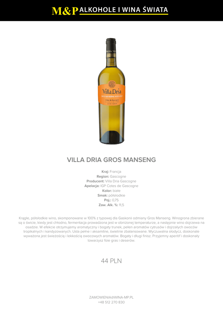 VILLA DRIA GROS MANSENG Kraj: Francja Region: Gascogne Producent: Villa Dria Gascogne Apelacja: IGP Cotes de Gascogne Kolor: białe Smak: półsłodkie Poj.: 0,75 Zaw. Alk. %: 11,5 Krągłe, półsłodkie wino, skomponowane w 100% z typowej dla Gaskonii odmiany Gros Manseng. Winogrona zbierane są o świcie, kiedy jest chłodno, fermentacja prowadzona jest w obniżonej temperaturze, a następnie wino dojrzewa na osadzie. W efekcie otrzymujemy aromatyczny i bogaty trunek, pełen aromatów cytrusów i dojrzałych owoców tropikalnych i kandyzowanych. Usta pełne i aksamitne, świetnie zbalansowane. Wyczuwalna słodycz, doskonale wyważona jest świeżością i lekkością owocowych aromatów. Bogaty i długi finisz. Przyjemny aperitif i doskonały towarzysz foie gras i deserów. 44 PLN [email protected] +48 512 270 830