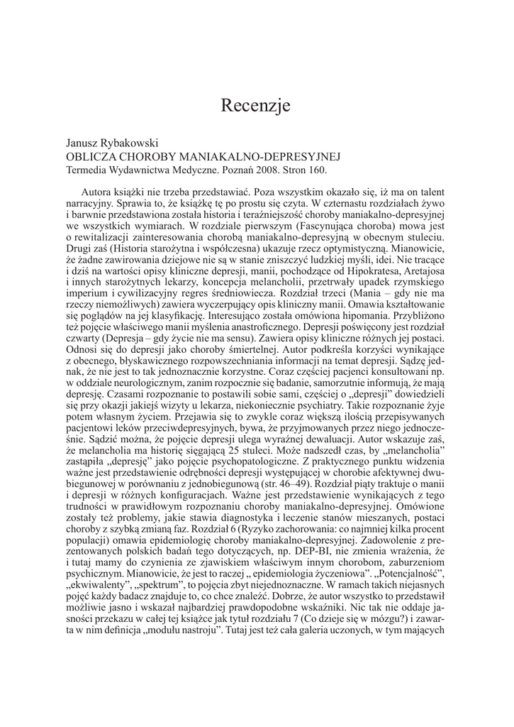 Recenzje 99 Recenzje Janusz Rybakowski Oblicza choroby maniakalno-depresyjnej Termedia Wydawnictwa Medyczne. Poznań 2008. Stron 160. Autora książki nie trzeba przedstawiać. Poza wszystkim okazało się, iż ma on talent narracyjny. Sprawia to, że książkę tę po prostu się czyta. W czternastu rozdziałach żywo i barwnie przedstawiona została historia i teraźniejszość choroby maniakalno-depresyjnej we wszystkich wymiarach. W rozdziale pierwszym (Fascynująca choroba) mowa jest o rewitalizacji zainteresowania chorobą maniakalno-depresyjną w obecnym stuleciu. Drugi zaś (Historia starożytna i współczesna) ukazuje rzecz optymistyczną. Mianowicie, że żadne zawirowania dziejowe nie są w stanie zniszczyć ludzkiej myśli, idei. Nie tracące i dziś na wartości opisy kliniczne depresji, manii, pochodzące od Hipokratesa, Aretajosa i innych starożytnych lekarzy, koncepcja melancholii, przetrwały upadek rzymskiego imperium i cywilizacyjny regres średniowiecza. Rozdział trzeci (Mania – gdy nie ma rzeczy niemożliwych) zawiera wyczerpujący opis kliniczny manii. Omawia kształtowanie się poglądów na jej klasyfikację. Interesująco została omówiona hipomania. Przybliżono też pojęcie właściwego manii myślenia anastroficznego. Depresji poświęcony jest rozdział czwarty (Depresja – gdy życie nie ma sensu). Zawiera opisy kliniczne różnych jej postaci. Odnosi się do depresji jako choroby śmiertelnej. Autor podkreśla korzyści wynikające z obecnego, błyskawicznego rozpowszechniania informacji na temat depresji. Sądzę jednak, że nie jest to tak jednoznacznie korzystne. Coraz częściej pacjenci konsultowani np. w oddziale neurologicznym, zanim rozpocznie się badanie, samorzutnie informują, że mają depresję. Czasami rozpoznanie to postawili sobie sami, częściej o „depresji” dowiedzieli się przy okazji jakiejś wizyty u lekarza, niekoniecznie psychiatry. Takie rozpoznanie żyje potem własnym życiem. Przejawia się to zwykle coraz większą ilością przepisywanych pacjentowi leków przeciwdepresyjnych, bywa, że przyjmowanych przez niego jednocześnie. Sądzić można, że pojęcie depresji ulega wyraźnej dewaluacji. Autor wskazuje zaś, że melancholia ma historię sięgającą 25 stuleci. Może nadszedł czas, by „melancholia” zastąpiła „depresję” jako pojęcie psychopatologiczne. Z praktycznego punktu widzenia ważne jest przedstawienie odrębności depresji występującej w chorobie afektywnej dwubiegunowej w porównaniu z jednobiegunową (str. 46–49). Rozdział piąty traktuje o manii i depresji w różnych konfiguracjach. Ważne jest przedstawienie wynikających z tego trudności w prawidłowym rozpoznaniu choroby maniakalno-depresyjnej. Omówione zostały też problemy, jakie stawia diagnostyka i leczenie stanów mieszanych, postaci choroby z szybką zmianą faz. Rozdział 6 (Ryzyko zachorowania: co najmniej kilka procent populacji) omawia epidemiologię choroby maniakalno-depresyjnej. Zadowolenie z prezentowanych polskich badań tego dotyczących, np. DEP-BI, nie zmienia wrażenia, że i tutaj mamy do czynienia ze zjawiskiem właściwym innym chorobom, zaburzeniom psychicznym. Mianowicie, że jest to raczej „ epidemiologia życzeniowa”. „Potencjalność”, „ekwiwalenty”, „spektrum”, to pojęcia zbyt niejednoznaczne. W ramach takich niejasnych pojęć każdy badacz znajduje to, co chce znaleźć. Dobrze, że autor wszystko to przedstawił możliwie jasno i wskazał najbardziej prawdopodobne wskaźniki. Nic tak nie oddaje jasności przekazu w całej tej książce jak tytuł rozdziału 7 (Co dzieje się w mózgu?) i zawarta w nim definicja „modułu nastroju”. Tutaj jest też cała galeria uczonych, w tym mających 100 Recenzje polskie korzenie. W sumie rozdział ten jest prostym, jasnym wykładem o neuroanatomii i neurochemii emocji. Kończąc go autor wskazuje, że szybko postępujące poszerzanie informacji na ten temat pozwala na przypuszczenie, że za kilka lat obraz ten może istotnie różnić się od zarysowanego w rozdziale. Jest to wielce prawdopodobne. Droga, jaką przebyły badania nad tym „co dzieje się w mózgu”, w ciągu zaledwie trzech dziesięcioleci, jest niezwykła. Od pochodzącej z 1964 r. książki noblisty Johna C. Ecclesa „Fizjologia synaps nerwowych” (wydanie polskie w 1968 r.), w której nie ma wzmianki o dopaminie, serotoninie (wspomina się o obecności 5-hydroksytryptaminy u mięczaków), do książki noblisty Francisa Cricka „Zdumiewająca hipoteza, czyli nauka w poszukiwaniu duszy” (wydanie polskie w 1997 r.). Rozdział 8 (Genetyka dawna i nowa), podobnie jak poprzedni mógłby mieć podtytuł „Czyli jak to prosto wyłożyć”. W nim także nie brak nazwisk uczonych szczególnie na tym polu zasłużonych. Ważne jest wskazanie, jak wspólnota pewnych genów dla choroby maniakalno-depresyjnej i schizofrenii tłumaczy obecność objawów psychotycznych niezgodnych z nastrojem w depresji, manii, fenomen choroby schizoafektywnej. Przyznam, że dopiero to złagodziło moją rezerwę do rozpoznawania depresji w przypadkach z omamami, urojeniami z nastrojem niezgodnymi. Rozdział 9 (Perspektywa ewolucyjna: dlaczego geny choroby utrzymują się w populacji?) czyta się trochę jak nowelę sensacyjną. Początkowo trudno jest zaakceptować myśl, że geny odpowiedzialne za chorobę kiedyś zadecydowały o przetrwaniu rodzaju ludzkiego. Ciekawe jednak, w związku z tym, uwagi o znaczeniu stanów podwyższonego nastroju w adaptacji do różnych wyzwań środowiska. Intrygujące jest spojrzenie na USA jako kraj, w którym doszło prawdopodobnie do pozytywnej selekcji osobników z genami predysponującymi do zachowań maniakalnych. Jeśli jednak taka selekcja miała miejsce, to trzeba także pamiętać o wyższych, znacznie, wskaźnikach występowania schizofrenii wśród imigrantów przybyłych do USA, z wyjątkiem Anglików i Szkotów. Rozdział 10 (Kreatywność a cho