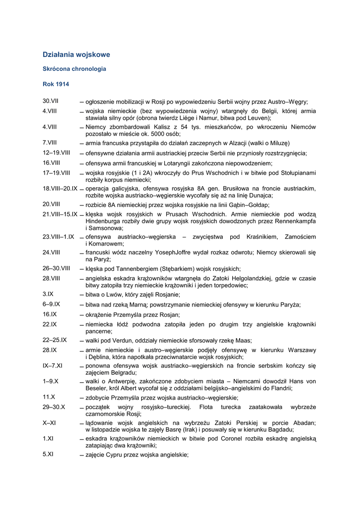 Działania wojskowe Skrócona chronologia Rok 1914 30.VII 4.VIII – ogłoszenie mobilizacji w Rosji po wypowiedzeniu Serbii wojny przez Austro–Węgry; – wojska niemieckie (bez wypowiedzenia wojny) wtargnęły do Belgii, której armia stawiała silny opór (obrona twierdz Liége i Namur, bitwa pod Leuven); Niemcy zbombardowali Kalisz z 54 tys. mieszkańców, po wkroczeniu Niemców pozostało w mieście ok. 5000 osób; 4.VIII – 7.VIII – armia francuska przystąpiła do działań zaczepnych w Alzacji (walki o Miluzę) – ofensywne działania armii austriackiej przeciw Serbii nie przyniosły rozstrzygnięcia; – ofensywa armii francuskiej w Lotaryngii zakończona niepowodzeniem; – wojska rosyjskie (1 i 2A) wkroczyły do Prus Wschodnich i w bitwie pod Stołupianami 12–19.VIII 16.VIII 17–19.VIII 18.VIII–20.IX – rozbiły korpus niemiecki; operacja galicyjska, ofensywa rosyjska 8A gen. Brusiłowa na froncie austriackim, rozbite wojska austriacko–węgierskie wycofały się aż na linię Dunajca; – rozbicie 8A niemieckiej przez wojska rosyjskie na linii Gąbin–Gołdap; 21.VIII–15.IX – klęska wojsk rosyjskich w Prusach Wschodnich. Armie niemieckie pod wodzą 20.VIII Hindenburga rozbiły dwie grupy wojsk rosyjskich dowodzonych przez Rennenkampfa i Samsonowa; ofensywa austriacko–węgierska – zwycięstwa pod Kraśnikiem, Zamościem i Komarowem; francuski wódz naczelny YosephJoffre wydał rozkaz odwrotu; Niemcy skierowali się na Paryż; 23.VIII–1.IX – 24.VIII – 26–30.VIII – klęska pod Tannenbergiem (Stębarkiem) wojsk rosyjskich; – angielska eskadra krążowników wtargnęła do Zatoki Helgolandzkiej, gdzie w czasie 28.VIII bitwy zatopiła trzy niemieckie krążowniki i jeden torpedowiec; 3.IX 6–9.IX 16.IX 22.IX – bitwa o Lwów, który zajęli Rosjanie; – bitwa nad rzeką Marną; powstrzymanie niemieckiej ofensywy w kierunku Paryża; – okrążenie Przemyśla przez Rosjan; – niemiecka łódź podwodna zatopiła jeden po drugim trzy angielskie krążowniki pancerne; 22–25.IX 28.IX – walki pod Verdun, oddziały niemieckie sforsowały rzekę Maas; – armie niemieckie i austro–węgierskie podjęły ofensywę w kierunku Warszawy i Dęblina, która napotkała przeciwnatarcie wojsk rosyjskich; ponowna ofensywa wojsk austriacko–węgierskich na froncie serbskim kończy się zajęciem Belgradu; walki o Antwerpię, zakończone zdobyciem miasta – Niemcami dowodził Hans von Beseler, król Albert wycofał się z oddziałami belgijsko–angielskimi do Flandrii; IX–7.XI – 1–9.X – 11.X 29–30.X – zdobycie Przemyśla przez wojska austriacko–węgierskie; – początek wojny rosyjsko–tureckiej. Flota turecka X–XI – 1.XI – 5.XI – zajęcie Cypru przez wojska angielskie; zaatakowała wybrzeże czarnomorskie Rosji; lądowanie wojsk angielskich na wybrzeżu Zatoki Perskiej w porcie Abadan; w listopadzie wojska te zajęły Basrę (Irak) i posuwały się w kierunku Bagdadu; eskadra krążowników niemieckich w bitwie pod Coronel rozbiła eskadrę angielską zatapiając dwa krążowniki; 7.XI – zdobycie twierdzy Tsingtao; okręty brytyjskie zniszczyły niemieckie siły morskie w rejonie wysp należących do Niemiec; Anglicy w pobliżu Wysp Falklandzkich rozbijają eskadrę niemiecką zatapiając wszystkie okręty – zdołał ujść tylko jeden krążownik; 8.XI – 16.XI–17.XII – po bitwach pod Łodzią i Łowiczem Rosjanie zajmują oba miasta; – ciężkie walki pod Łodzią, Rosjanie zatrzymują atak niemiecki (atak Niemcy powtarzają 17–24.XI 1–6.XII również bez skutku); XI 5–17.XII – wojska tureckie wtargnęły do perskiego Azerbejdżanu; – zwycięstwo Austriaków pod Limanową; cofnięcie się wojsk rosyjskich o kilkadziesiąt kilometrów, początek walk pozycyjnych; w rejonie miasta Sarykamysz (Turcja) Rosjanie rozbili 10 korpus turecki; w pierwszych dniach grudnia armia serbska przeszła do kontrnatarcia, austriacy ponieśli klęskę i zostali odrzuceni poza granice Serbii; XII – od XII – zajęcie niemieckich terytoriów Oceanii przez Nową Zelandię i Australię. – próby sforsowania Karpat przez wojska rosyjskie i dotarcia na Węgry. Rok 1915 pocz. roku – Turcy wysyłają armię ekspedycyjną w celu opanowania Kanału Sueskiego, atak został odparty przez wojska angielskie; 14.I 4.II – wojska tureckie zdobyły Tebryz, osłabiło to wpływy rosyjskie w Persji; – początek wojny podwodnej, oświadczenie Niemiec, że flota niemiecka nie będzie zatapiać statków państw neutralnych; 16.II–20.III 19.II–IV – bitwa w Szampanii, odparcie przez Niemców ataków francuskich; – działania floty brytyjsko–francuskiej i desantu w celu opanowania cieśnin Dardanele i Bosfor nie powiodły się; II 22.III 22.IV – klęska wojsk rosyjskich w walkach nad jeziorami mazurskimi; – twierdza Przemyśl ponownie w rękach Austriaków; – zastosowanie przez Niemców gazów trujących (pod Ypres w Belgii) – najpierw chloru, później (VII.1917) gazu musztardowego, zwanego odtąd iperytem; uderzenie niemieckie na Litwę i Kurlandię, zdobycie (7.V) Libawy. Klęska wojsk rosyjskich; przełamanie frontu rosyjskiego pod Gorlicami. Odwrót armii rosyjskiej z Galicji, Bukowiny i Podkarpacia; niemiecki okręt podwodny zatopił angielski statek pasażerski “Lusitania”; zginęło 1196 osób; 29.IV–9.V – 1–22.V – 7.V – 8.VI – Rosjanie opuszczają Stanisławów; – Austriacy weszli do Lwowa; – rozpoczęcie ofensywy niemiecko–austriackiej od Bałtyku do Bugu i Sanu. Zajęcie 22.VI 1.VII przez Austriaków Lublina, Chełma i twierdzy Dęblin. Niemcy zajmują Kowno, Modlin, Białystok, Brześć i Grodno; 5.VIII X 6–19.IX – wojska niemieckie wkraczają do Warszawy; – w Salonikach wysadzono na ląd dwie dywizje francuskie do osłony Serbów; – zatrzymanie ofensywy austriackiej w bitwie pod Tarnopolem – początek działań pozycyjnych; 6–9.X 19–23.X 30.X 22.XI – ofensywa austro–węgie