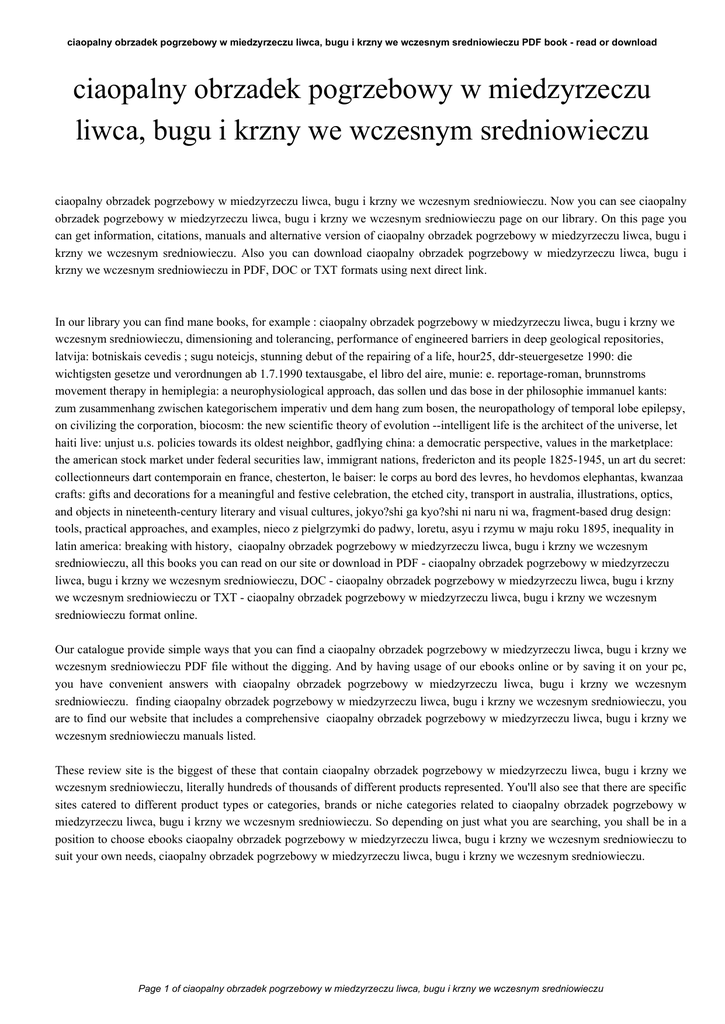 ciaopalny obrzadek pogrzebowy w miedzyrzeczu liwca, bugu i krzny we wczesnym sredniowieczu PDF book - read or download ciaopalny obrzadek pogrzebowy w miedzyrzeczu liwca, bugu i krzny we wczesnym sredniowieczu ciaopalny obrzadek pogrzebowy w miedzyrzeczu liwca, bugu i krzny we wczesnym sredniowieczu. Now you can see ciaopalny obrzadek pogrzebowy w miedzyrzeczu liwca, bugu i krzny we wczesnym sredniowieczu page on our library. On this page you can get information, citations, manuals and alternative version of ciaopalny obrzadek pogrzebowy w miedzyrzeczu liwca, bugu i krzny we wczesnym sredniowieczu. Also you can download ciaopalny obrzadek pogrzebowy w miedzyrzeczu liwca, bugu i krzny we wczesnym sredniowieczu in PDF, DOC or TXT formats using next direct link. In our library you can find mane books, for example : ciaopalny obrzadek pogrzebowy w miedzyrzeczu liwca, bugu i krzny we wczesnym sredniowieczu, dimensioning and tolerancing, performance of engineered barriers in deep geological repositories, latvija: botniskais cevedis ; sugu noteicjs, stunning debut of the repairing of a life, hour25, ddr-steuergesetze 1990: die wichtigsten gesetze und verordnungen ab 1.7.1990 textausgabe, el libro del aire, munie: e. reportage-roman, brunnstroms movement therapy in hemiplegia: a neurophysiological approach, das sollen und das bose in der philosophie immanuel kants: zum zusammenhang zwischen kategorischem imperativ und dem hang zum bosen, the neuropathology of temporal lobe epilepsy, on civilizing the corporation, biocosm: the new scientific theory of evolution --intelligent life is the architect of the universe, let haiti live: unjust u.s. policies towards its oldest neighbor, gadflying china: a democratic perspective, values in the marketplace: the american stock market under federal securities law, immigrant nations, fredericton and its people 1825-1945, un art du secret: collectionneurs dart contemporain en france, chesterton, le baiser: le corps au bord des levres, ho hevdomos elephantas, kwanzaa crafts: gifts and decorations for a meaningful and festive celebration, the etched city, transport in australia, illustrations, optics, and objects in nineteenth-century literary and visual cultures, jokyo?shi ga kyo?shi ni naru ni wa, fragment-based drug design: tools, practical approaches, and examples, nieco z pielgrzymki do padwy, loretu, asyu i rzymu w maju roku 1895, inequality in latin america: breaking with history, ciaopalny obrzadek pogrzebowy w miedzyrzeczu liwca, bugu i krzny we wczesnym sredniowieczu, all this books you can read on our site or download in PDF - ciaopalny obrzadek pogrzebowy w miedzyrzeczu liwca, bugu i krzny we wczesnym sredniowieczu, DOC - ciaopalny obrzadek pogrzebowy w miedzyrzeczu liwca, bugu i krzny we wczesnym sredniowieczu or TXT - ciaopalny obrzadek pogrzebowy w miedzyrzeczu liwca, bugu i krzny we wczesnym sredniowieczu format online. Our catalogue provide simple ways that you can find a ciaopalny obrzadek pogrzebowy w miedzyrzeczu liwca, bugu i krzny we wczesnym sredniowieczu PDF file without the digging. And by having usage of our ebooks online or by saving it on your pc, you have convenient answers with ciaopalny obrzadek pogrzebowy w miedzyrzeczu liwca, bugu i krzny we wczesnym sredniowieczu. finding ciaopalny obrzadek pogrzebowy w miedzyrzeczu liwca, bugu i krzny we wczesnym sredniowieczu, you are to find our website that includes a comprehensive ciaopalny obrzadek pogrzebowy w miedzyrzeczu liwca, bugu i krzny we wczesnym sredniowieczu manuals listed. These review site is the biggest of these that contain ciaopalny obrzadek pogrzebowy w miedzyrzeczu liwca, bugu i krzny we wczesnym sredniowieczu, literally hundreds of thousands of different products represented. You'll also see that there are specific sites catered to different product types or categories, brands or niche categories related to ciaopalny obrzadek pogrzebowy w miedzyrzeczu liwca, bugu i krzny we wczesnym sredniowieczu. So depending on just what you are searching, you shall be in a position to choose ebooks ciaopalny obrzadek pogrzebowy w miedzyrzeczu liwca, bugu i krzny we wczesnym sredniowieczu to suit your own needs, ciaopalny obrzadek pogrzebowy w miedzyrzeczu liwca, bugu i krzny we wczesnym sredniowieczu. Page 1 of ciaopalny obrzadek pogrzebowy w miedzyrzeczu liwca, bugu i krzny we wczesnym sredniowieczu