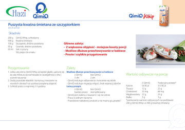 Puszysta kwaśna śmietana ze szczypiorkiem (ok 20 porcji) Składniki 200 g 500 g 100 g 50 g 50 ml QimiQ Whip, schłodzony Kwaśna śmietana Szczypirek, drobno posiekany Czosnek, drobno posiekany Sok z cytryny Sól, pieprz do smaku Główne zalety: - Z większona objętość - mniejsze koszty porcji - Możliwe dłuższe przechowywanie w lodówce - Proste i szybkie przygotowanie Przygotowanie Zalety 1.Lekko ubij zimny QimiQ Whip aż będzie gładki, upewnij się że cała mikstura się rozmieszała (w szczególności z dna i scianek naczynia) 2.Dodaj pozostałe składniki i kontynuuj mieszanie na wysokich obrotach aż uzyskasz pożądaną objętość 3.Schłódź przez co najmniej 2-3 godziny Możliwe dłuższe przechowywanie w lodówce z QimiQ bez QimiQ 5 dni 2 dni - QimiQ redukuje odbarwienia i tworzenie się skórki - QimiQ redukuje migrację wilgoci, brak separacji płynów Łatwy przepis z QimiQ bez QimiQ bardzo prosty skomplikowany - QimiQ jest stabilny z kwasami i się nie zetnie - Praca w jednym naczyniu - Prawdziwie nabiałowy produkt a nie można go „przebić“ Wartości odżywcze na porcję Z QimiQ Tradycyjny przepis* Kalorie 56 KCal 313 KCal Tłuszcz 12 g 23 g Cholesterol 33 mg 68 mg Węglowodany 22 g 23 g Białko 3 g 3g *porównanie wartości odżywczych na podstawie: 200 g QimiQ Whip vs 400 g kwaśnej śmietany