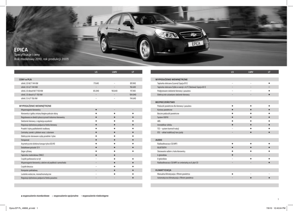 EPICA Specyfikacje i ceny Rok modelowy 2010, rok produkcji 2009 LS LMV LT silnik 2.0 M/T 144 KM 77.640 – 89.940 silnik 2.0 A/T 144 KM – – 96.640 LS LMV LT Tapicerka skórzana (czarna) (opcja 81 I) – – Tapicerka skórzana (tylko w wersji z A/T) (beżowa) (opcja 60 I) – – WYPOSAŻENIE WEWNĘTRZNE CENY w PLN silnik 2.0 diesel M/T 150 KM 85.040 90.640 97.340 Podgrzewane siedzenie kierowcy i pasażera – – o silnik 2.0 diesel A/T 150 KM – – 104.040 Elektrycznie ustawiane siedzenie kierowcy – – silnik 2.5 A/T 156 KM – – 114.640 BEZPIECZEŃSTWO Poduszki powietrzne dla kierowcy i pasażera – Kurtyny powietrzne – Boczne poduszki powietrzne Regulowana w dwóch płaszczyznach kolumna kierownicy System ISOFIX Siedzenie kierowcy z regulacją wysokości ABS Regulacja lędźwiowa podparcia fotela kierowcy Immobiliser silnika Przedni i tylny podłokietnik środkowy TCS – system kontroli trakcji – Centralny zamek z pilotem wraz z alarmem ESC – układ stabilizacji toru jazdy – Elektrycznie sterowane szyby przednie i tylne Tempomat Asymetrycznie dzielona kanapa tylna 60/40 Radioodtwarzacz CD/MP3 Dodatkowe gniazdo 12 V BLUETOOTH Zegar cyfrowy Sterowanie radiem z koła kierownicy Tapicerka materiałowa (W6C) 6 głośników Czujnik parkowania na tył – 8 głośników – – – Wspomaganie kierownicy zależne od prędkości samochodu – Radioodtwarzacz CD/MP3 ze zmieniarką na 6 płyt CD – – Czujnik deszczu – Komputer pokładowy – Lusterko wsteczne, monochromatyczne – Manualna klimatyzacja z filtrem powietrza Regulacja lędźwiowa podparcia fotela pasażera – – Automatyczna klimatyzacja z filtrem powietrza – – – WYPOSAŻENIE WEWNĘTRZNE Wspomaganie kierownicy Kierownica i gałka zmiany biegów pokryte skórą wyposażenie standardowe o wyposażenie opcjonalne AUDIO KLIMATYZACJA – wyposażenie niedostępne 1 Epica EP PL_40858_pl.indd 1 7/6/10 12:45:04 PM SILNIKI LS LMV LT Dojazdowe koło zapasowe Mechanizm rozrządu Felgi ze stopów lekkich 16", opony 205/60 R16 – – – Pojemność skokowa Felgi ze stopów lekkich 17", opony 215/50 R17 KOŁA I OPONY Liczba cylindrów WYPOSAŻENIE ZEWNĘTRZNE Lakier metalizowany 1.900 1.900 1.900 Elektrycznie sterowane lusterka zewnętrzne, podgrzewane Metaliczne elementy wykończenia – Szyberdach – elektrycznie sterowany (opcja CF5) – – 3.000 Przednie światła przeciwmgielne 2.0L 2.0 DIESEL 2.5L A/T 6 4 6 DOHC 24-zaworowy SOHC 16-zaworowy DOHC 24-zaworowy 1993 1991 2492 105(144)/6400 110(150)/4000 115(156)/5800 Maksymalny moment obrotowy (Nm)/(obr./min) 195/4600 320/2000 237/4000 Prędkość maksymalna (km/h) 207/199* 200/207* 209* Przyspieszenie 0–100 km/h (w sek.) 9,9/11,8* 9,7/10,1* 9,9* Cykl miejski 11,4/12,4* 7,5/10,4* 13,8* Cykl pozamiejski 6,3/6,8* 5,3/6,1* 6,6* Cykl mieszany 8,2/8,9* 6,1/7,6* 9,3* Emisja CO2 205/215* 169/212* 219* Długość (mm) 4805 4805 4805 Szerokość (mm) 1810 1810 1810 Wysokość (mm) 1450 1450 1450 Moc maksymalna (kW/KM)/(obr./min) Zużycie paliwa 1999/100/EC Masy i wymiary 2700 2700 2700 Rozstaw kół przód/tył (mm) Rozstaw osi (mm) 1550/1545 1550/1545 1550/1545 Masa własna (kg) – zależne od poziomu wyposażenia 1460/1500* 1560/1570* 1500* Dopuszczalna masa całkowita 1945/1985* 2055/2065* 1985* Pojemność zbiornika paliwa (w litrach) 65 65 63 Pojemność bagażnika/złożone oparcia, w litrach (zgodnie z normą ECIE/GM) 480 480 480 Przestrzeń na nogi przód/tył (mm) 1072/960 1072/960 1072/960 Przestrzeń na wysokości ramion przód/tył (mm) 1443/1430 1443/1430 1443/1430 Przestrzeń nad głową przód/tył (mm) 998/962 998/962 998/962 5,4 5,4 5,4 Minimalny promień skrętu (m) wyposażenie standardowe o wyposażenie opcjonalne – wyposażenie niedostępne (*) samochód wyposażony w automatyczną skrzynię biegów UWAGA! Dane i ilustracje niniejszej publikacji mogą obejmować również dodatkowe wyposażenie, niewystępujące w wersji standardowej (dostępne za dopłatą). Wszelkie informacje zawarte w niniejszej broszurze są aktualne na dzień jej publikacji. Producent zastrzega sobie prawo do wprowadzania zmian w zakresie kolorów, modeli, ich budowy i wyposażenia. Kolory w broszurze jedynie przypominają kolory rzeczywiste. Broszura nie stanowi oferty w rozumieniu prawnym i jest publikowana w celach informacyjnych, bez żadnej odpowiedzialności. Dostępność, szczegóły techniczne i wyposażenie mogą się różnić w zależności od rynku i ulegać zmianie bez uprzedzenia. Informacje na temat złomowania samochodów, przydatności do odzysku oraz recyklingu są dostępne na stronie www.chevrolet.pl. Aby uzyskać dokładne informacje o wyposażeniu samochodów, należy skontaktować się z lokalnym dystrybutorem Chevrolet. ©2009 Chevrolet Europe. Wszelkie prawa zastrzeżone. Niniejszy materiał nie może być przedrukowywany, w całości lub w części, bez wyraźnej pisemnej zgody Chevrolet Europe, Glattbrugg, Szwajcaria www.chevrolet.pl Chevrolet Poland Sp. z o.o. Rok produkcji 2009 Epica EP PL_40858_pl.indd 2 2 7/6/10 12:45:04 PM