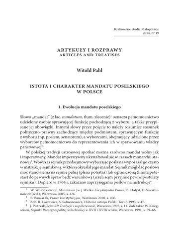 Krakowskie Studia Małopolskie 2014, nr 19 ARTYKUŁY I ROZPRAWY ARTICLES AND TREATISES Witold Pahl ISTOTA I CHARAKTER MANDATU POSELSKIEGO W POLSCE 1. Ewolucja mandatu poselskiego Słowo „mandat” (z łac. mandatum, tłum. zlecenie)1 oznacza pełnomocnictwo udzielone osobie sprawującej funkcję pochodzącą z wyboru, a także przypisane jej obowiązki. Innymi słowy przez pojęcie to należy rozumieć stosunek polityczno-prawny zachodzący między podmiotem, sprawującym funkcję z wyboru (np. posłem, senatorem), a wyborcami, obejmujący udzielone przez wyborców pełnomocnictwo do reprezentowania ich w sprawowaniu władzy państwowej2. W polskiej tradycji ustrojowej spotkać można zarówno mandat wolny jak i imperatywny. Mandat imperatywny ukształtował się w czasach monarchii stanowej3. Wówczas sejmik przedsejmowy wybierając posła na wyposażał go często w instrukcję sejmikową, w której określał jego mandat. Sejmik mógł dać posłowi moc stanowienia na sejmie pełną (plena potestas) lub ograniczoną (limita potestas) do pewnych spraw bądź warunkową (jeżeli sejm przyjmie pewne postulaty sejmiku). Dopiero w 1764 r. zakazano zaprzysięgania posłów na instrukcje4. 1 W. Wołodkiewicz, Mandatum [w:] Wielka Encyklopedia Prawa, B. Hołyst, E. Smoktunowicz (red.), Warszawa 2005, s. 426. 2 B. Banaszak, Prawo konstytucyjne, Warszawa 2010, s. 406. 3 Zob. R. Łaszewicz, S. Salmonowicz, Historia ustroju Polski, Toruń 1995, s. 47. 4 J. Pietrzak, Sejm RP. Tradycja i współczesność, Warszawa 1995, s. 11. Zob. także W. Kriegseisen, Sejmiki Rzeczypospolitej Szlacheckiej w XVII i XVIII wieku, Warszawa 1991, s. 59–66. Witold Pahl 12 W okresie monarchii stanowej wiążąca instrukcja wyborców stanowiła fundament niezależności ziem i województw, aczkolwiek owe tendencje do autonomiczności miały jeszcze wiele innych aspektów i wiele innych czynników. Godzi się zauważyć, ze kiedy tzw. sejm „niemy” w 1717 roku zlikwidował „rządy sejmikowe”, a więc dokonał istotnego kroku w kierunku likwidacji dużego znaczenia województw (ich quasi-autonomii), to jednak nie dotknął on mandatu poselskiego5. Przyjęcie koncepcji mandatu wolnego i zerwanie z koncepcją mandatu imperatywnego było zasadniczo wynikiem powstałej w okresie oświecenia idei suwerenności narodu ukształtowanej we Francji. Nie bez znaczenia pozostało także oddziaływanie pewnych wzorców liberalnych rozwiązań amerykańskich. Ostatecznie Konstytucja 3 maja, będąca ukoronowaniem dzieła reformy rzeczpospolitej szlacheckiej dokonanej przez Sejm Czteroletni zrywała całkowicie z koncepcją mandatu imperatywnego. Odtąd, jak zapisano, „posłowie na sejmikach obrani, w prawodawstwie i ogólnych narodu potrzebach (...) uważani być mają jako reprezentanci całego narodu, będąc składem ufności powszechnej”6. Późniejsze rozwiązania w zakresie charakteru mandatu kształtowały się różnie w zależności od okresu i panujących stosunków społeczno-politycznych7. Konstytucja marcowa z 1921 r. miała regulacje analogiczne jak Konstytucja 3 maja – zawierała zakaz przyjmowania koncepcji mandatu imperatywnego. Konstytucja kwietniowa z 1935 r. w ogóle nie zawierała uregulowań odnoszących się do charakteru mandatu, z kolei tzw. Mała Konstytucja z 1947 r. nie sformułowała zasady mandatu wolnego ani nie zawierała zakazu mandatu imperatywnego. Nieco odmienne zapatrywanie na koncepcję mandatu pojawiło się w czasach PRL. Konstytucja z 1952 r., opierając się zresztą na regulacjach zawartych w Konstytucji ZSRR z 1936 r., wprowadzała zasadę mandatu imperatywnego. Stanowiła ona, że „Przedstawiciele ludu w Sejmie PRL i radach narodowych 5 S. Płaza, Sejm jako instytucja demokracji szlacheckiej [w:] Parlamentaryzm i prawodawstwo przez wieki, S. Płaza, J. Malec (red.), W. Uruszczak, Kraków 1991, s. 81. 6 Zob. J. Bardach, B. Leśnodorski, M. Pietrzak, Historia ustroju i prawa polskiego, Warszawa 1994, s. 311; zob. także W. Kriegseisen: Sejmiki Rzeczypospolitej Szlacheckiej w XVII i XVIII wieku, Warszawa 1991, s. 59–66. 7 A. Korobowicz, Polski Konstytucjonalizm (do 1919 r.), [w:] Zarys dziejów konstytucjonalizmu polskiego, Lublin 1996, s. 9 i n. Istota i charakter mandatu poselskiego w Polsce 13 są odpowiedzialni przed swymi wyborcami i mogą być przez nich odwoływani”8. Konstytucja wprowadzała także zastrzeżenie, że poseł powinien zdawać sprawę wyborcom ze swej pracy i z działalności organu, do którego został wybrany9. Warto przy tym zauważyć, że odrzucenie mandatu imperatywnego i wprowadzenie instytucji mandatu wolnego stało się w konstytucjach państw postkomunistycznych powszechnie stosowaną praktyką10. Wzorzec radziecki był powielany z niemal wszystkich podporządkowanych ZSRR państwach europejskich. Uchwalona w 1985 r. ustawa o obowiązkach i prawach posłów i senatorów11 zawierała rozwiązania zbliżone do koncepcji mandatu wolnego. Artykuł 1 określał, że posłowie są przedstawicielami wyborców i wykonują swój mandat zgodnie z ich wolą, kierując się dobrem narodu. Fakt, iż obowiązujące w tamtym okresie przepisy nie zezwalały wyborcom na odwołanie posła przed upływem kadencji, prowadzi do wniosku, że nie był to klasyczny mandat wolny zaś koncepcja bardzo do niego zbliżona. Oczywiście jak na warunki państwa realnego socjalizmu. Koncepcja mandatu wolnego została wprowadzona wprost do tzw. Małej Konstytucji z 1992 r., która przy okazji wprowadziła przy tym zakaz mandatu imperatywnego12. Poseł był wówczas reprezentantem całego narodu, nie był związany instrukcjami wyborców i nie mógł być przez kogokolwiek odwołany13. Konstytucja z 2 kwietnia 1997 r. w art. 4 ust. 2 zastrzega, że „Naród sprawuje władze poprzez swoich przedstawicieli lub bezpośrednio”. W ten sposób 8 Zob. art. 2 ust. 2 Konstytucji PRL z 1952 r. Art. 101 Konstytucji PRL z 1952 r. Brzmienie tego przepisu zostało zmienione dopiero p
