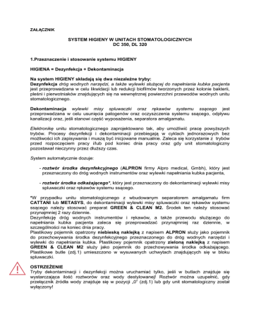 ZAŁĄCZNIK SYSTEM HIGIENY W UNITACH STOMATOLOGICZNYCH DC 350, DL 320 1.Przeznaczenie i stosowanie systemu HIGIENY HIGIENA = Dezynfekcja + Dekontaminacja Na system HIGIENY składają się dwa niezależne tryby: Dezynfekcja dróg wodnych narzędzi, a także wylewki służącej do napełniania kubka pacjenta jest przeprowadzana w celu likwidacji lub redukcji biofilmów tworzonych przez kolonie bakterii, pleśni i pierwotniaków znajdujących się na wewnętrznej powierzchni przewodów wodnych unitu stomatologicznego. Dekontaminacja wylewki misy spluwaczki oraz rękawów systemu ssącego jest przeprowadzana w celu usunięcia patogenów oraz oczyszczenia systemu ssącego, odpływu kanalizacji oraz, jeśli stanowi część wyposażenia, separatora amalgamatu. Elektronikę unitu stomatologicznego zaprojektowano tak, aby umożliwić pracę powyższych trybów. Procesy dezynfekcji i dekontaminacji przebiegają w cyklach jednorazowych bez możliwości ich zapisywania i muszą być inicjowane manualnie. Zaleca się korzystanie z trybów przed rozpoczęciem pracy i/lub pod koniec dnia pracy oraz gdy unit stomatologiczny pozostawał nieczynny przez dłuższy czas. System automatycznie dozuje: - roztwór środka dezynfekcyjnego (ALPRON firmy Alpro medical, Gmbh), który jest przeznaczony do dróg wodnych instrumentów oraz wylewki napełniania kubka pacjenta, - roztwór środka odkażającego*, który jest przeznaczony do dekontaminacji wylewki misy spluwaczki oraz rękawów systemu ssącego. *W przypadku unitu stomatologicznego z wbudowanym separatorem amalgamatu firm CATTANI lub METASYS, do dekontaminacji wylewki misy spluwaczki oraz rękawów systemu ssącego należy stosować preparat GREEN & CLEAN M2. Środek ten należy stosować przynajmniej 2 razy dziennie. Dezynfekcję dróg wodnych instrumentów i rękawów, a także przewodu służącego do napełniania kubka pacjenta zaleca się przeprowadzać przynajmniej raz dziennie, w szczególności na koniec dnia pracy. Plastikowy pojemnik opatrzony niebieską naklejką z napisem ALPRON służy jako pojemnik do przechowywania środka dezynfekcyjnego przeznaczonego do dróg wodnych narzędzi i wylewki do napełniania kubka. Plastikowy pojemnik opatrzony zieloną naklejką z napisem GREEN & CLEAN M2 służy jako pojemnik do przechowywania środka odkażającego. Plastikowe butle (zdj.1) umieszczono w wysuwanych uchwytach znajdujących się w bloku spluwaczki. OSTRZEŻENIE Tryby dekontaminacji i dezynfekcji można uruchamiać tylko, jeśli w butlach znajduje się wystarczająca ilość roztworów oraz wody destylowanej! Roztwór można uzupełnić, gdy przełącznik źródła wody znajduje się w pozycji „0“ (zdj.1) lub gdy unit stomatologiczny został wyłączony! INSTRUKCJA OBSŁUGI DC 350 Zdj. 1. Butle z roztworami ALPRON oraz GREEN & CLEAN M2 Rys. 2. Przełącznik źródła wody w pozycji „0“ (w bloku spluwaczki) pl_higiena dc350-dl320_2013_06 2/12 INSTRUKCJA OBSŁUGI DC 350 2.Sterowanie systemem HIGIENY z klawiatury panelu asysty H A B O P Zdj. 3. Klawiatura panelu asysty Legenda: H – uruchamianie systemu higieny, A – dezynfekcja dróg wodnych instrumentów, B – dekontaminacja rękawów systemu ssącego, O – dekontaminacja wylewki misy spluwaczki, P – dezynfekcja wylewki kubka pacjenta. pl_higiena dc350-dl320_2013_06 3/12 INSTRUKCJA OBSŁUGI DC 350 3.Sterowanie systemem HIGIENY z klawiatury dotykowej panelu asysty DC 350 12:56 Hygiene H2 H1 B A O P H2 H1 B A O P Rys. 4 Klawiatura dotykowej panelu asysty Legenda: H1 – rozpoczęcie dezynfekcji + sygnalizacja niedostatecznej ilości roztworu środka dezynfekującego, H2 – rozpoczęcie dekontaminacji + sygnalizacja niedostatecznej ilości roztworu środka odkażającego, A – dezynfekcja dróg wodnych narzędzi, B – dekontaminacja rękawów systemu ssącego, O – dekontaminacja wylewki misy spluwaczki, P – dezynfekcja wylewki kubka pacjenta. 4.Panel sygnalizacyjny na bloku spluwaczki 1 2 3 5 7 4 6 8 Rys. 5. Panel sygnalizacyjny na bloku spluwaczki pl_higiena dc350-dl320_2013_06 4/12 INSTRUKCJA OBSŁUGI DC 350 Legenda: 1 – dioda żółta, woda z systemu centralnego, 2 – dioda żółta, woda destylowana z butli, 3 – dioda zielona, wystarczająca ilość wody destylowanej, 4 – dioda czerwona, brak wody destylowanej, 5 – dioda zielona, wystarczająca ilość roztworu środka dezynfekującego, 6 – dioda czerwona, brak roztworu środka dezynfekującego, 7 – dioda zielona, wystarczająca ilość roztworu środka odkażającego, 8 – dioda czerwona, wystarczająca ilość roztworu środka odkażającego. Brak wody destylowanej oraz roztworów jest sygnalizowany miganiem diody czerwonej i sygnałem dźwiękowym. Ponadto wystarczająca ilość/brak wody destylowanej oraz roztworów jest sygnalizowana na panelu dotykowym asysty (patrz pkt.8.3.2). 5.Uruchamianie i wskazania systemu higieny Uruchomienie systemu HYGENE następuje poprzez wybranie odpowiedniego przycisku na klawiaturze membranowej (zdj. 3) lub dotykowej (rys. 4) panelu asysty. 5.1. Przyciski na klawiaturze 5.1.1. Dekontaminacja wylewki opłukiwania misy spluwaczki Uruchamianie: zaprogramować czas opłukiwania misy spluwaczki na min. 10 s. Przycisnąć przycisk H: a następnie przycisk O: Płukanie wylewki misy spluwaczki roztworem środka do dekontaminacji trwa 10 s. Po tym czasie cykl ustanie samoczynnie. Proces przebiega w jednorazowym cyklu, którego nie można zapisać. Anulowanie: proces można przerwać przyciskając kilkukrotnie przycisk O, przyciskając dwukrotne przycisk H lub wyłączając unit. Sygnalizacja dekontaminacji: na przycisku O zapala się niebieska dioda. 5.1.2. Dekontaminacja rękawów systemu ssącego Uruchamianie: Przycisnąć przycisk H: a następnie przycisk B: Przepłukiwanie rękawów systemu ssącego roztworem środka do dekontaminacji trwa 60 s. W czasie trwania cyklu rękawy muszą pozostawać w swoich uchwytach. Proces przebiega w jednorazowym cyklu, którego nie można zap