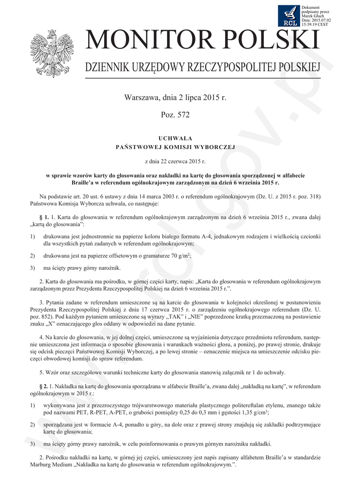 Dokument podpisany przez Marek Głuch Data: 2015.07.02 15:39:19 CEST MONITOR POLSKI v.p l DZIENNIK URZĘDOWY RZECZYPOSPOLITEJ POLSKIEJ Warszawa, dnia 2 lipca 2015 r. Poz. 572 UCHWAŁA PAŃSTWOWEJ KOMISJI WYBORCZEJ .go z dnia 22 czerwca 2015 r. w sprawie wzorów karty do głosowania oraz nakładki na kartę do głosowania sporządzonej w alfabecie Braille’a w referendum ogólnokrajowym zarządzonym na dzień 6 września 2015 r. Na podstawie art. 20 ust. 6 ustawy z dnia 14 marca 2003 r. o referendum ogólnokrajowym (Dz. U. z 2015 r. poz. 318) Państwowa Komisja Wyborcza uchwala, co następuje: § 1. 1. Karta do głosowania w referendum ogólnokrajowym zarządzonym na dzień 6 września 2015 r., zwana dalej „kartą do głosowania”: 2) 3) drukowana jest jednostronnie na papierze koloru białego formatu A-4, jednakowym rodzajem i wielkością czcionki dla wszystkich pytań zadanych w referendum ogólnokrajowym; w. rcl 1) drukowana jest na papierze offsetowym o gramaturze 70 g/m2; ma ścięty prawy górny narożnik. 2. Karta do głosowania ma pośrodku, w górnej części karty, napis: „Karta do głosowania w referendum ogólnokrajowym zarządzonym przez Prezydenta Rzeczypospolitej Polskiej na dzień 6 września 2015 r.”. 3. Pytania zadane w referendum umieszczone są na karcie do głosowania w kolejności określonej w postanowieniu Prezydenta Rzeczypospolitej Polskiej z dnia 17 czerwca 2015 r. o zarządzeniu ogólnokrajowego referendum (Dz. U. poz. 852). Pod każdym pytaniem umieszczone są wyrazy „TAK” i „NIE” poprzedzone kratką przeznaczoną na postawienie znaku „X” oznaczającego głos oddany w odpowiedzi na dane pytanie. 4. Na karcie do głosowania, w jej dolnej części, umieszczone są wyjaśnienia dotyczące przedmiotu referendum, następnie umieszczona jest informacja o sposobie głosowania i warunkach ważności głosu, a poniżej, po prawej stronie, drukuje się odcisk pieczęci Państwowej Komisji Wyborczej, a po lewej stronie – oznaczenie miejsca na umieszczenie odcisku pieczęci obwodowej komisji do spraw referendum. ww 5. Wzór oraz szczegółowe warunki techniczne karty do głosowania stanowią załącznik nr 1 do uchwały. § 2. 1. Nakładka na kartę do głosowania sporządzana w alfabecie Braille’a, zwana dalej „nakładką na kartę”, w referendum ogólnokrajowym w 2015 r.: 1) wykonywana jest z przezroczystego trójwarstwowego materiału plastycznego politereftalan etylenu, znanego także pod nazwami PET, R-PET, A-PET, o grubości pomiędzy 0,25 do 0,3 mm i gęstości 1,35 g/cm3; 2) sporządzana jest w formacie A-4, ponadto u góry, na dole oraz z prawej strony znajdują się zakładki podtrzymujące kartę do głosowania; 3) ma ścięty górny prawy narożnik, w celu poinformowania o prawym górnym narożniku nakładki. 2. Pośrodku nakładki na kartę, w górnej jej części, umieszczony jest napis zapisany alfabetem Braille’a w standardzie Marburg Medium „Nakładka na kartę do głosowania w referendum ogólnokrajowym.”. Monitor Polski –2– Poz. 572 4. Na nakładce na kartę wyciętych jest 6 kratek. v.p l 3. W miejscach odpowiadających umieszczonej na karcie do głosowania kratce przeznaczonej na oddanie głosu umieszczona jest wycięta kratka, a następnie odpowiednio liczba porządkowa pytania i odpowiedź „TAK” oraz liczba porządkowa pytania i odpowiedź „NIE”, zapisane alfabetem Braille’a. 5. Wzór oraz szczegółowe warunki techniczne dla nakładki na kartę w referendum ogólnokrajowym określa załącznik nr 2 do uchwały. § 3. Uchwała wchodzi w życie z dniem podjęcia i podlega ogłoszeniu. ww w. rcl .go Zastępca Przewodniczącego Państwowej Komisji Wyborczej: W. Kozielewicz Monitor Polski –3– Poz. 572 Załączniki do uchwały Państwowej Komisji Wyborczej z dnia 22 czerwca 2015 r. (poz. 572) Załącznik nr 1 v.p l Za³¹czniki do uchwa³y Pañstwowej Komisji Wyborczej z dnia 22 czerwca 2015 r. (poz. ...) Za³¹cznik Nr 1 F KARTA DO GÙOSOWANIA A F w referendum ogólnokrajowym zarzàdzonym przez Prezydenta Rzeczypospolitej Polskiej na dzieñ 6 wrzeúnia 2015 r. Pytanie pierwsze: .go Czy jest Pani/Pan za wprowadzeniem jednomandatowych okrægów wyborczych w wyborach do Sejmu Rzeczypospolitej Polskiej? TAK B Pytanie drugie: D Czy jest Pani/Pan za utrzymaniem dotychczasowego sposobu finansowania partii politycznych z budýetu pañstwa? TAK Pytanie trzecie: C NIE E Czy jest Pani/Pan za wprowadzeniem zasady ogólnej rozstrzygania wàtpliwoúci co do wykùadni przepisów prawa podatkowego na korzyúã podatnika? w. rcl B NIE TAK NIE WYJAŒNIENIA Udzielenie odpowiedzi pozytywnej „TAK” oznacza zgodæ, zaú udzielenie odpowiedzi negatywnej „NIE” oznacza brak zgody: 1) na wprowadzenie jednomandatowych okrêgów wyborczych w wyborach do Sejmu Rzeczypospolitej Polskiej (odpowiedŸ na pytanie pierwsze);........................................................................................... 2) na utrzymanie dotychczasowego sposobu finansowania partii politycznych z bud¿etu pañstwa ... (odpowiedŸ na pytanie drugie); ............................................................................................................ 3) na bezpoœrednie wpisanie do ustawy - Ordynacja podatkowa zasady, zgodnie z któr¹ w przypadku istnienia w¹tpliwoœci prawnych organ zobowi¹zany jest w¹tpliwoœci te rozstrzygaæ na korzyœæ podatnika (odpowiedŸ na pytanie trzecie)........................................................................................... INFORMACJA ww Gùosujàcy udziela odpowiedzi na kaýde postawione pytanie, stawiajàc znak „X” (dwie linie przecinajàce siæ w obræbie kratki) w kratce obok odpowiedzi pozytywnej „TAK” albo w kratce obok odpowiedzi negatywnej „NIE”. Postawienie znaku „X” w obu kratkach w odpowiedzi na dane pytanie lub niepostawienie tego znaku w ýadnej z kratek w odpowiedzi na dane pytanie spowoduje niewaýnoúã gùosu w zakresie tego pytania. G odcisk pie