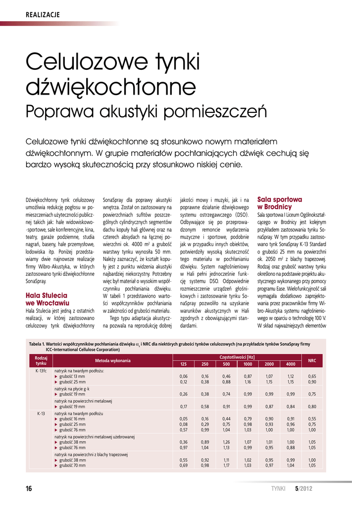realizacje Celulozowe tynki dźwiękochłonne Poprawa akustyki pomieszczeń Celulozowe tynki dźwiękochłonne są stosunkowo nowym materiałem dźwiękochłonnym. W grupie materiałów pochłaniających dźwięk cechują się bardzo wysoką skutecznością przy stosunkowo niskiej cenie. Dźwiękochłonny tynk celulozowy umożliwia redukcję pogłosu w pomieszczeniach użyteczności publicznej takich jak: hale widowiskowo-sportowe, sale konferencyjne, kina, teatry, garaże podziemne, studia nagrań, baseny, hale przemysłowe, lodowiska itp. Poniżej przedstawiamy dwie najnowsze realizacje firmy Wibro-Akustyka, w których zastosowano tynki dźwiękochłonne SonaSpray. Hala Stulecia we Wrocławiu Hala Stulecia jest jedną z ostatnich realizacji, w której zastosowano celulozowy tynk dźwiękochłonny SonaSpray dla poprawy akustyki wnętrza. Został on zastosowany na powierzchniach sufitów poszczególnych cylindrycznych segmentów dachu kopuły hali głównej oraz na czterech absydach na łącznej powierzchni ok. 4000 m2 a grubość warstwy tynku wynosiła 50 mm. Należy zaznaczyć, że kształt kopuły jest z punktu widzenia akustyki najbardziej niekorzystny. Potrzebny więc był materiał o wysokim współczynniku pochłaniania dźwięku. W tabeli 1 przedstawiono wartości współczynników pochłaniania w zależności od grubości materiału. Tego typu adaptacja akustyczna pozwala na reprodukcję dobrej jakości mowy i muzyki, jak i na poprawne działanie dźwiękowego systemu ostrzegawczego (DSO). Odbywające się po przeprowadzonym remoncie wydarzenia muzyczne i sportowe, podobnie jak w przypadku innych obiektów, potwierdziły wysoką skuteczność tego materiału w pochłanianiu dźwięku. System nagłośnieniowy w Hali pełni jednocześnie funkcję systemu DSO. Odpowiednie rozmieszczenie urządzeń głośnikowych i zastosowanie tynku SonaSpray pozwoliło na uzyskanie warunków akustycznych w Hali zgodnych z obowiązującymi standardami. Sala sportowa w Brodnicy Sala sportowa I Liceum Ogólnokształcącego w Brodnicy jest kolejnym przykładem zastosowania tynku SonaSpray. W tym przypadku zastosowano tynk SonaSpray K-13 Standard o grubości 25 mm na powierzchni ok. 2050 m2 z blachy trapezowej. Rodzaj oraz grubość warstwy tynku określono na podstawie projektu akustycznego wykonanego przy pomocy programu Ease. Wielofunkcyjność sali wymagała dodatkowo zaprojektowania przez pracowników firmy Wibro-Akustyka systemu nagłośnieniowego w oparciu o technologię 100 V. W skład najważniejszych elementów Tabela 1. W artości współczynników pochłaniania dźwięku αs i NRC dla niektórych grubości tynków celulozowych (na przykładzie tynków SonaSpray firmy ICC-International Cellulose Corporation) Rodzaj tynku K-13fc K-13 16 Metoda wykonania Częstotliwości [Hz] NRC 125 250 500 1000 2000 4000 natrysk na twardym podłożu: grubość 13 mm grubość 25 mm 0,06 0,12 0,16 0,38 0,46 0,88 0,87 1,16 1,07 1,15 1,12 1,15 0,65 0,90 natrysk na płycie g-k grubość 19 mm 0,26 0,38 0,74 0,99 0,99 0,99 0,75 natrysk na powierzchni metalowej grubość 19 mm 0,17 0,58 0,91 0,99 0,87 0,84 0,80 natrysk na twardym podłożu grubość 16 mm grubość 25 mm grubość 76 mm 0,05 0,08 0,57 0,16 0,29 0,99 0,44 0,75 1,04 0,79 0,98 1,03 0,90 0,93 1,00 0,91 0,96 1,00 0,55 0,75 1,00 natrysk na powierzchni metalowej użebrowanej grubość 38 mm grubość 76 mm 0,36 0,97 0,89 1,04 1,26 1,13 1,07 0,99 1,01 0,95 1,00 0,88 1,05 1,05 natrysk na powierzchni z blachy trapezowej grubość 38 mm grubość 70 mm 0,55 0,69 0,92 0,98 1,11 1,17 1,02 1,03 0,95 0,97 0,99 1,04 1,00 1,05 TYNKI 5/2012 systemu nagłośnienia wchodzi 8 głośników Bosch LS1-UC20E-1 podwieszonych nad trybunami i 3 głośniki Bosch LS1-OC100E podwieszone nad powierzchnią parkietu. Projekt systemu nagłośnienia wykonano również w programie Ease w odniesieniu do wcześniejszej adaptacji akustycznej. Zastosowanie urządzeń głośnikowych grających pionowo w dół pozwoliło na zmniejszenie liczby odbić dźwięku od powierzchni bocznych ścian a materiał dźwiękochłonny umieszczony na suficie wpłynął na pochłanianie odbić dźwięku pochodzących od powierzchni parkietu. Efekty przeprowadzonej adaptacji akustycznej są widoczne na symulacjach, jakie wykonano przy pomocy programu Ease. Rysunki 2 oraz 3 przedstawiają czas pogłosu pomieszczenia (RT60) oraz współczynnik zrozumiałości mowy (RaSTI)obliczone na podstawie symulacji dla obiektu przed i po adaptacji akustycznej z uwzględnieniem zainstalowanego systemu nagłośnienia. Na podstawie obliczeń i danych z literatury, jako optymalny przyjęto czas pogłosu RT60 = 1,37 s, dla zakresu częstotliwości od 250 do 8000 Hz, przy zadanej objętości pomieszczenia (V = 11733 m3). Dźwiękochłonny tynk celulozowy SonaSpray umożliwia redukcję czasu pogłosu a tym samym zwiększenie zrozumiałości mowy, szczególnie w zakresie średnich i wysokich częstotliwości charakterystycznych dla mowy ludzkiej (500–4000 Hz). Zaimpregnowanie w procesie produkcji włókien celulozy mineralnymi substancjami ogniochronnymi pozwala na uzyskanie tynku o właściwościach klasy B jako materiał niezapalny, niekapiący i nierozprzestrzeniający ognia. Technologia wykonania tynku SonaSpray polega na wymieszaniu włókien celulozowych z klejem w procesie nakładania tynku. Produkt końcowy stanowi trwała warstwa o grubości określonej zgodnie z projektem akustycznym. Gęstość materiału celulozowego z klejem wynosi po wyschnięciu 60–70 kg/m3. Grubość warstwy tynku (od kilkunastu do kilkudziesięciu mili- TYNKI 5/2012 Fot. Wibro-Akustyka realizacje Rys. 1: Tynk dźwiękochłonny SonaSpray w Hali Stulecia we Wrocławiu Czas pogłosu przed adaptacją. Czas pogłosu po adaptacji Rys.2: Porównanie czasu pogłosu w hali przed i po zastosowaniu tynku SonaSpray. a) b) Rys.3: Porównanie współczynnika zrozumiałości mowy RaSTI a) przed adaptacją akustyczną hali b) po adaptacji akustycznej hali.