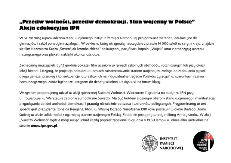 „Przeciw wolności, przeciw demokracji. Stan wojenny w Polsce” Akcja edukacyjna IPN W 31. rocznicę wprowadzenia stanu wojennego Instytut Pamięci Narodowej przygotował materiały edukacyjne dla gimnazjów i szkół ponadgimnazjalnych. W pakiecie, który otrzymają nauczyciele z prawie 14 000 szkół w całym kraju, znajdzie się film Kazimierza Kutza „Śmierć jak kromka chleba” poświęcony pacyfikacji kopalni „Wujek” wraz z propozycją wstępu historycznego oraz plakat i naklejki okolicznościowe. Zachęcamy nauczycieli, by 13 grudnia pokazali film uczniom w ramach szkolnych obchodów rocznicowych lub przy okazji lekcji historii. Liczymy, że projekcja pobudzi w uczniach zainteresowanie stanem wojennym, zachęci do zadawania pytań o jego genezę, przebieg i konsekwencje, uwrażliwi ich na indywidualne tragedie Polaków żyjących w warunkach reżimu komunistycznego. Może być także wstępem do debaty szkolnej lub dyskusji na forum klasy. Wszystkim proponujemy udział w akcji społecznej Światło Wolności. Wieczorem 11 grudnia na budynku IPN przy ul. Towarowej w Warszawie zapłonie symboliczne Światło. Ma być hołdem złożonym ofiarom stanu wojennego i manifestacją przywiązania do idei wolności, demokracji i prawdy niezależnie od czasu i warunków politycznych. Przypominamy w ten sposób gest prezydenta Ronalda Reagana, który w Wigilię Bożego Narodzenia 1981 roku postawił w oknie Białego Domu świecę w akcie solidarności z ogarniętą stanem wojennym Polską. Podobnie postąpiły wtedy miliony Amerykanów. W akcji „Światło Wolności” będzie mógł wziąć udział każdy poprzez zapalenie 13 grudnia o 19.30 lampki w oknie albo wirtualnie na stronie www.ipn.gov.pl.