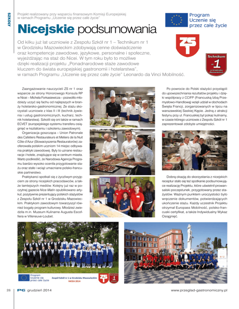 Szkoły Projekt realizowany przy wsparciu finansowym Komisji Europejskiej w ramach Programu „Uczenie się przez całe życie” Nicejskie podsumowania Od kilku już lat uczniowie z Zespołu Szkół nr 1 – Technikum nr 1 w Grodzisku Mazowieckim zdobywają cenne doświadczenie oraz kompetencje zawodowe, językowe, personalne i społeczne, wyjeżdżając na staż do Nicei. W tym roku było to możliwe dzięki realizacji projektu „Ponadnarodowe staże zawodowe kluczem do świata europejskiej gastronomii i hotelarstwa”, w ramach Programu „Uczenie się przez całe życie” Leonardo da Vinci Mobilność. Zaangażowanie nauczycieli ZS nr 1 oraz Po powrocie do Polski stażyści przystąpili wsparcie ze strony Honorowego Konsula RP w Nicei – Michela Forkasiewicza – pozwoliło mło- do upowszechniania rezultatów projektu i dzięki współpracy z CCIFP (Francuską Izbą Prze- dzieży uczyć się fachu od najlepszych w bran- mysłowo-Handlową) wzięli udział w obchodach ży hotelarsko-gastronomicznej. Ze stażu sko- Święta Francji, zorganizowanych w lipcu na rzystali uczniowie z klas II i III (technik żywie- warszawskiej Saskiej Kępie. Jedną z atrakcji nia i usług gastronomicznych, kucharz, tech- festynu przy ul. Francuskiej był pokaz kulinarny, w czasie którego uczniowie z Zespołu Szkół nr 1 nik hotelarstwa). Szkolili się oni także w ramach ECVET (europejskiego systemu transferu osią- zaprezentowali zdobyte umiejętności. gnięć w kształceniu i szkoleniu zawodowym). Organizacja goszcząca – Union Patronale des Cafetiers Restaurateurs et Metiers de la Nuit Côte d’Azur (Stowarzyszenia Restauratorów) zaoferowała polskim uczniom 14 miejsc odbywania praktyki zawodowej. Były to uznane restauracje i hotele, znajdujące się w centrum miasta. Warto podkreślić, że Narodowa Agencja Programu bardzo wysoko oceniła przygotowanie stażu oraz stałe i wciąż umacniane polsko-francuskie partnerstwo. Praktykanci spotkali się z życzliwym przyjęciem ze strony nicejskich pracodawców, a tak- Dobrą okazją do skorzystania z nicejskich receptur stało się też spotkanie podsumowują- że tamtejszych mediów. Kolejny już raz w po- ce realizację Projektu, które uświetnił prowan- czytnej gazecie Nice Matin opublikowano arty- salski poczęstunek, przygotowany przez sta- kuł, pozytywnie prezentujący polskich stażystów z Zespołu Szkół nr 1 w Grodzisku Mazowiec- żystów. Ważnym punktem uroczystości było wręczenie dokumentów, potwierdzających ukończenie stażu. Każdy uczestnik Projektu otrzymał Europass Mobilność, polsko-fran- kim. Praktykom zawodowym towarzyszył również bogaty program kulturowy. Młodzież zwie- 26 dziła m.in. Muzeum Kulinarne Augusta Escof- cuski certyfikat, a także Indywidualny Wykaz fiera w Villeneuve-Loubet. Osiągnięć. grudzień 2014 www.przeglad-gastronomiczny.pl