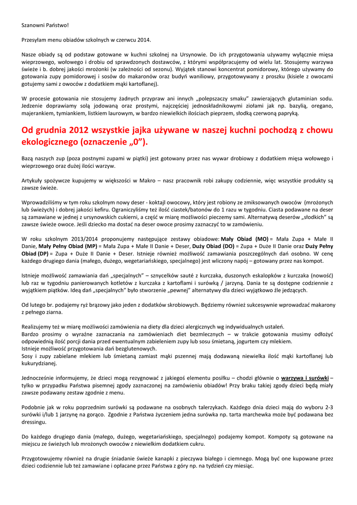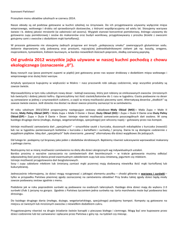 Szanowni Państwo! Przesyłam menu obiadów szkolnych w czerwcu 2014. Nasze obiady są od podstaw gotowane w kuchni szkolnej na Ursynowie. Do ich przygotowania używamy wyłącznie mięsa wieprzowego, wołowego i drobiu od sprawdzonych dostawców, z którymi współpracujemy od wielu lat. Stosujemy warzywa świeże i b. dobrej jakości mrożonki (w zależności od sezonu). Wyjątek stanowi koncentrat pomidorowy, którego używamy do gotowania zupy pomidorowej i sosów do makaronów oraz budyń waniliowy, przygotowywany z proszku (kisiele z owocami gotujemy sami z owoców z dodatkiem mąki kartoflanej). W procesie gotowania nie stosujemy żadnych przypraw ani innych „polepszaczy smaku” zawierających glutaminian sodu. Jedzenie doprawiamy solą jodowaną oraz prostymi, najczęściej jednoskładnikowymi ziołami jak np. bazylią, oregano, majerankiem, tymiankiem, listkiem laurowym, w bardzo niewielkich ilościach pieprzem, słodką czerwoną papryką. Od grudnia 2012 wszystkie jajka używane w naszej kuchni pochodzą z chowu ekologicznego (oznaczenie „0”). Bazą naszych zup (poza postnymi zupami w piątki) jest gotowany przez nas wywar drobiowy z dodatkiem mięsa wołowego i wieprzowego oraz dużej ilości warzyw. Artykuły spożywcze kupujemy w większości w Makro – nasz pracownik robi zakupy codziennie, więc wszystkie produkty są zawsze świeże. Wprowadziliśmy w tym roku szkolnym nowy deser - koktajl owocowy, który jest robiony ze zmiksowanych owoców (mrożonych lub świeżych) i dobrej jakości kefiru. Ograniczyliśmy też ilość ciastek/batonów do 1 razu w tygodniu. Ciasta podawane na deser są zamawiane w jednej z ursynowskich cukierni, a część w miarę możliwości pieczemy sami. Alternatywą deserów „słodkich” są zawsze świeże owoce. Jeśli dziecko ma dostać na deser owoce prosimy zaznaczyć to w zamówieniu. W roku szkolnym 2013/2014 proponujemy następujące zestawy obiadowe: Mały Obiad (MO) = Mała Zupa + Małe II Danie, Mały Pełny Obiad (MP) = Mała Zupa + Małe II Danie + Deser, Duży Obiad (DO) = Zupa + Duże II Danie oraz Duży Pełny Obiad (DP) = Zupa + Duże II Danie + Deser. Istnieje również możliwość zamawiania poszczególnych dań osobno. W cenę każdego drugiego dania (małego, dużego, wegetariańskiego, specjalnego) jest wliczony napój – gotowany przez nas kompot. Istnieje możliwość zamawiania dań „specjalnych” – sznycelków sauté z kurczaka, duszonych eskalopków z kurczaka (nowość) lub raz w tygodniu panierowanych kotletów z kurczaka z kartoflami i surówką / jarzyną. Dania te są dostępne codziennie z wyjątkiem piątków. Ideą dań „specjalnych” było stworzenie „pewnej” alternatywy dla dzieci wyjątkowo źle jedzących. Od lutego br. podajemy ryż brązowy jako jeden z dodatków skrobiowych. Będziemy również sukcesywnie wprowadzać makarony z pełnego ziarna. Realizujemy też w miarę możliwości zamówienia na diety dla dzieci alergicznych wg indywidualnych ustaleń. Bardzo prosimy o wyraźne zaznaczania na zamówieniach diet bezmlecznych – w trakcie gotowania musimy odłożyć odpowiednią ilość porcji dania przed ewentualnym zabieleniem zupy lub sosu śmietaną, jogurtem czy mlekiem. Istnieje możliwość przygotowania dań bezglutenowych. Sosy i zupy zabielane mlekiem lub śmietaną zamiast mąki pszennej mają dodawaną niewielka ilość mąki kartoflanej lub kukurydzianej. Jednocześnie informujemy, że dzieci mogą rezygnować z jakiegoś elementu posiłku – chodzi głównie o warzywa i surówki – tylko w przypadku Państwa pisemnej zgody zaznaczonej na zamówieniu obiadów! Przy braku takiej zgody dzieci będą miały zawsze podawany zestaw zgodnie z menu. Podobnie jak w roku poprzednim surówki są podawane na osobnych talerzykach. Każdego dnia dzieci mają do wyboru 2-3 surówki i/lub 1 jarzynę na gorąco. Zgodnie z Państwa życzeniem jedna surówka np. tarta marchewka może być podawana bez dressingu. Do każdego drugiego dania (małego, dużego, wegetariańskiego, specjalnego) podajemy kompot. Kompoty są gotowane na miejscu ze świeżych lub mrożonych owoców z niewielkim dodatkiem cukru. Przygotowujemy również na drugie śniadanie świeże kanapki z pieczywa białego i ciemnego. Mogą być one kupowane przez dzieci codziennie lub też zamawiane i opłacane przez Państwa z góry np. na tydzień czy miesiąc. Tak jak w latach poprzednich obiady można kupować na cały miesiąc, na tydzień lub na inny dowolny okres. Sprzedaż karnetów obiadowych na czerwiec 2014r rozpoczynamy w piątek 30.05.2014. Obiady indywidualne można kupować codziennie do godz. 9.00 w Jadalni szkolnej. Obiady są wydawane do godz. 15.15. Wykupiony na dany dzień obiad można odwołać wyłącznie telefonicznie pod numerem 22 644 04 14 najpóźniej do godz. 9.00 rano. Zwroty za odwołane obiady będą odliczane od zamówienia w następnym miesiącu. Zachęcamy do regulowania należności za obiady przelewem na nasze konto. Przy płatności przelewem bardzo prosimy o przesłanie dokładnego zamówienia pocztą elektroniczną lub złożenie go w Jadalni, gdyż jedynie wypełniony formularz zamówienia jest podstawą do wydania dziecku posiłku. Menu obiadów wraz z kartami mogą Państwo otrzymać pocztą elektroniczną po wysłaniu zgłoszenia na adres: [email protected] , podając w tytule „obiady Ursynów”. Jest ono również dostępne w PDF-ie na stronie Szkoły. Przelewy prosimy wystawiać na: Pruszynski Catering Sp. Jawna, ul. Śniadeckich 23/10, 00-654 Warszawa Bank Pekao S.A. Oddz. w Warszawie 60 1240 6247 1111 0000 4972 9650 jedyny właściwy rachunek ! Na przelewie i na zamówieniu wysyłanym mailem prosimy podać imię i nazwisko dziecka oraz klasę. Ponieważ formularze są drukowane przez program automatycznie, nawet jedno niepodpisane zamówienie zmusza nas do ponownego, „ręcznego” przejrzenia całej poczty i dopasowania anonimu do maila. W skrajnych przypadkach może